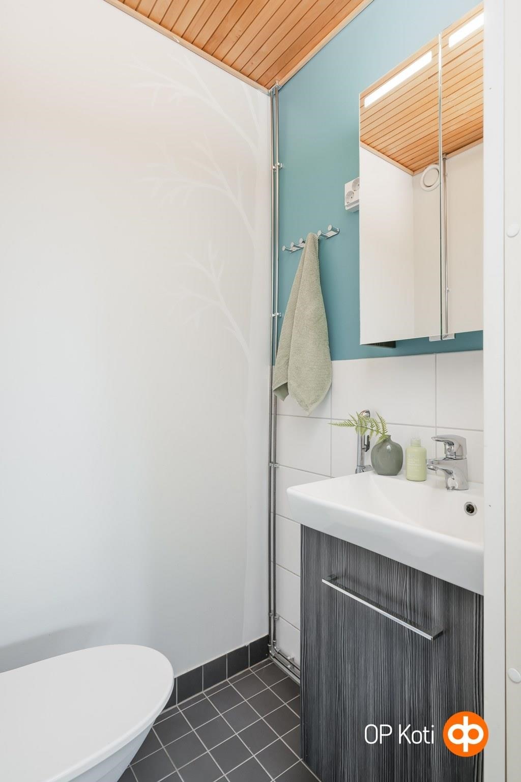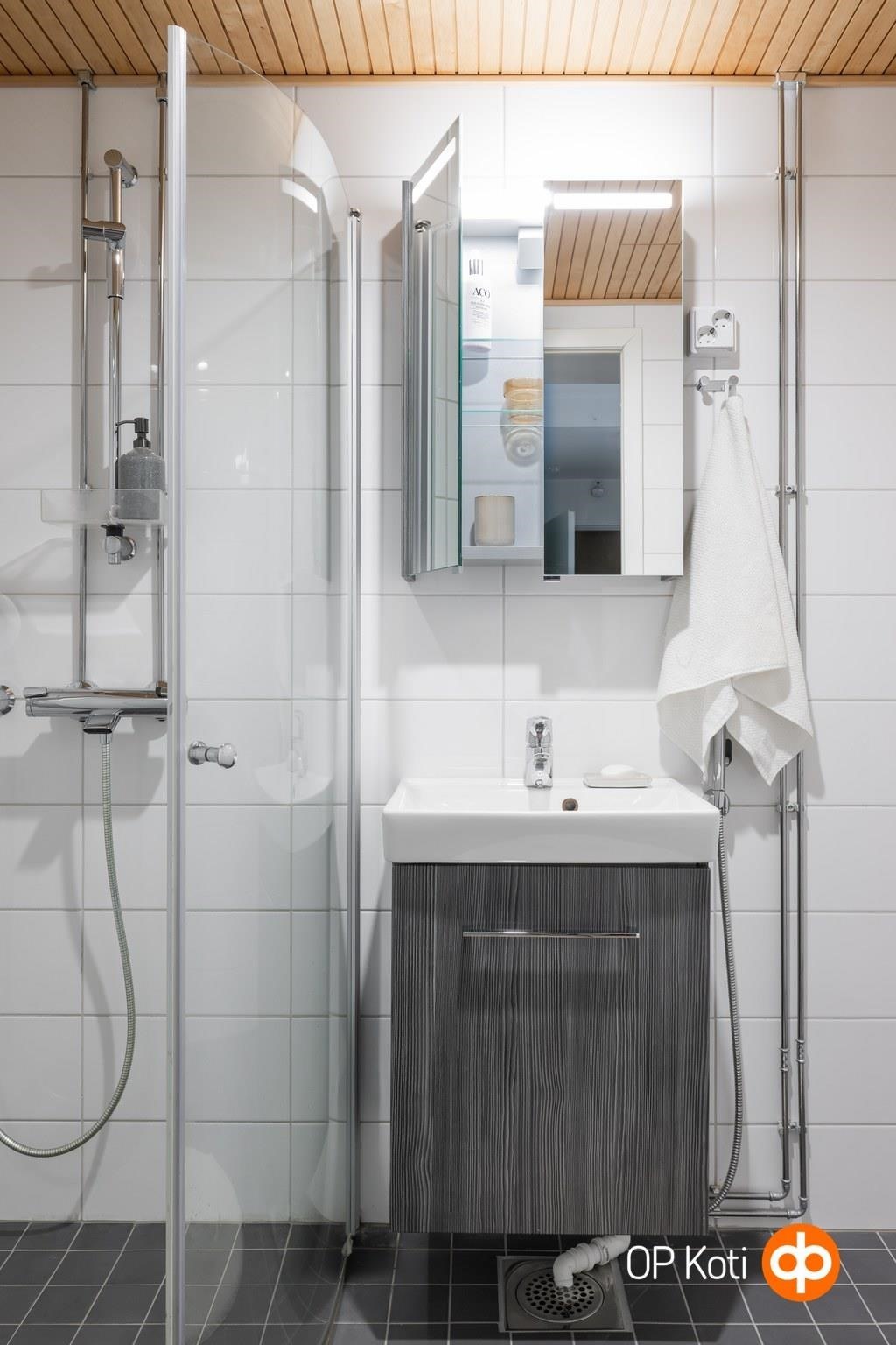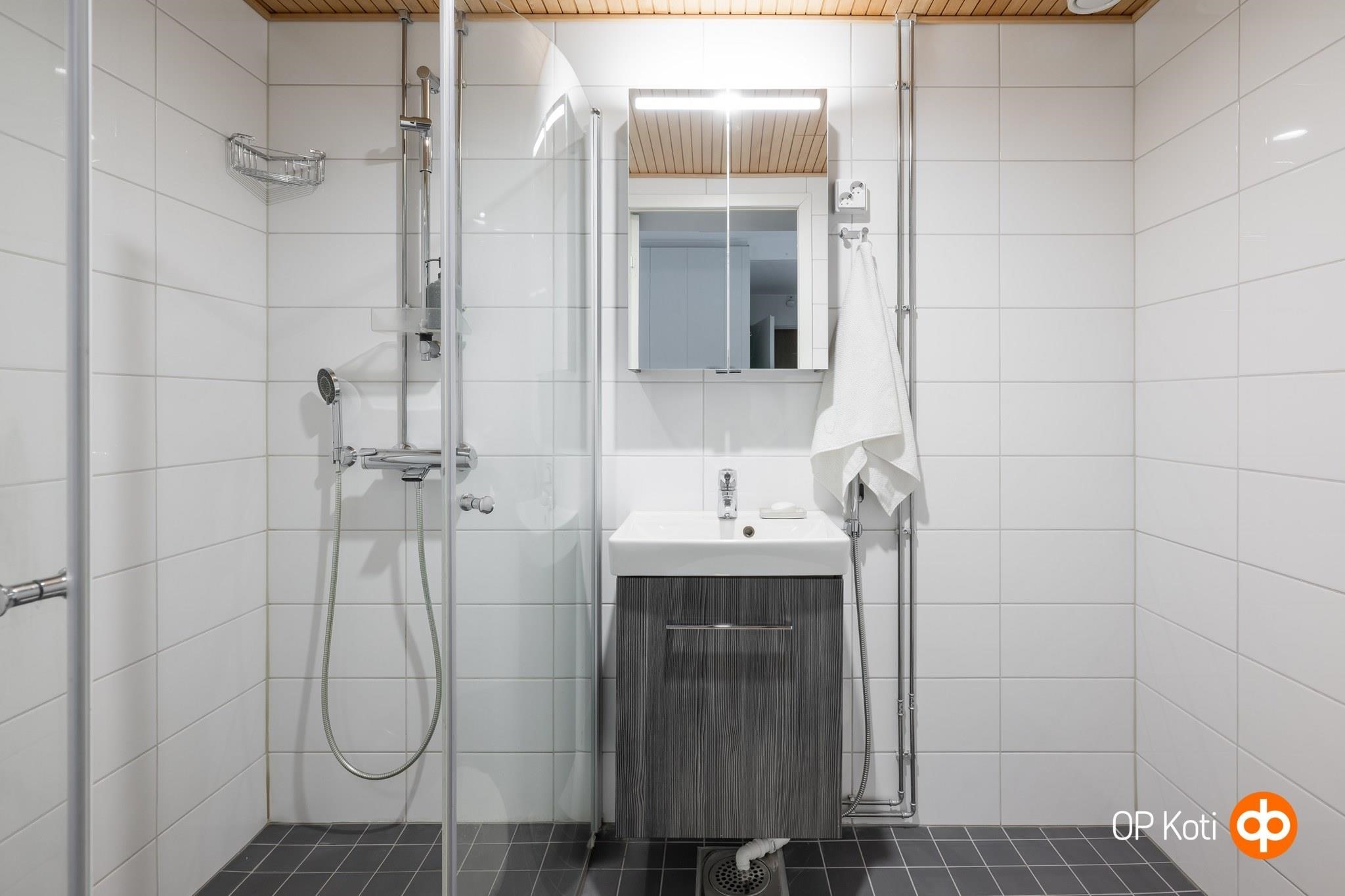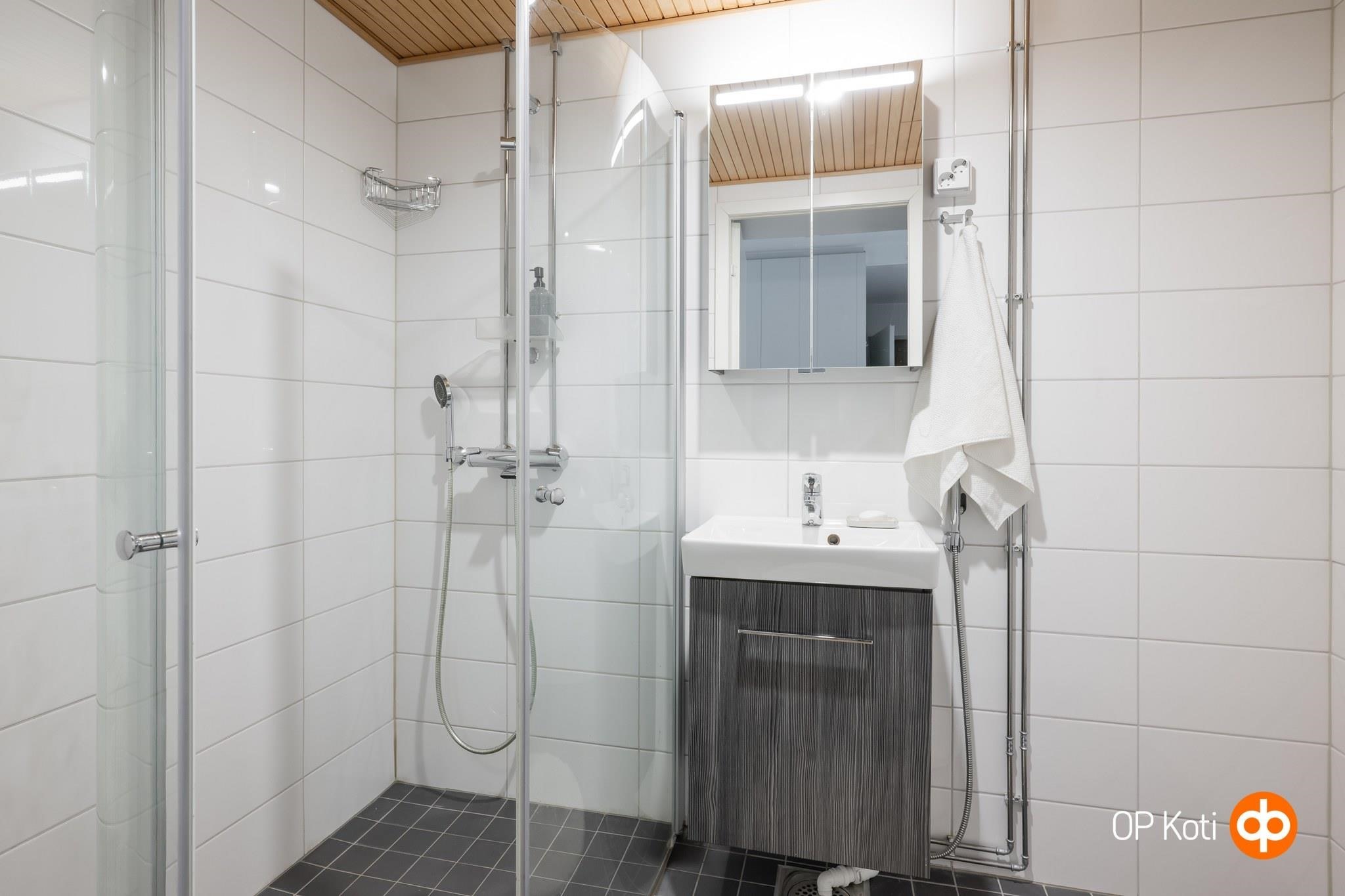 - Kylpyhuone, suihku, 2 kääntyvää suihkuseinää, peilikaappi, allaskaappi, pesukoneliitäntä, kiinteät valaisimet. Erillinen wc, jossa myös peilikaappi ja allaskaappi.