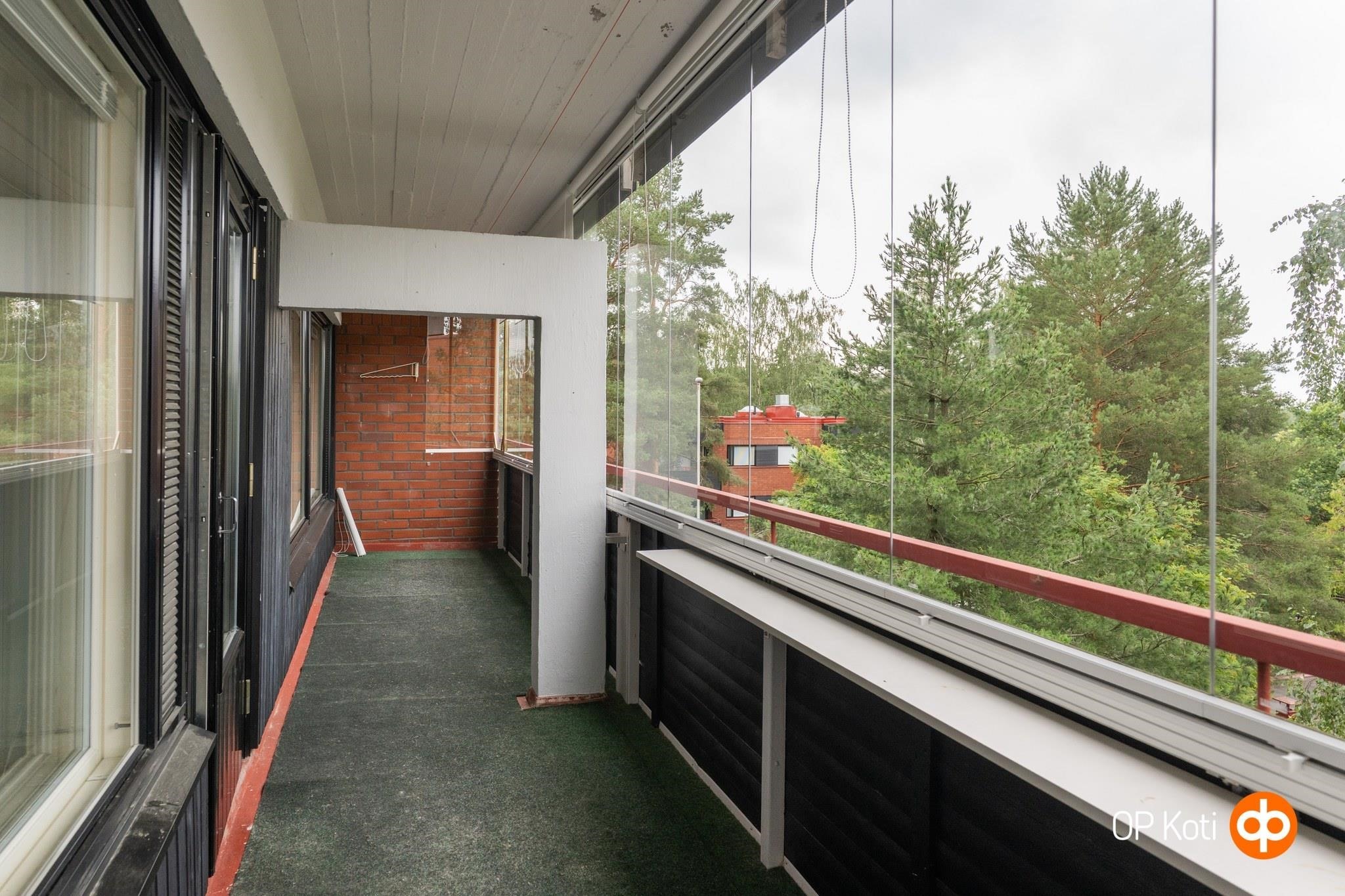 Tämän 5. kerroksen kodin parasta antia ovat avarat tilat ja upea huoneiston levyinen lasitettu parveke kauniine näkymineen. Makuuhuoneita on tällä hetkellä kaksi, mutta niistä toinen on jaettavissa kahdeksi. Yhtiöjärjestyksen mukaan huoneisto onkin 4h+k.