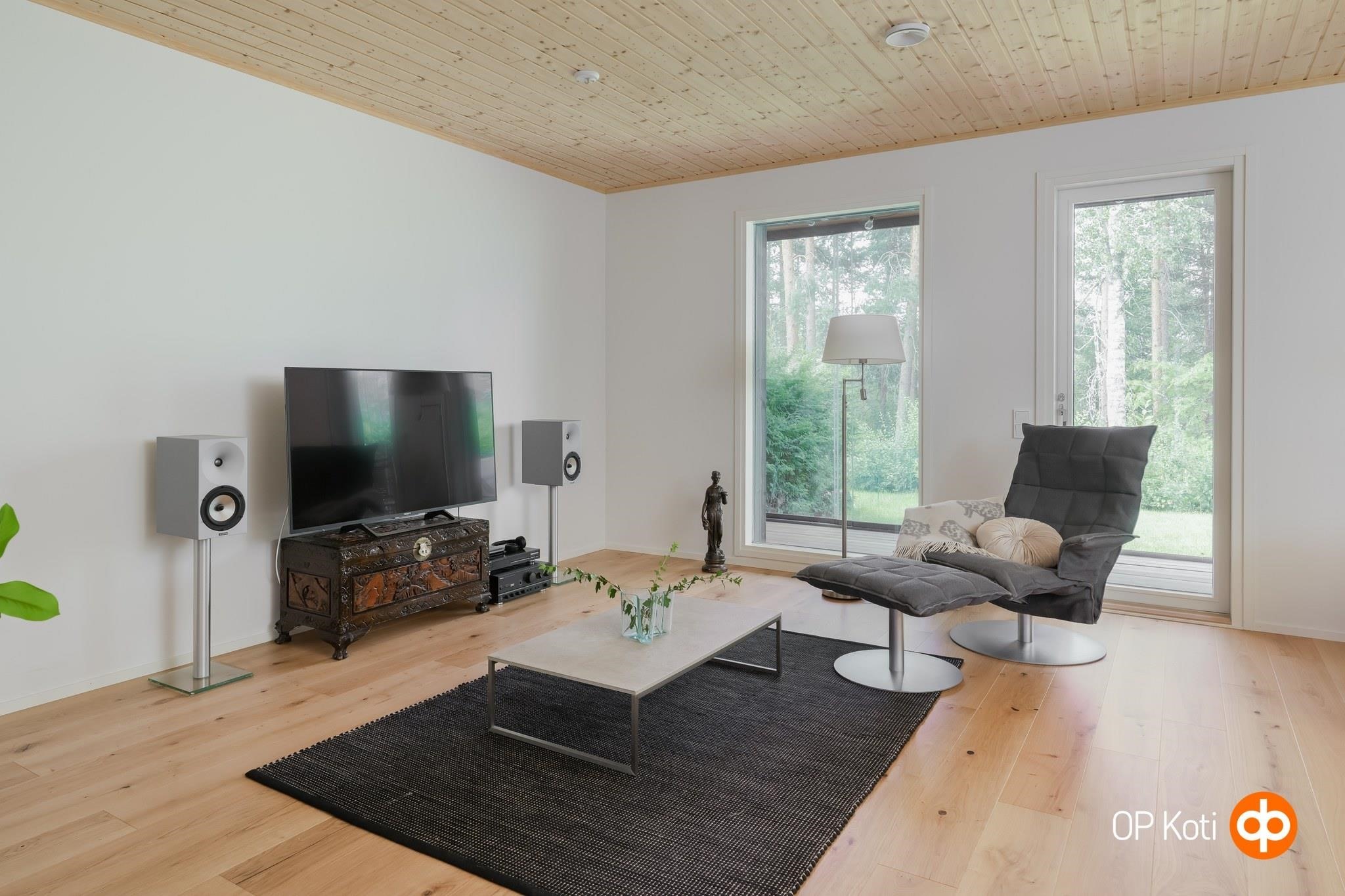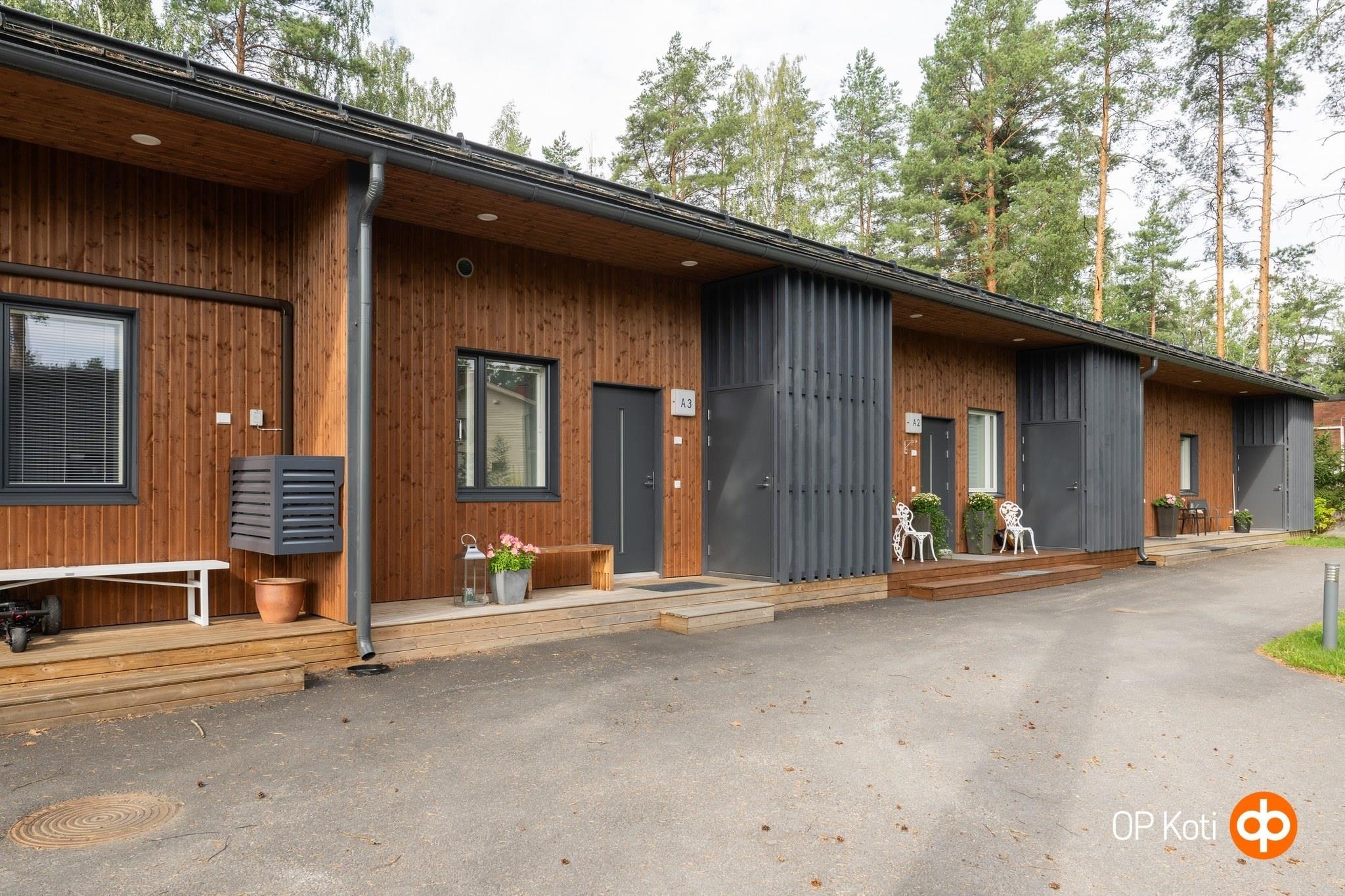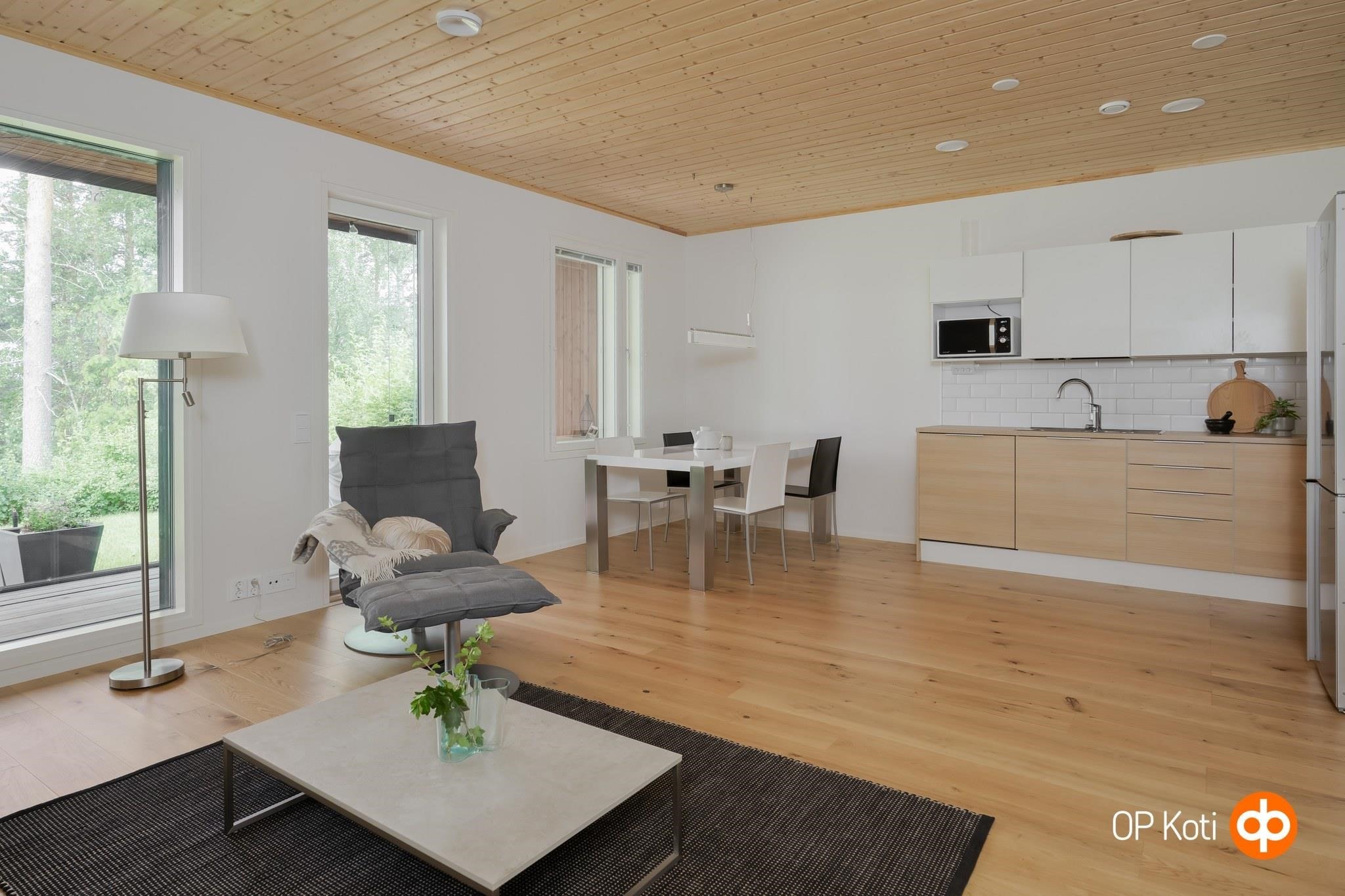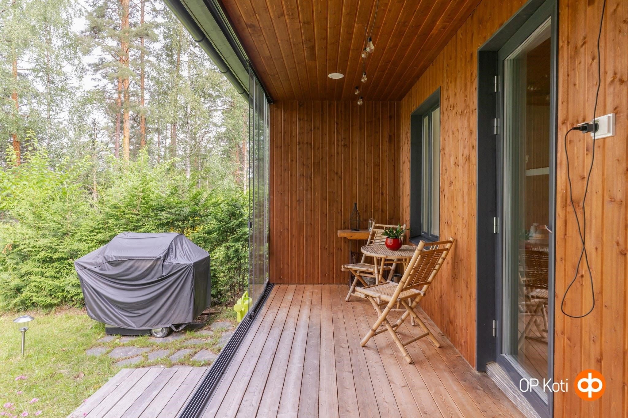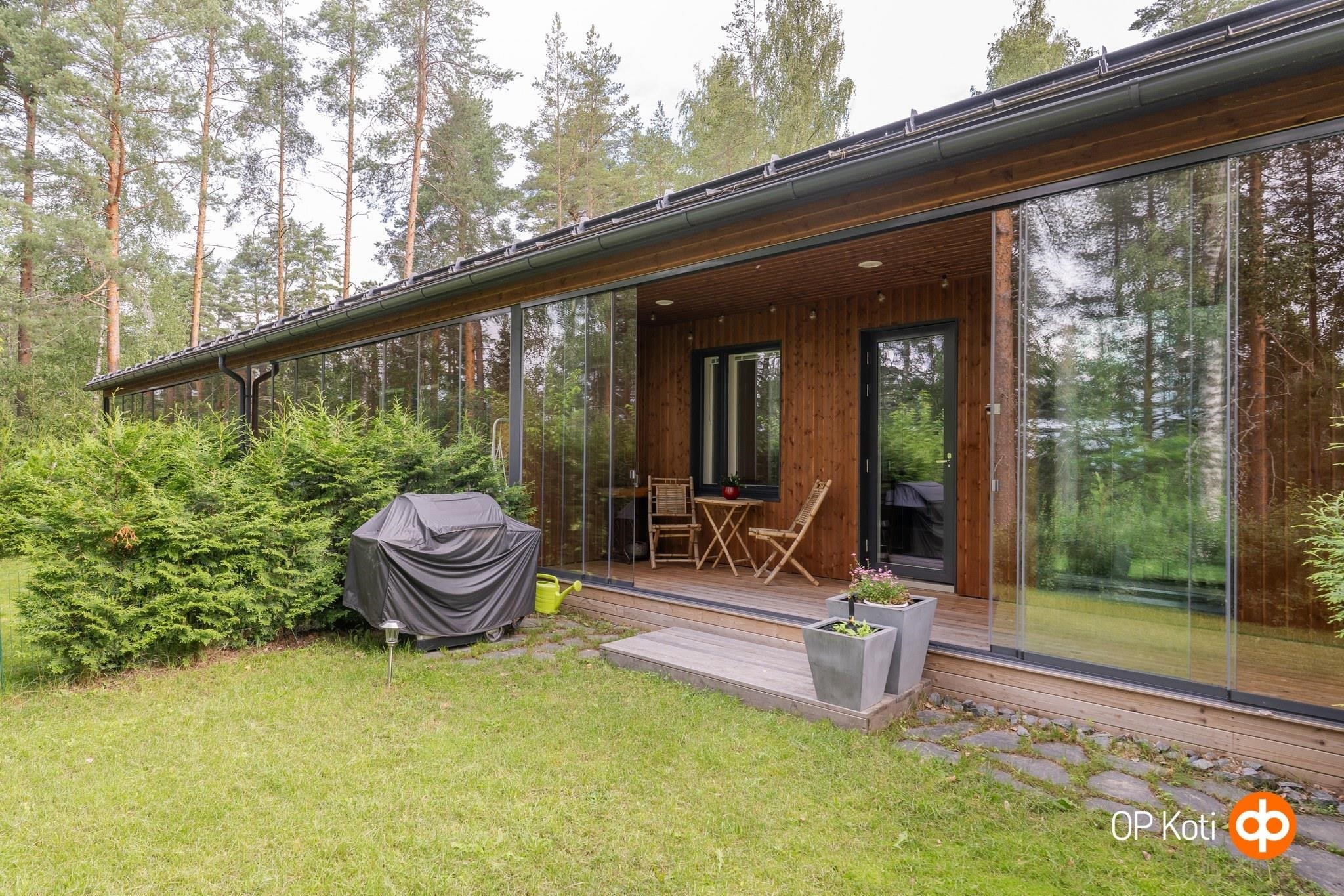 Tämä kaunis ja valoisa kaksio hurmaa sekä tunnelmallaan että laadullaan. Isot ikkunat ja lasitettu terassi tuovat mäntyvaltaisen näkymän osaksi arkea. Kodin sävyt sekä materiaalit sulautuvat ympäröivään maisemaan harmonisesti. Terassin jatkeena oleva piha on valmiina viherpeukalolle oman keitaan luomiseen.