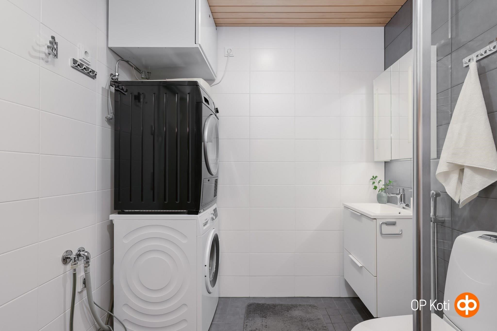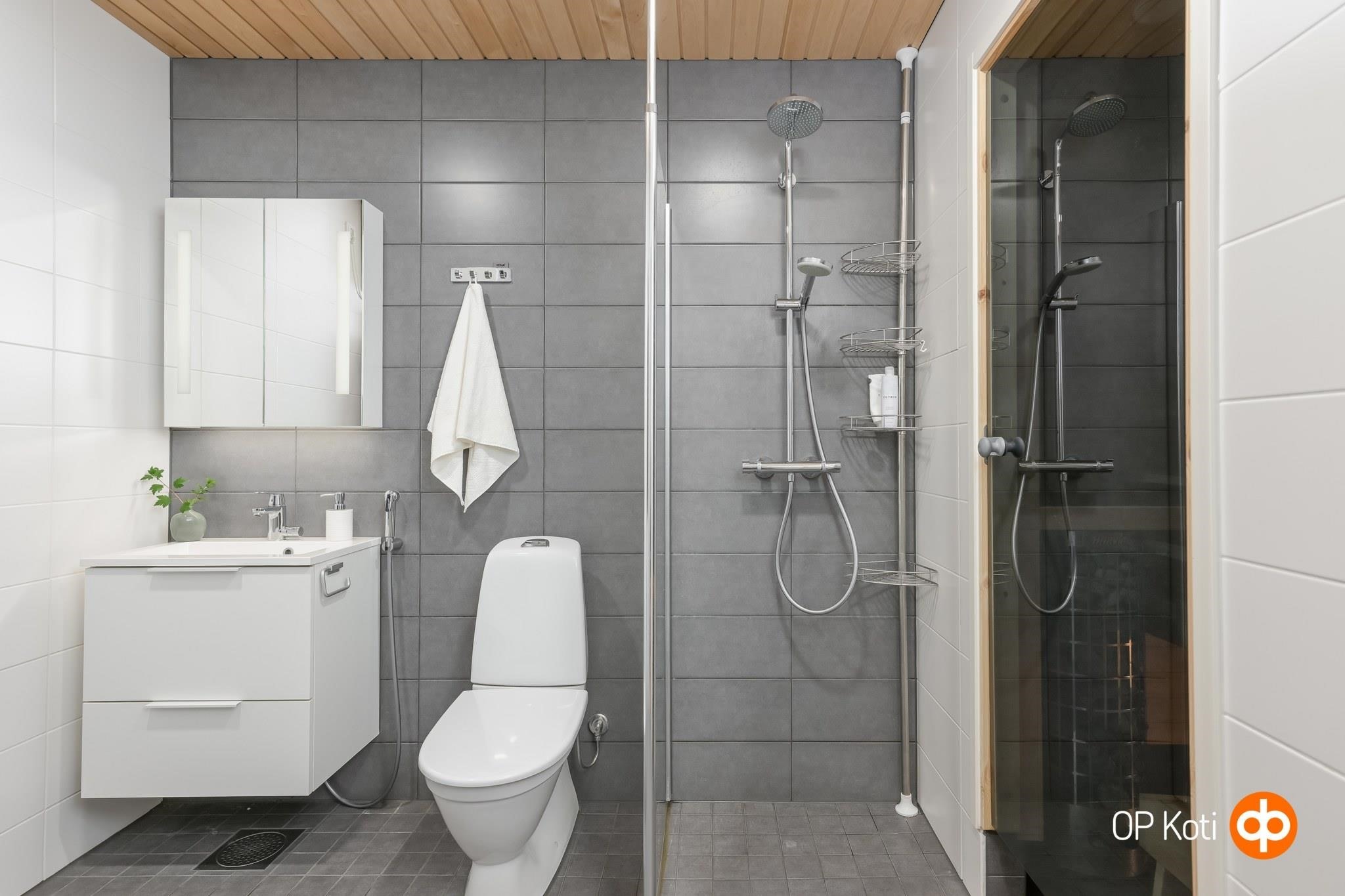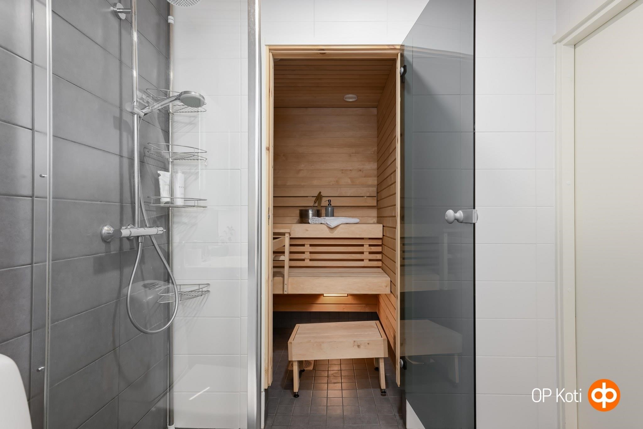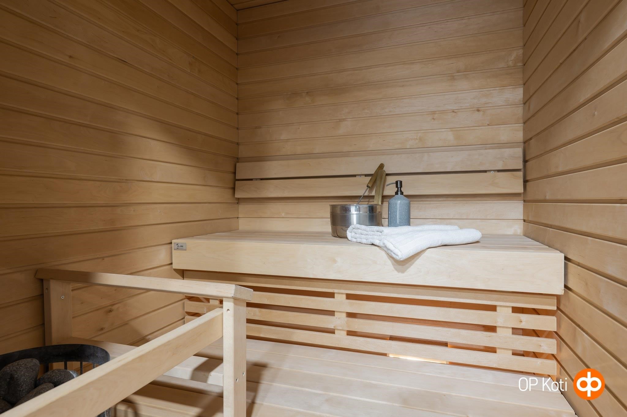 - Sauna, sähkökiuas, kylpyhuone, suihku, suihkuseinä, peilikaappi valopeili, allaskaappi, pesukoneliitäntä, lattialämmitys, kiinteät valaisimet. Saunan lauteet tervaleppää, sähkökiuas Harvia Cilindro.