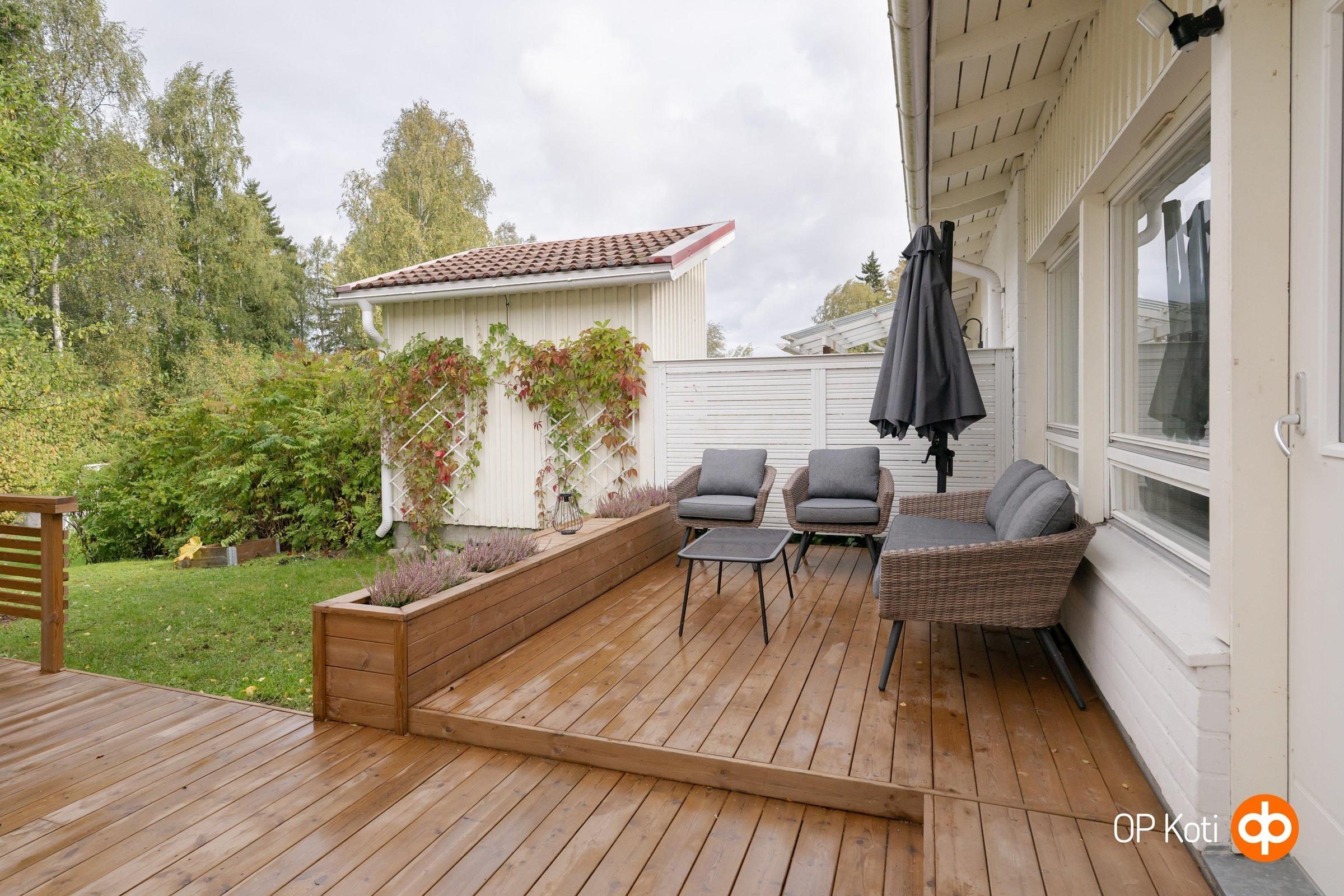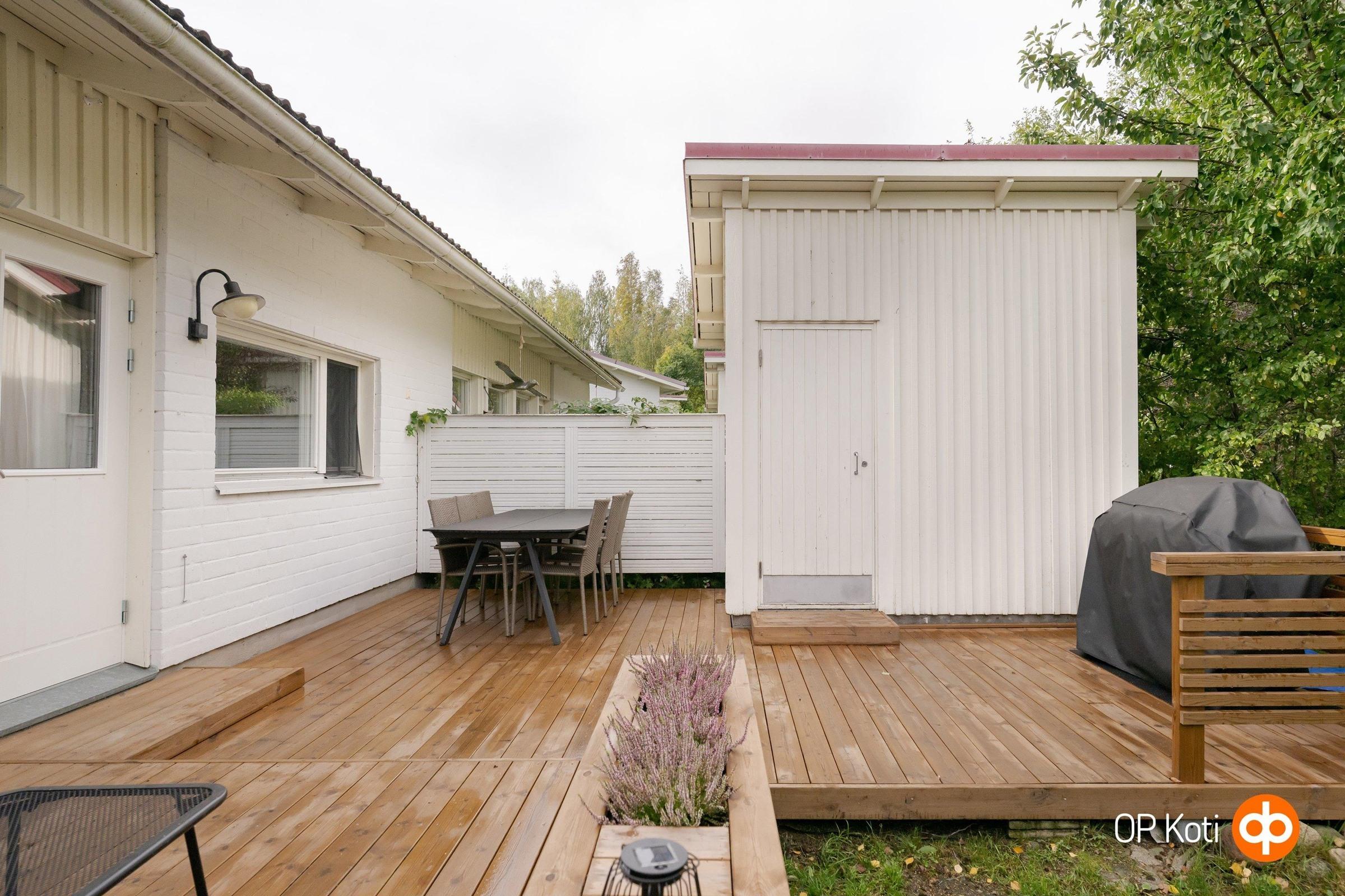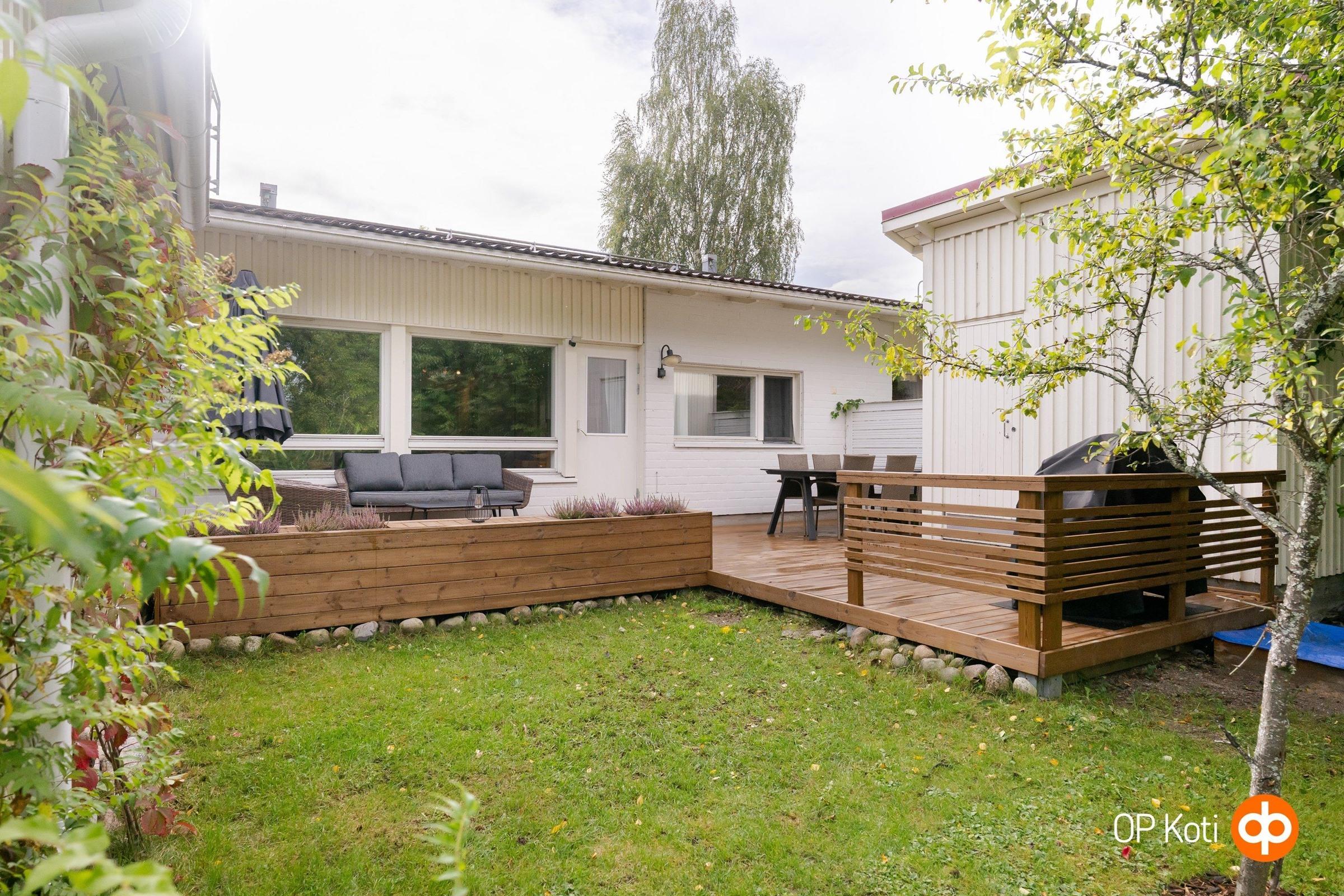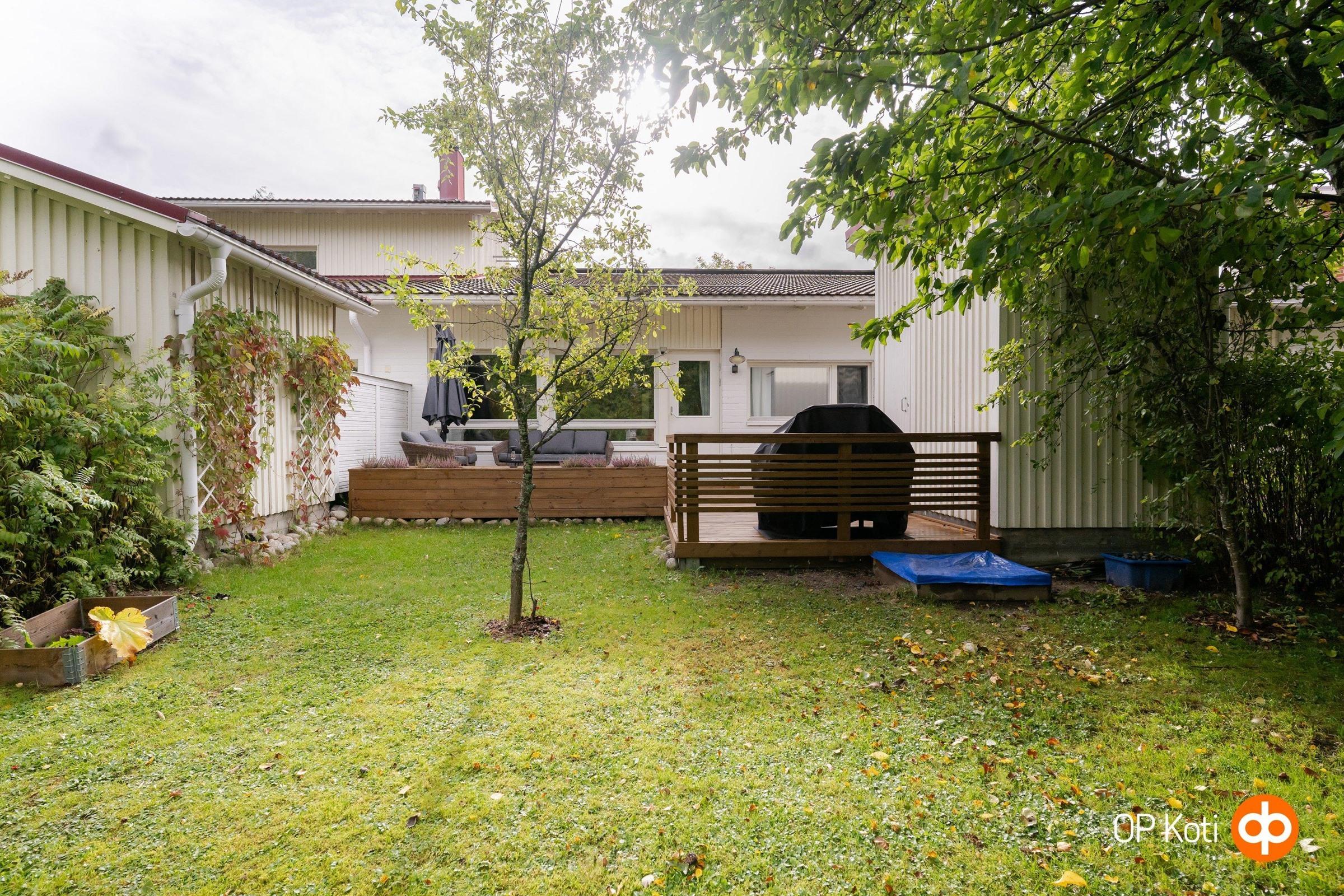 Mutta tämän kodin sielu löytyy pihalta. Iso terassi kutsuu kokoamaan ystävät grillin ääreen tai istahtamaan kahvikupin kanssa aamuaurinkoon. Omenapuu ja luumupuut luovat tunnelmaa, ja taustalla avautuu rauhallinen puistoalue. On kuin oma piha jatkuisi luontoon. Ja silti rantaraitille kipaiset lähes suoraan kotipihasta.