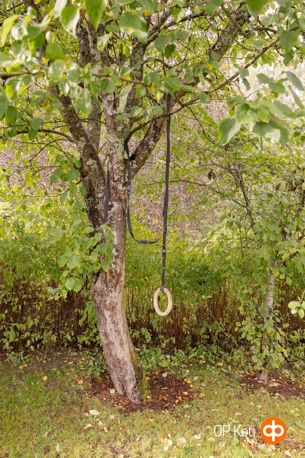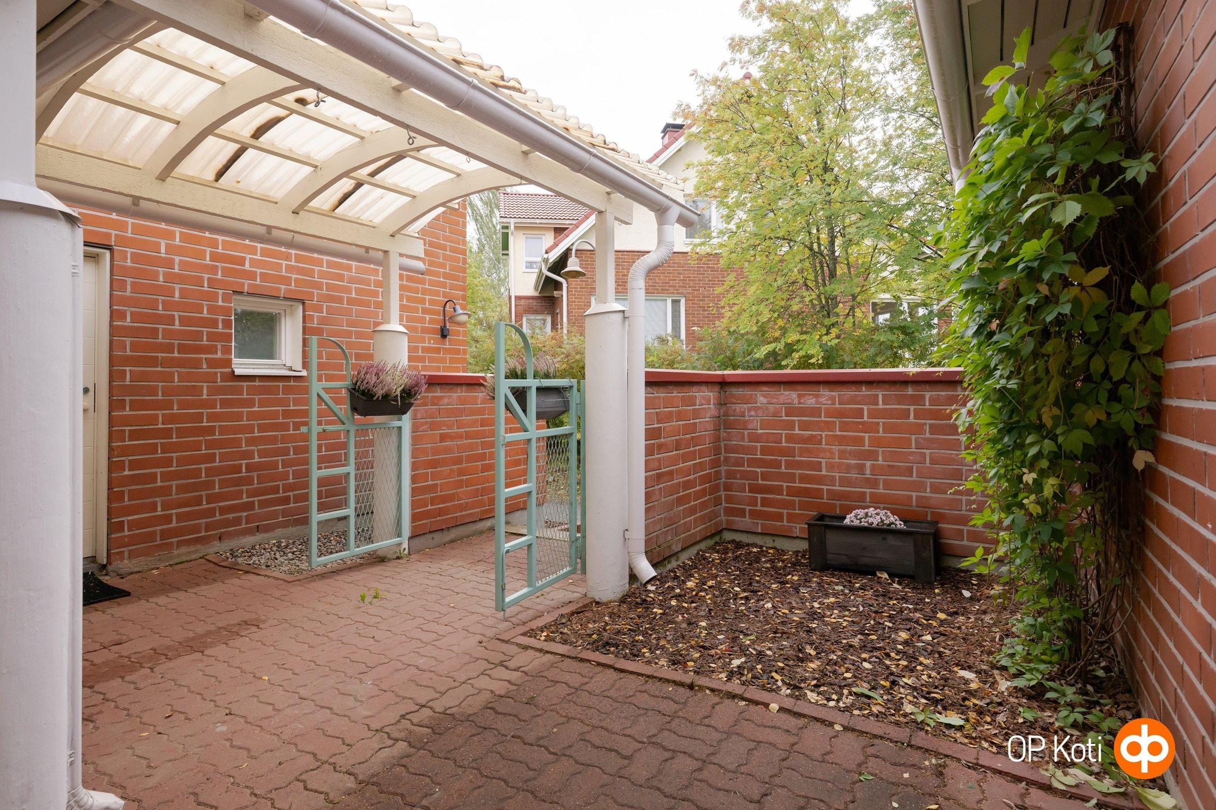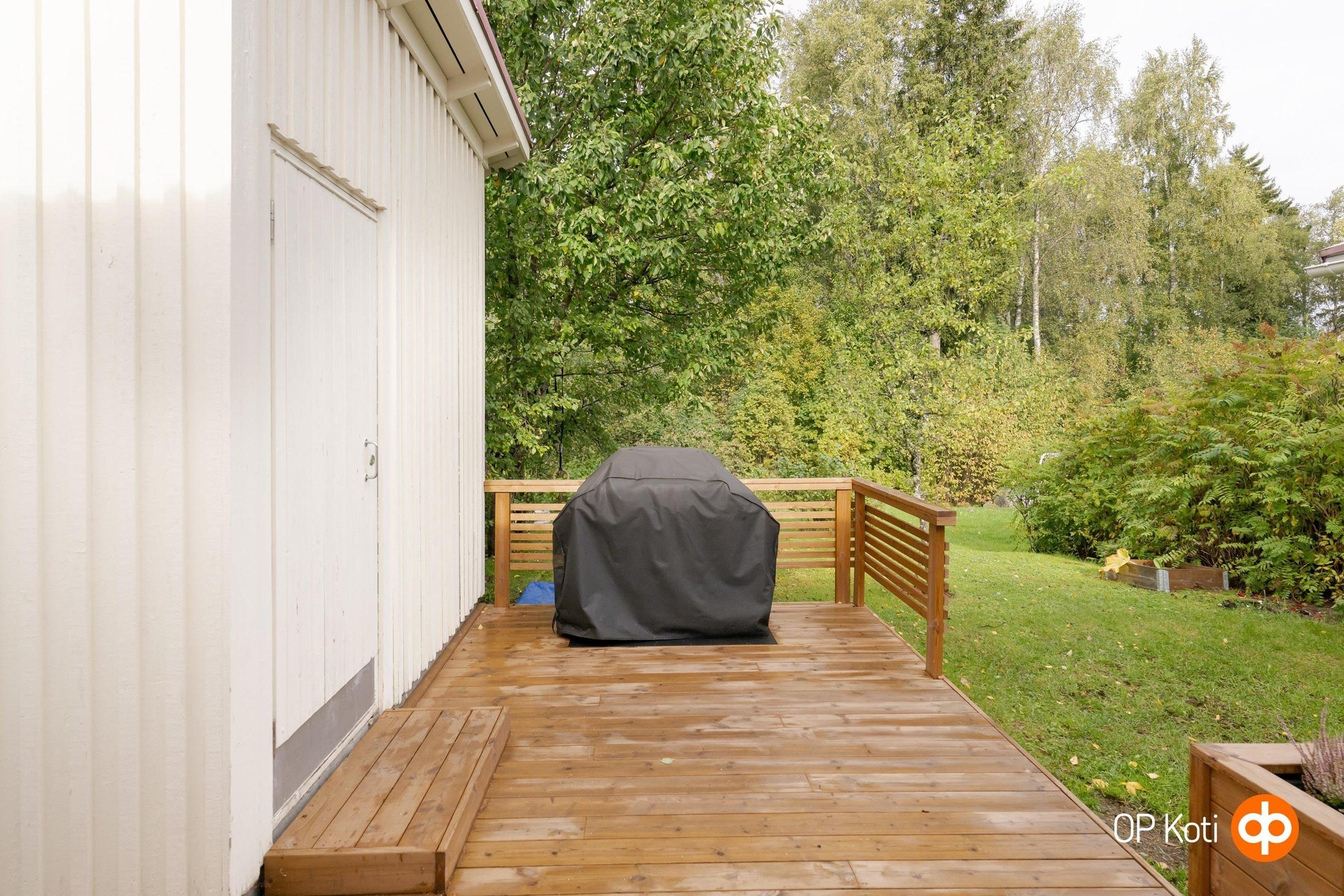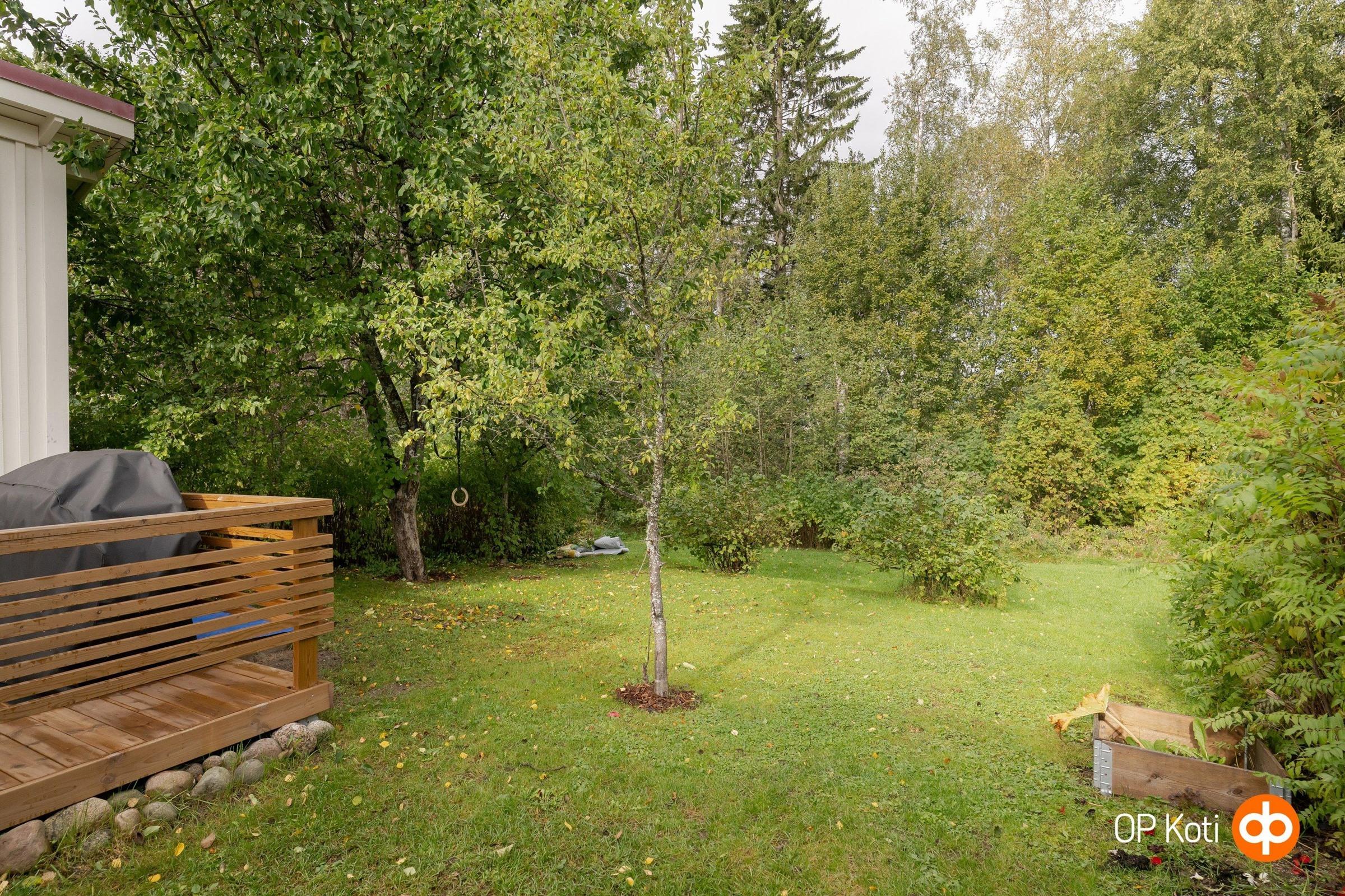Mutta tämän kodin sielu löytyy pihalta. Iso terassi kutsuu kokoamaan ystävät grillin ääreen tai istahtamaan kahvikupin kanssa aamuaurinkoon. Omenapuu ja luumupuut luovat tunnelmaa, ja taustalla avautuu rauhallinen puistoalue. On kuin oma piha jatkuisi luontoon. Ja silti rantaraitille kipaiset lähes suoraan kotipihasta.