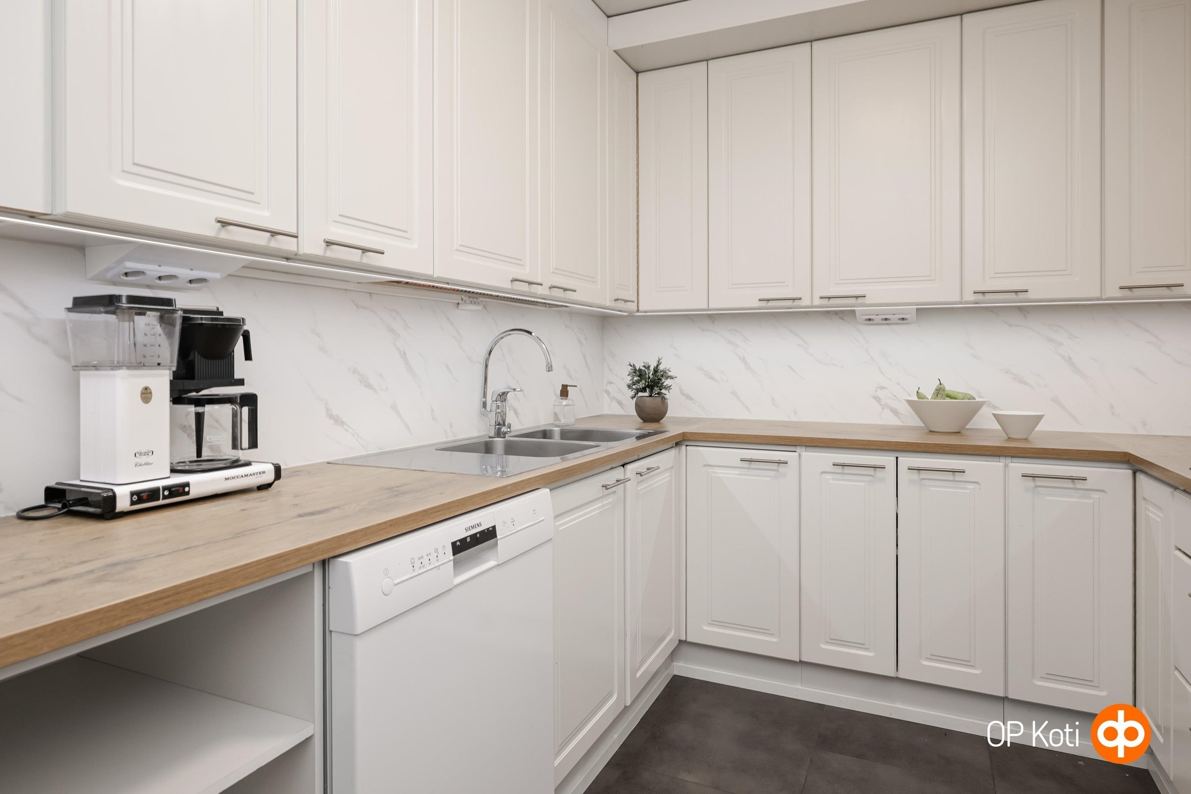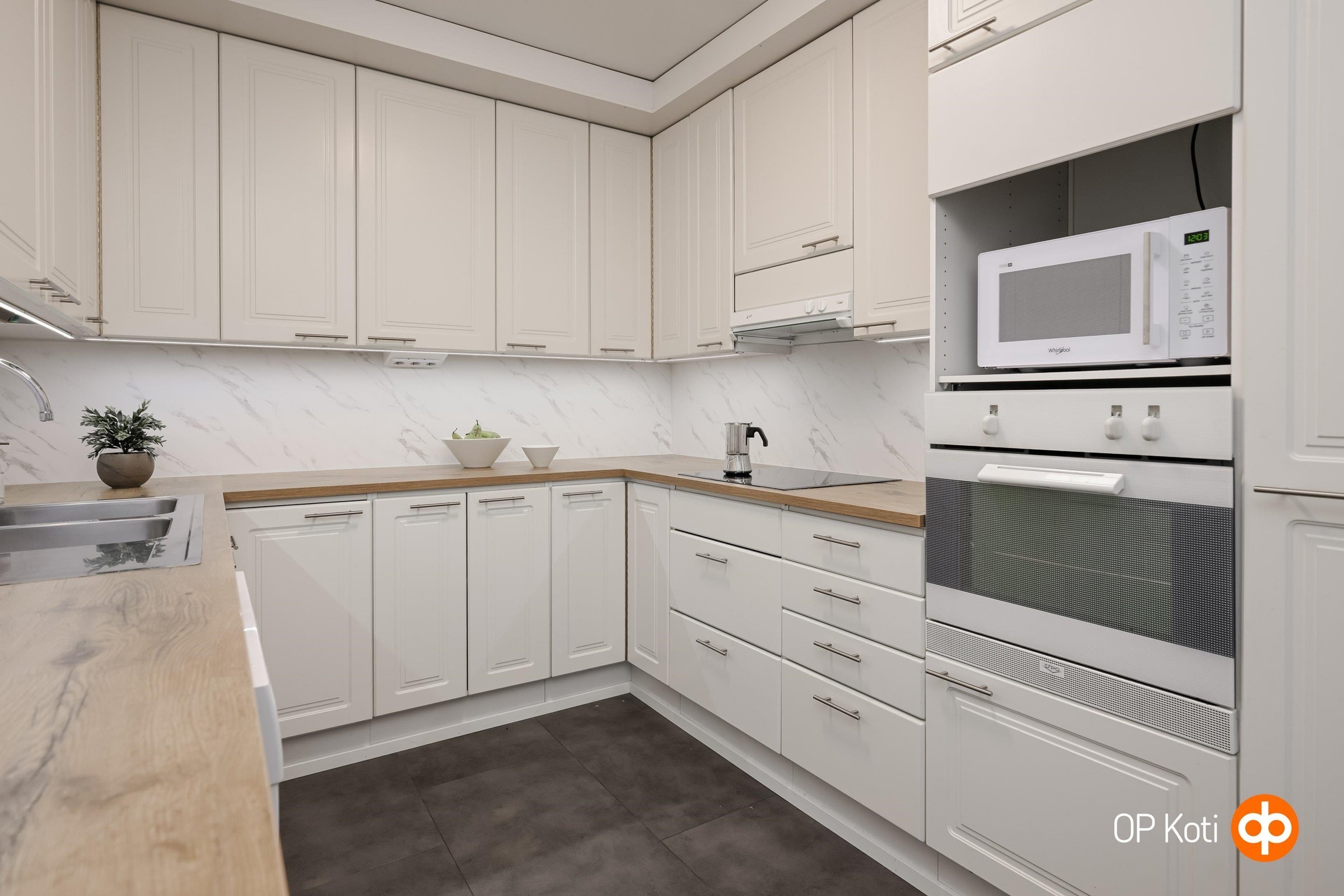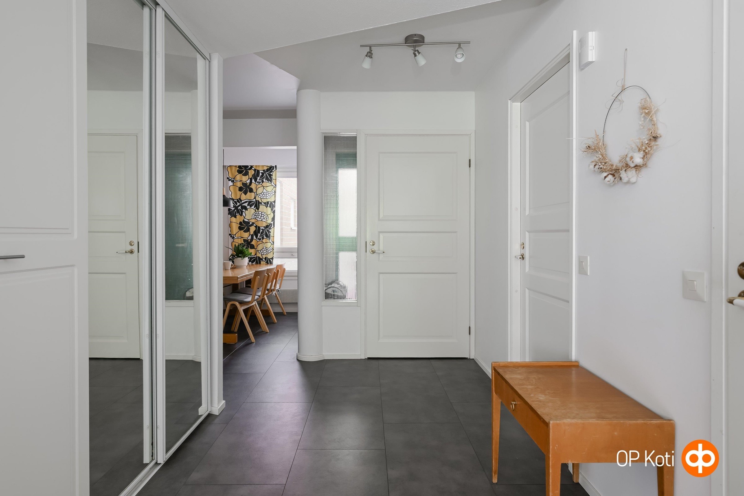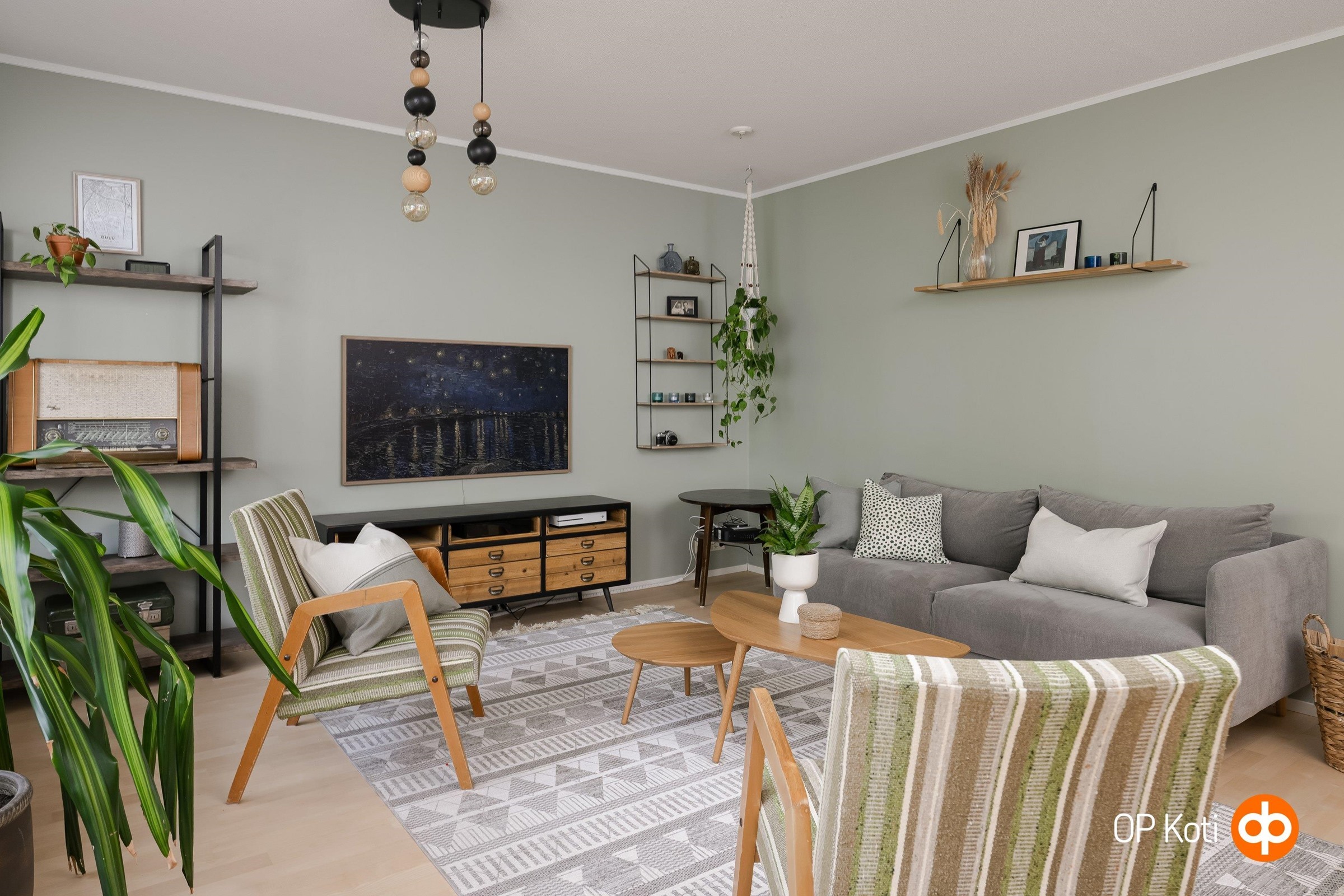 Sisällä sinua odottaa harvinaisen avara kolmio. 90,5 m² tuo reilusti väljyyttä: kaksi tilavaa makuuhuonetta, suuri olohuone ja toimiva pohjaratkaisu hurmaavat. Hyvät säilytystilat, kaksi wc:tä, remontoitu kodinhoitohuone ja saunaosasto tekevät arjesta mutkatonta. Keittiön vinyylikorkki lattialämmityksellä on mukava jalalle ja juuri hiotut parkettilattiat ovat kauniin vaaleat. Kodissa on siistit pinnat ja värit on valittu huolella. Kokonaisuus on levollinen ja tyylikäs.