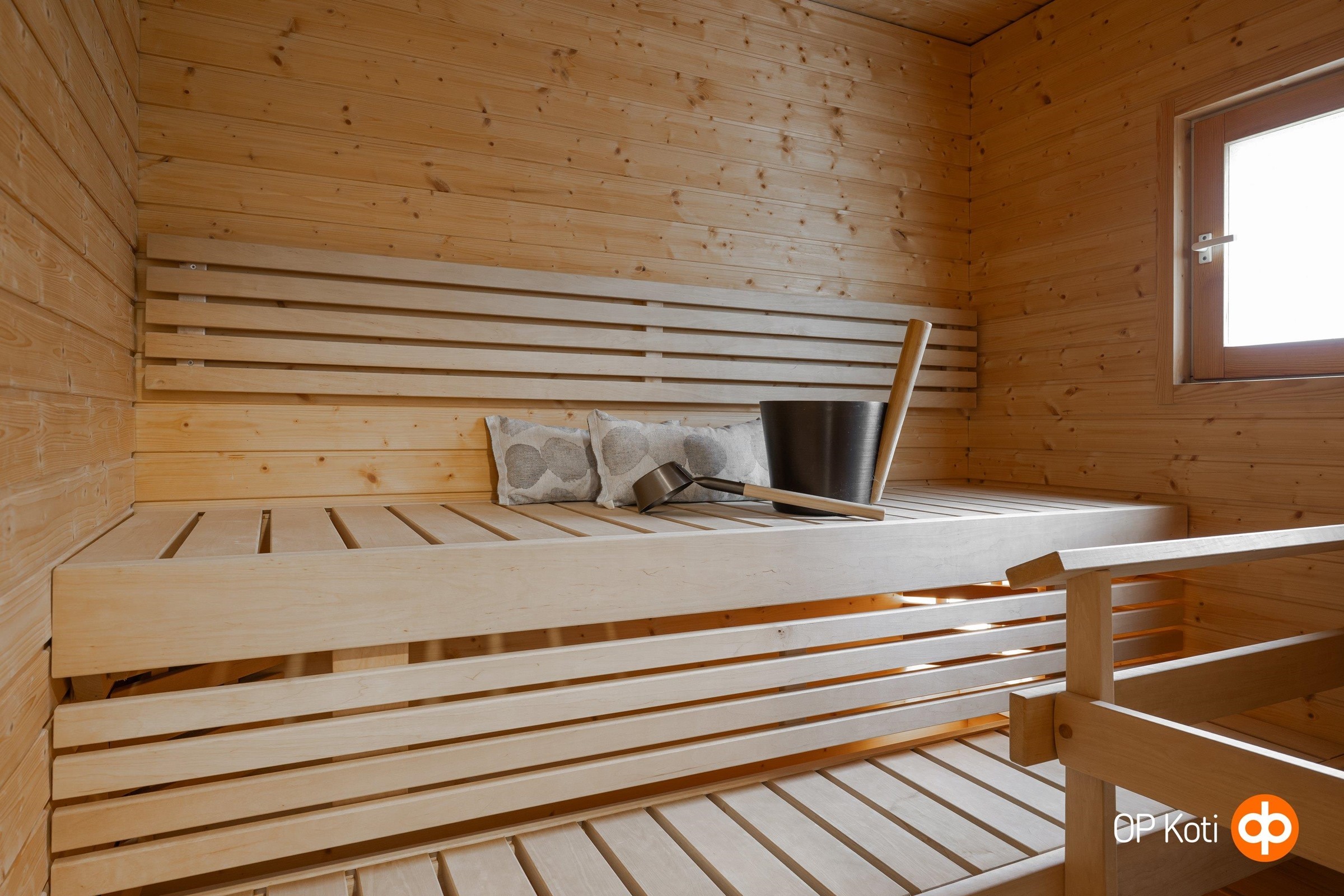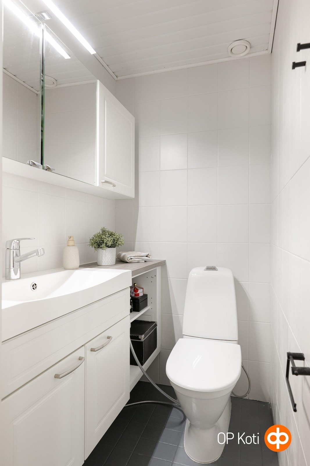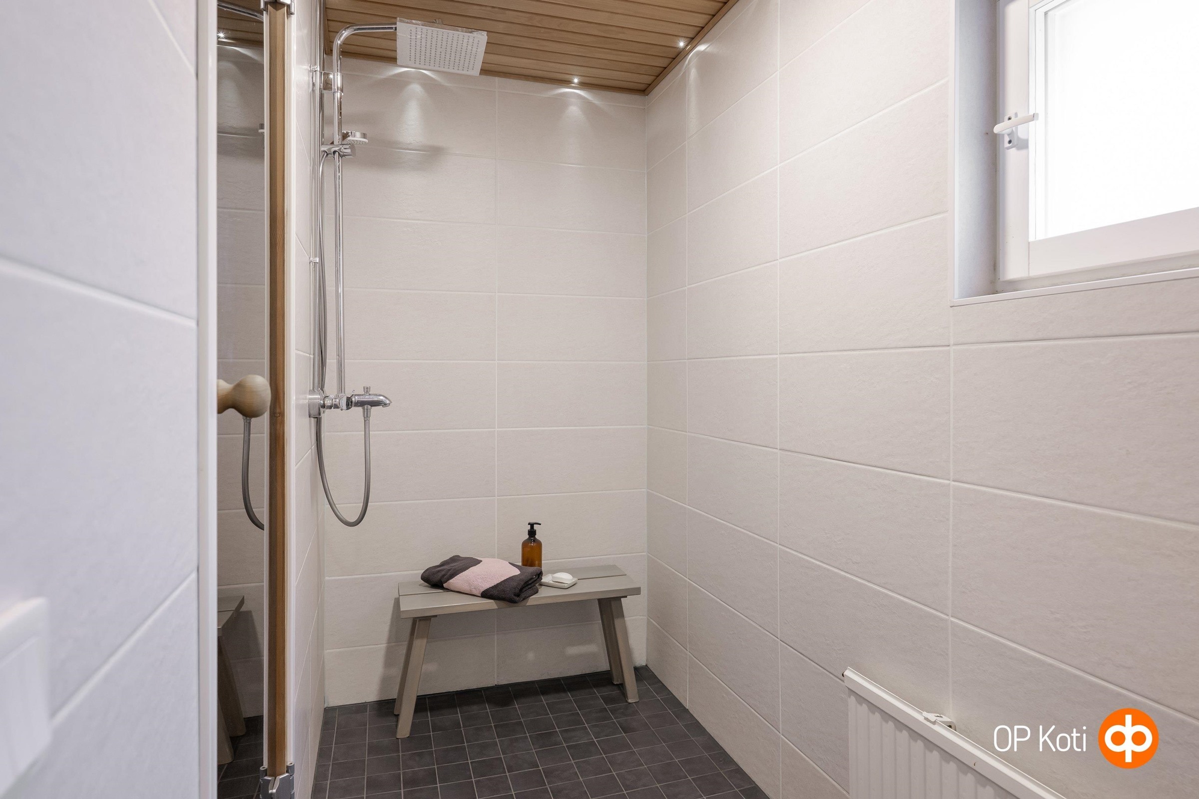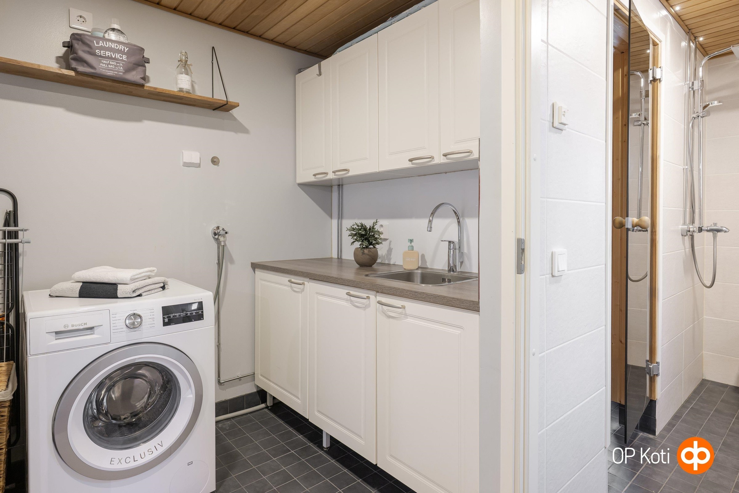 - Sauna, sähkökiuas, kylpyhuone, suihku. Kodinhoitohuone, jossa pesukoneliitäntä, kaapistot, allas ja hana. Khh:n viereisessä wc:ssä peilikaappi, allaskaappi ja seinäkaappi. Eteisaulan wc:ssä peilikaappi, allaskaappi. Tiloissa sähköinen lattialämmitys (ei eteisaulan wc:ssä).