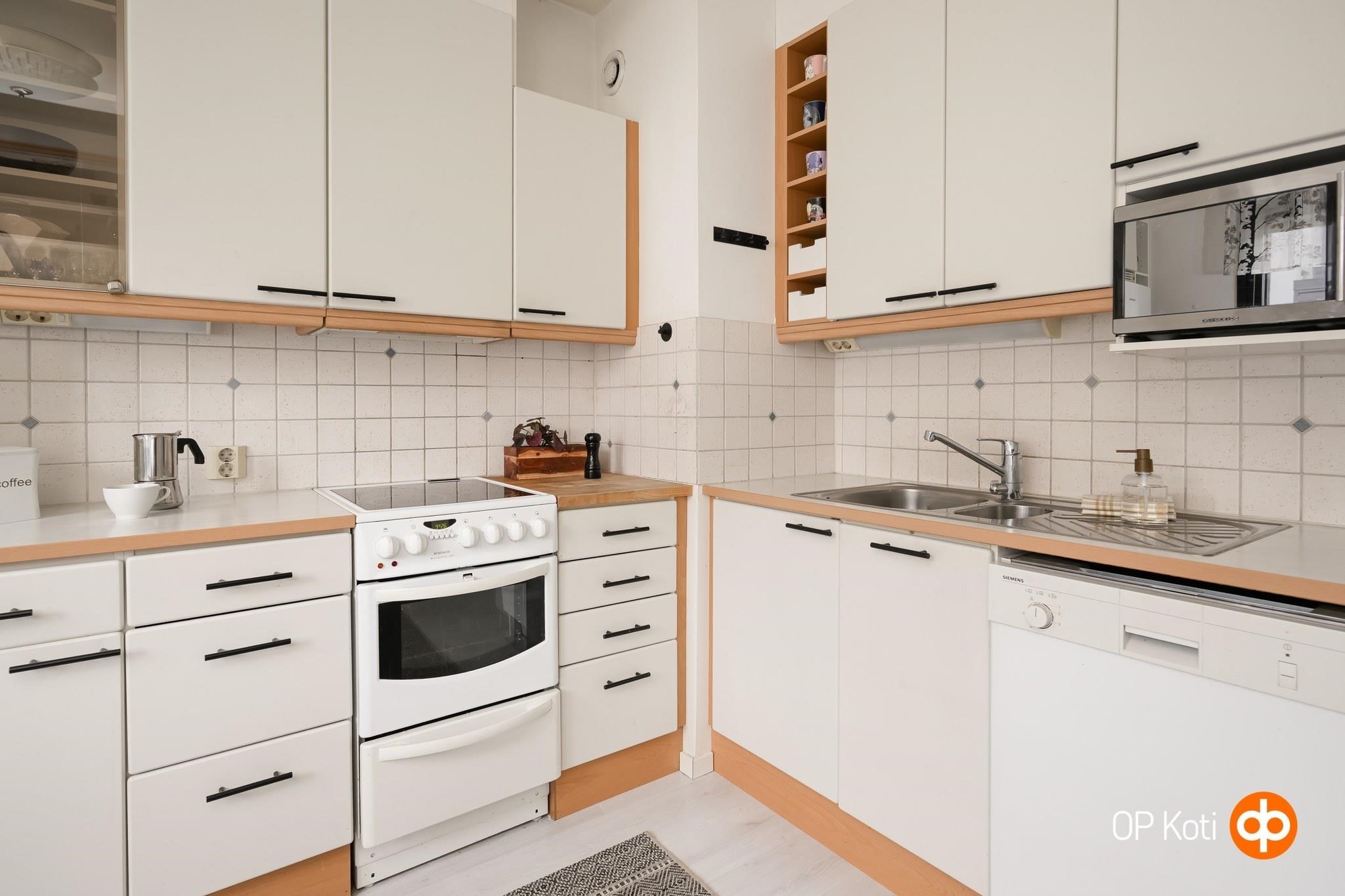 - Jääkaappipakastin, keraaminen liesi, astianpesukone, kiinteät valaisimet. Kaapiston ovet maalattu.
