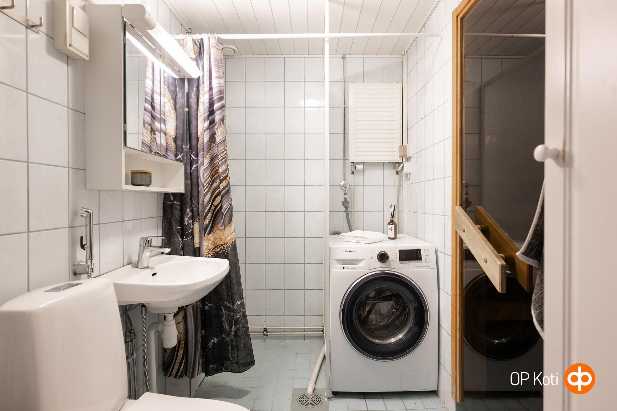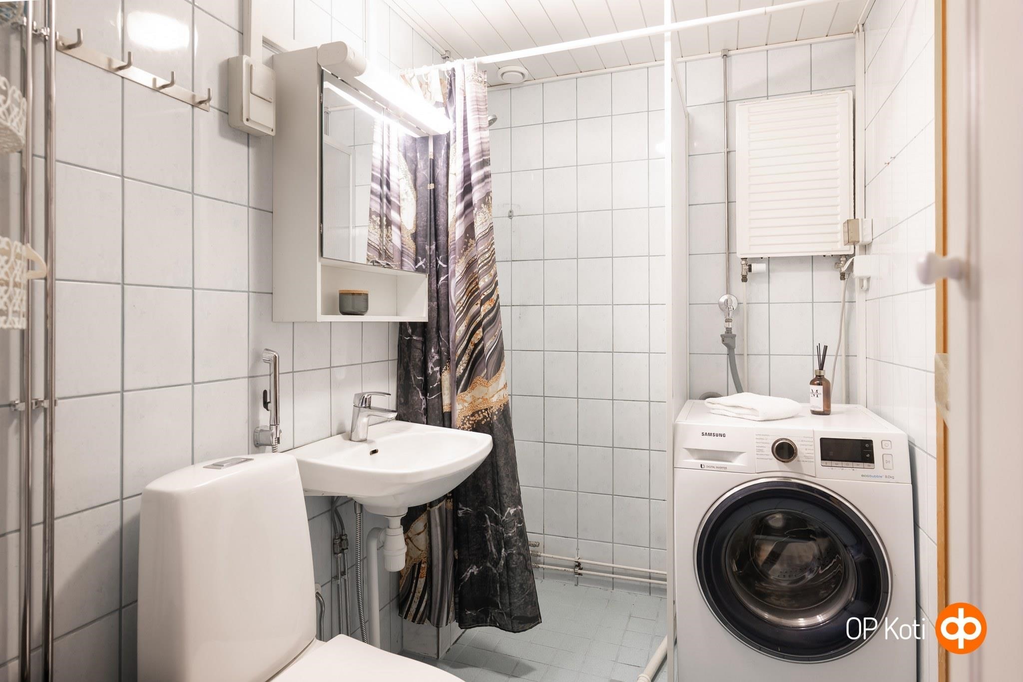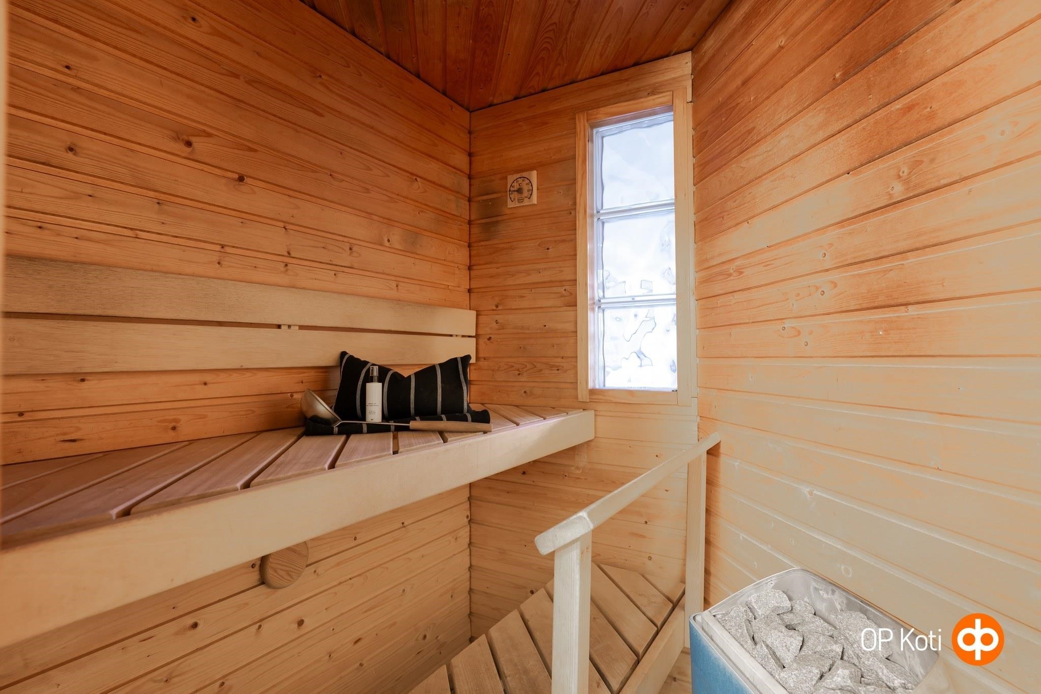 - Sauna, sähkökiuas, kylpyhuone, suihku, suihkuseinä, peilikaappi, pesukoneliitäntä, kiinteät valaisimet. Lattialämmitys saunassa.