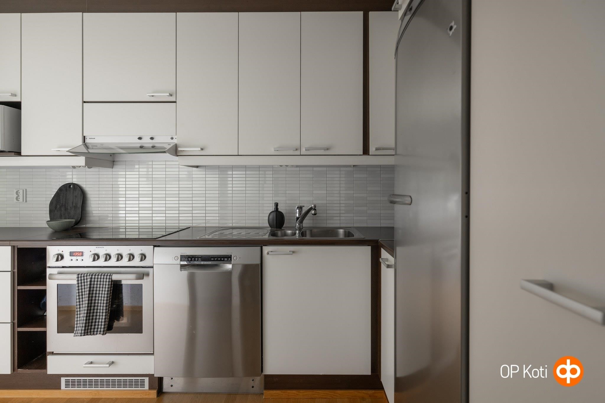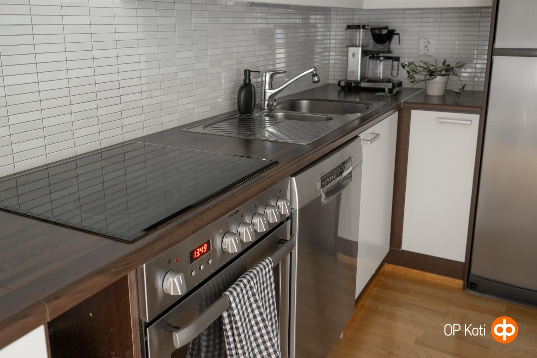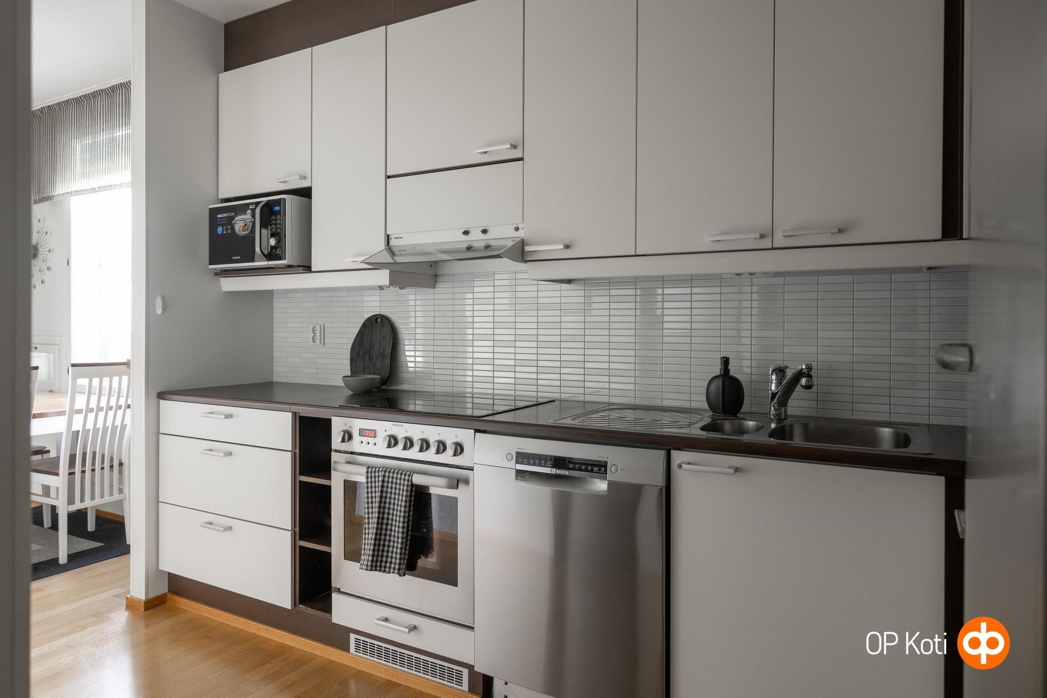 - Jääkaappi, pakastekaappi, erillisuuni, liesitaso, liesituuletin, astianpesukone, kaapistot, kiinteät valaisimet.