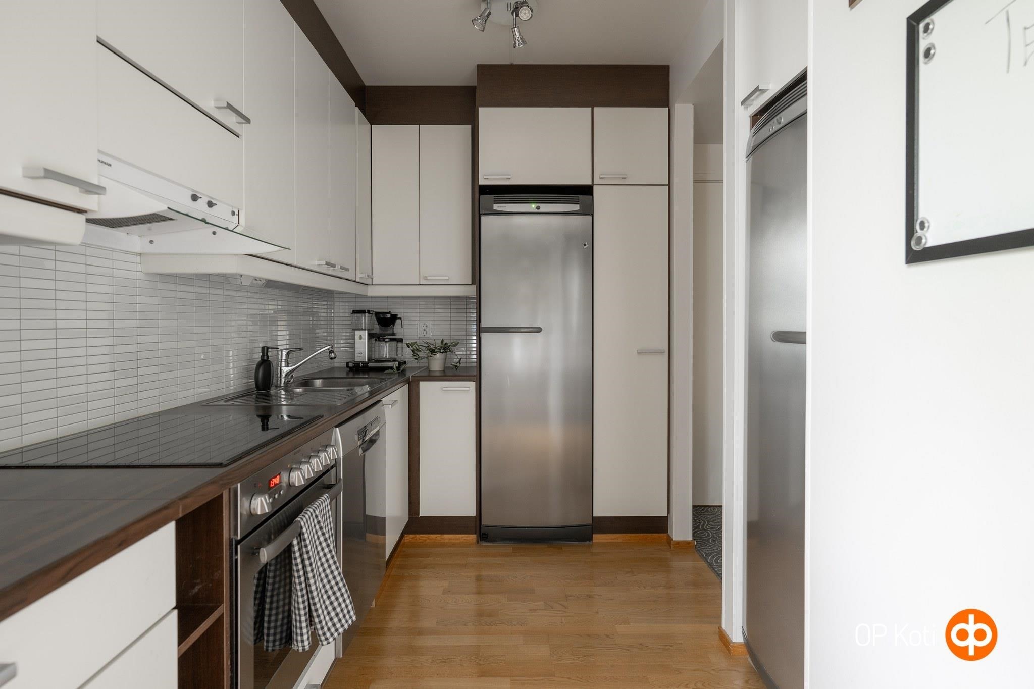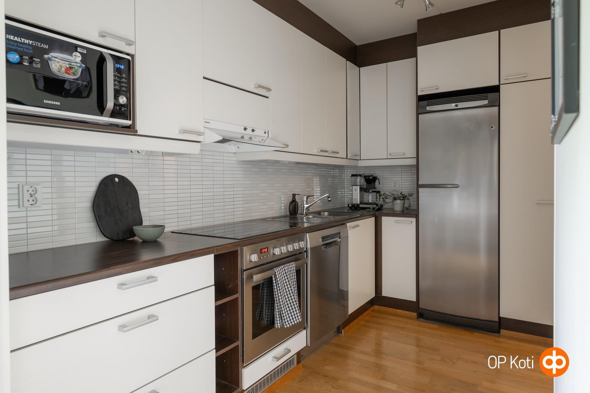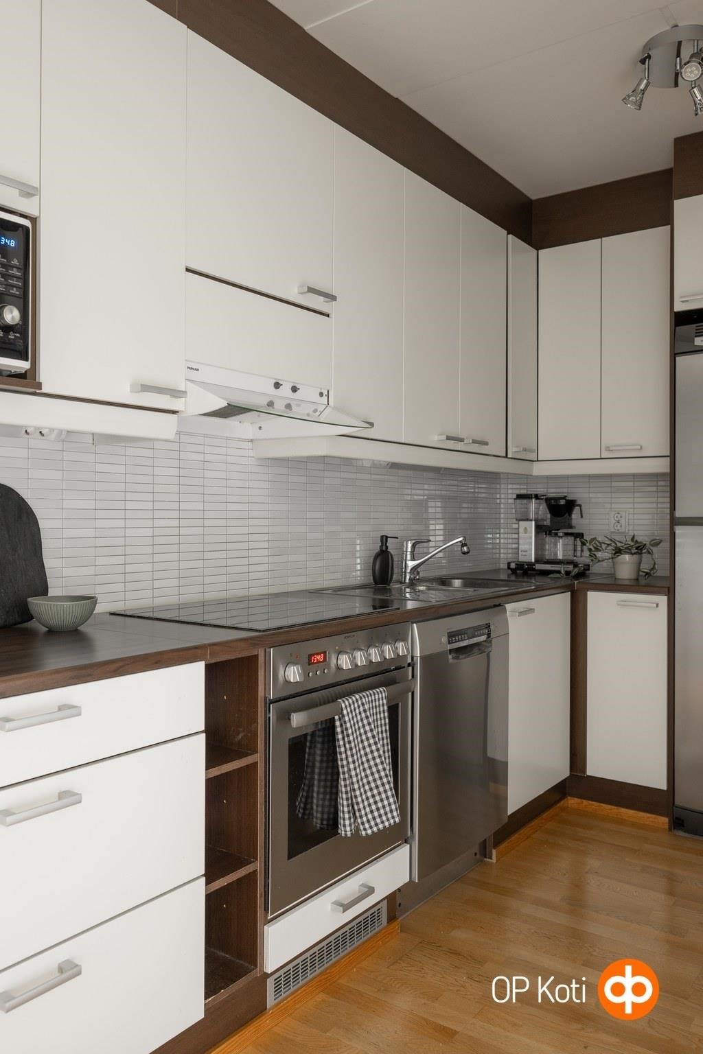 - Jääkaappi, pakastekaappi, erillisuuni, liesitaso, liesituuletin, astianpesukone, kaapistot, kiinteät valaisimet.