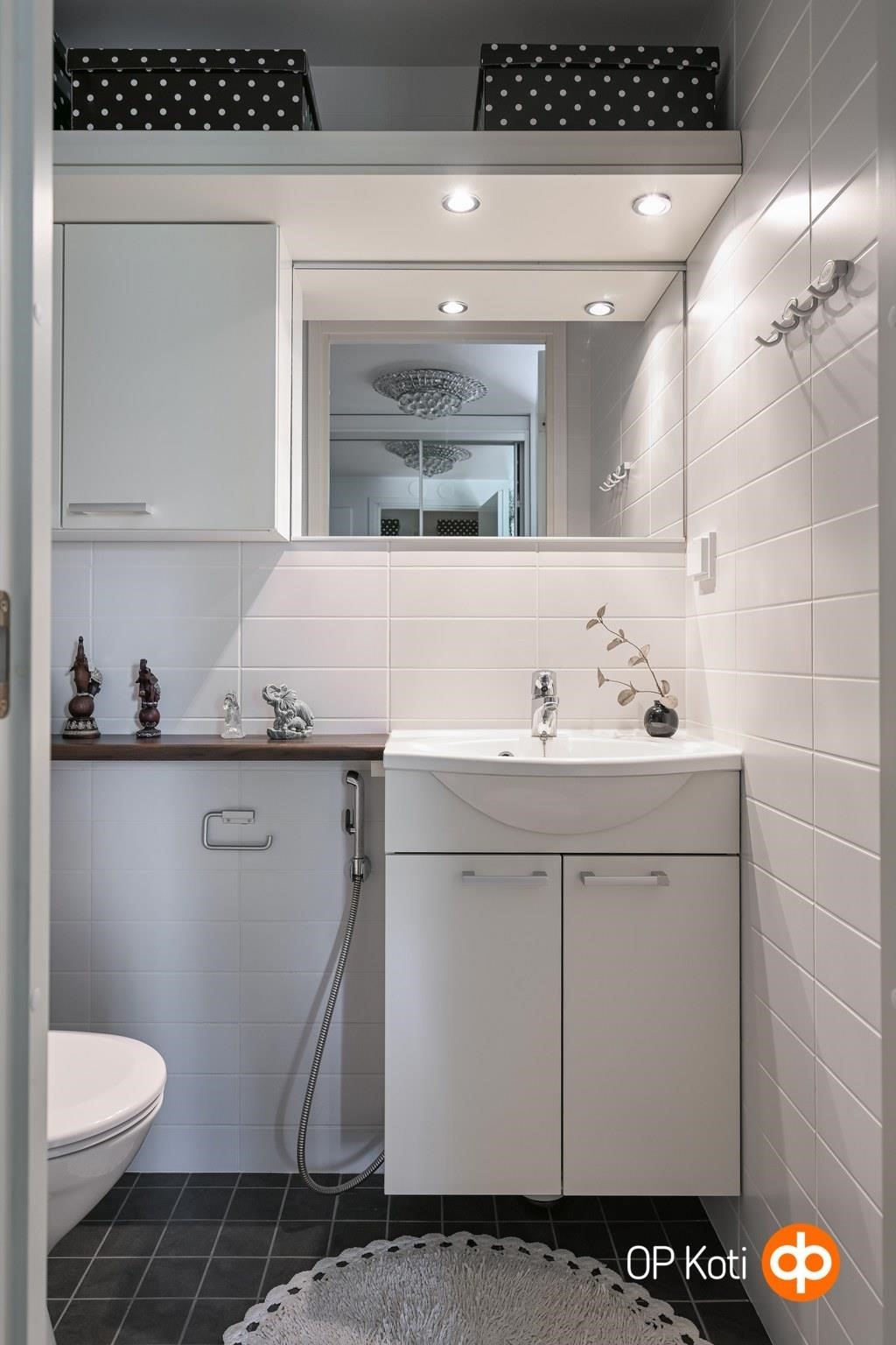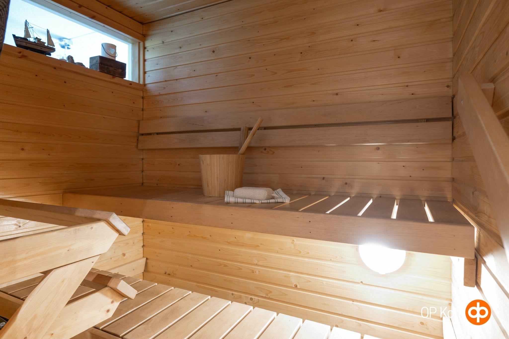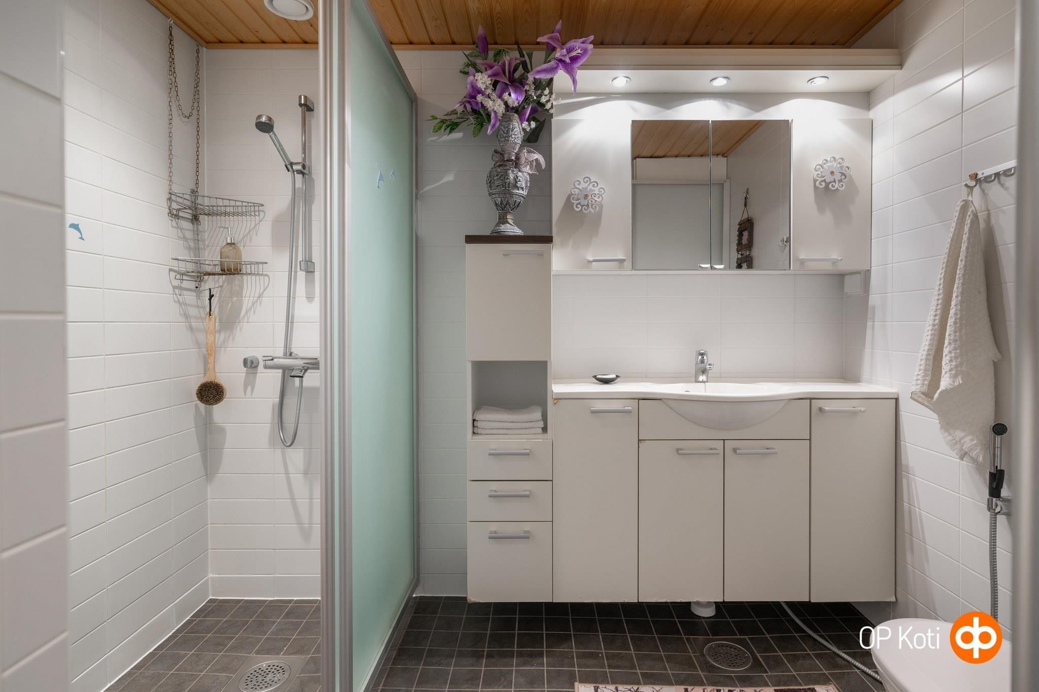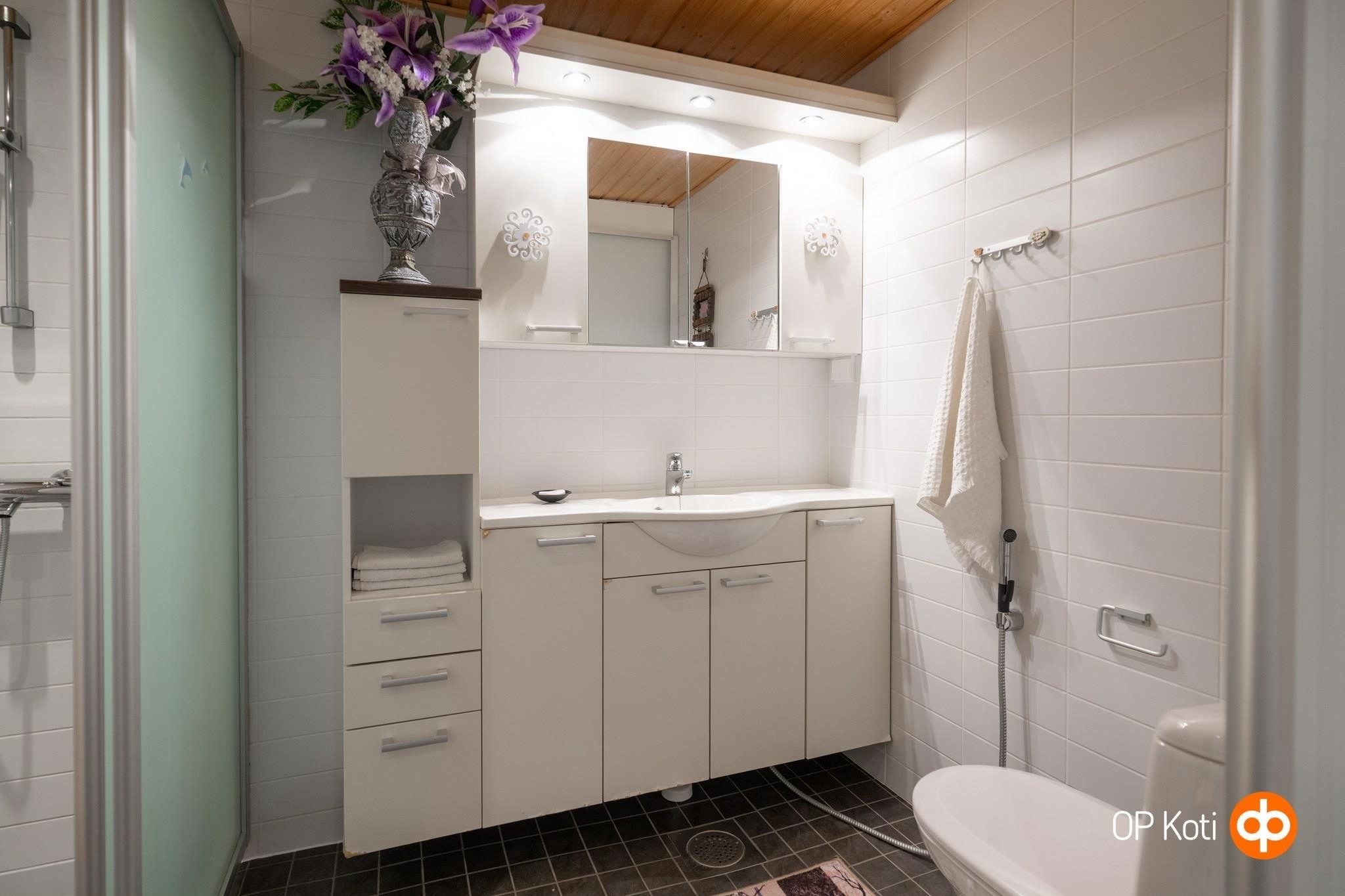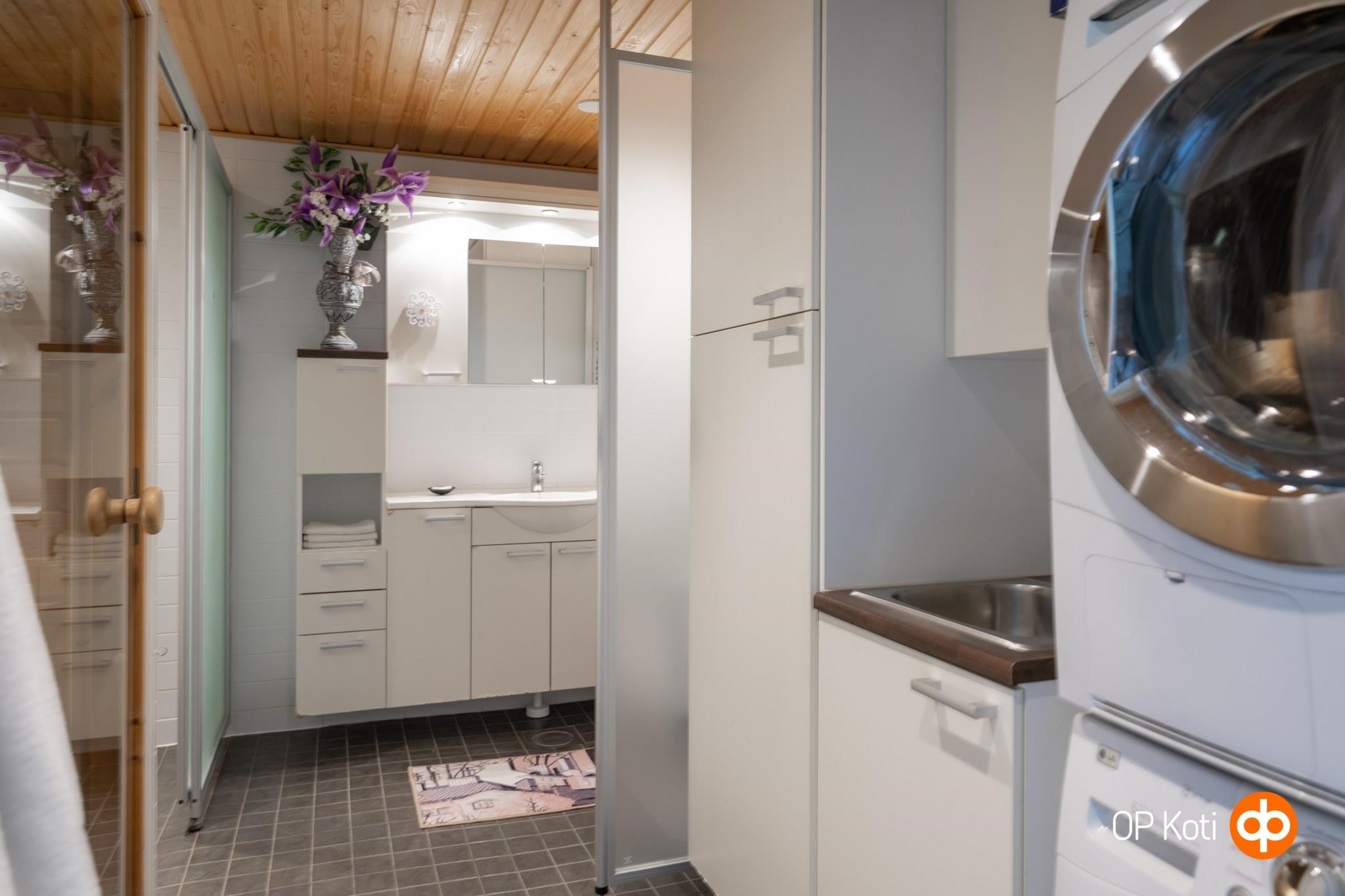 - Sauna, sähkökiuas, kylpyhuone, erillinen wc, suihku, suihkuseinä Liukuovellinen koko suihkualueen leveydeltä, peilit, kaapit, allaskaappi, pesukoneliitäntä, lattialämmitys, kiinteät valaisimet.