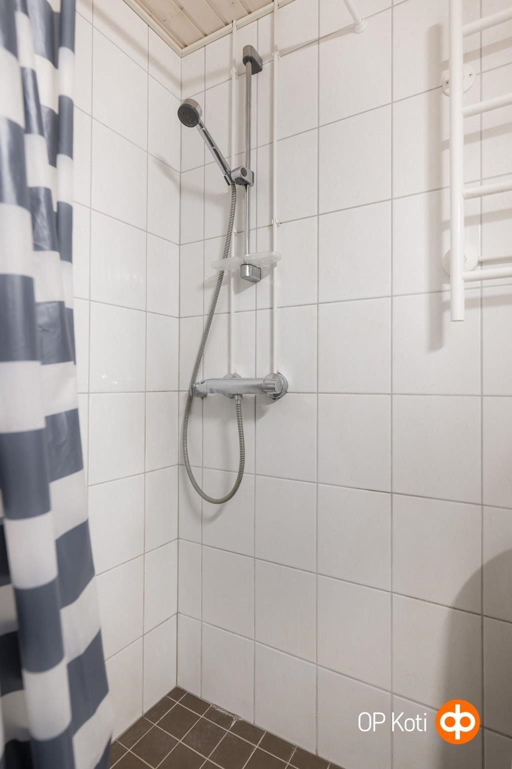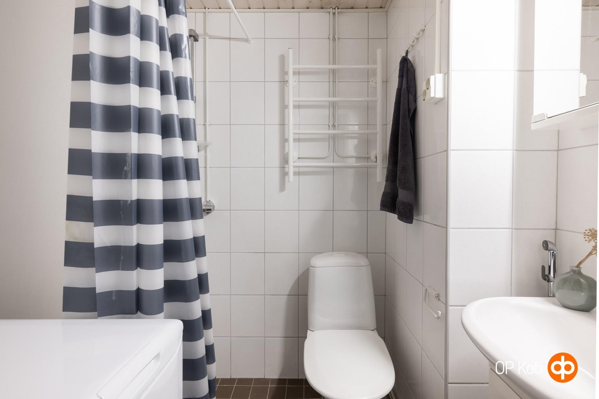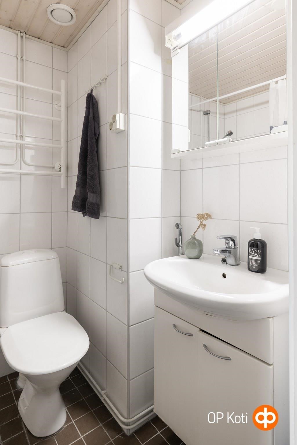 - Kylpyhuone, suihku, suihkuseinä, peilikaappi, allaskaappi, pesukoneliitäntä, kiinteät valaisimet. Kylpyhuone remontoitu 2009 LVI -saneerauksen yhteydessä.