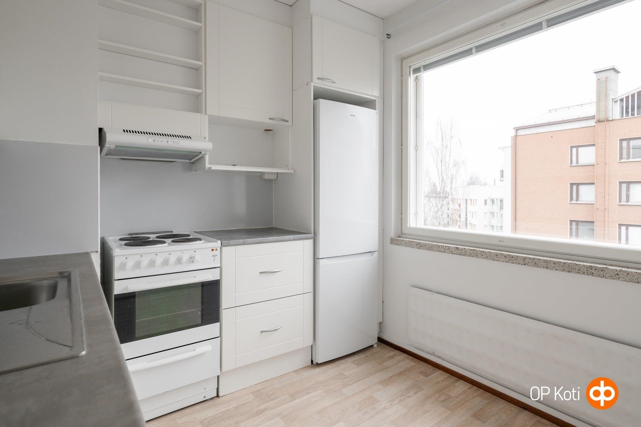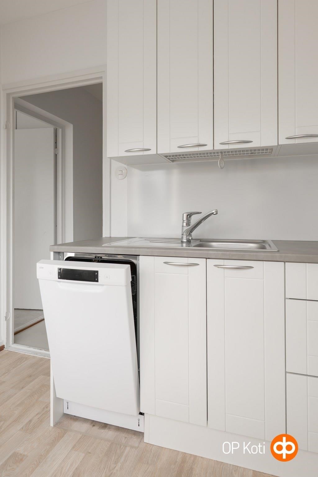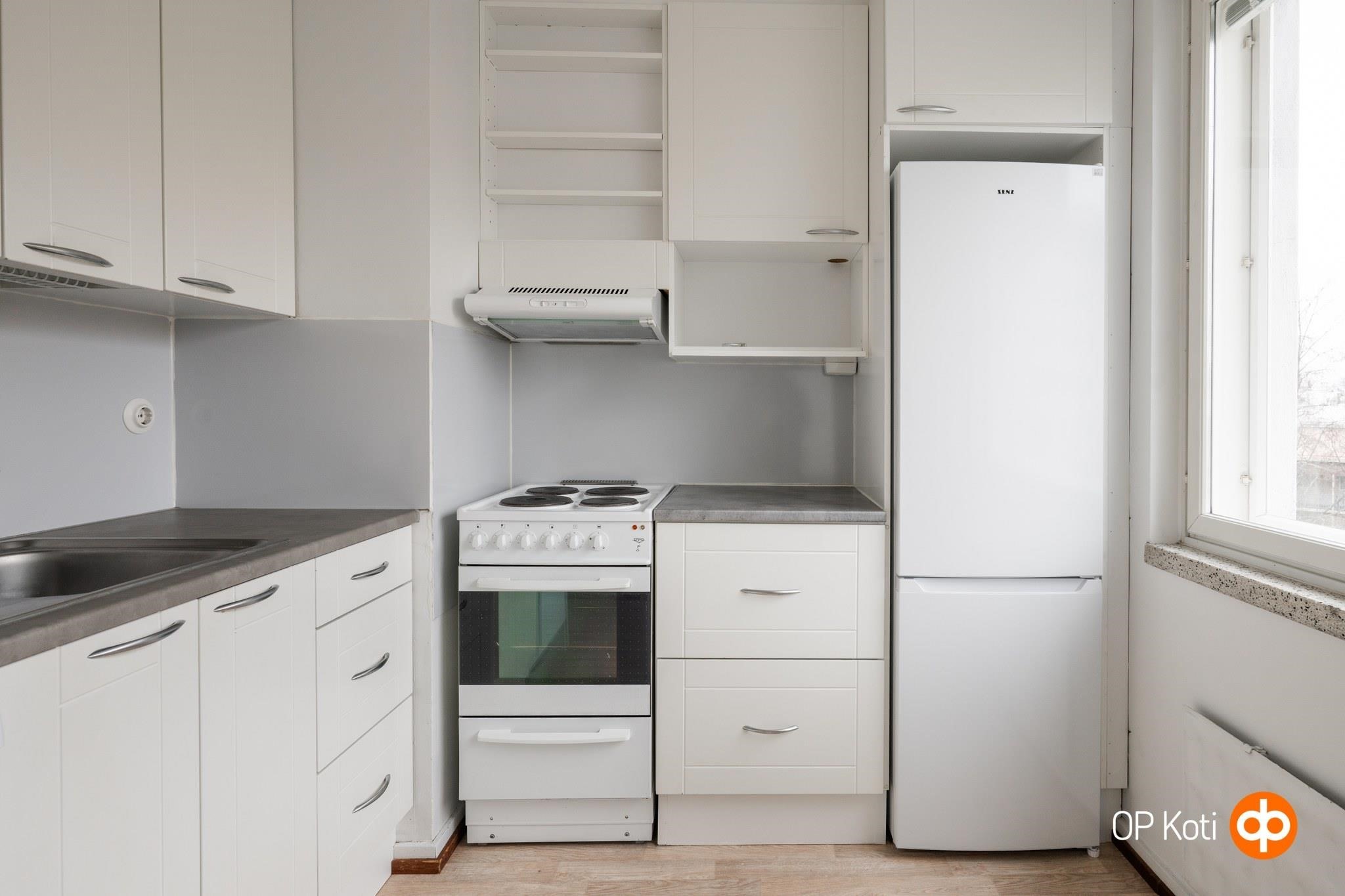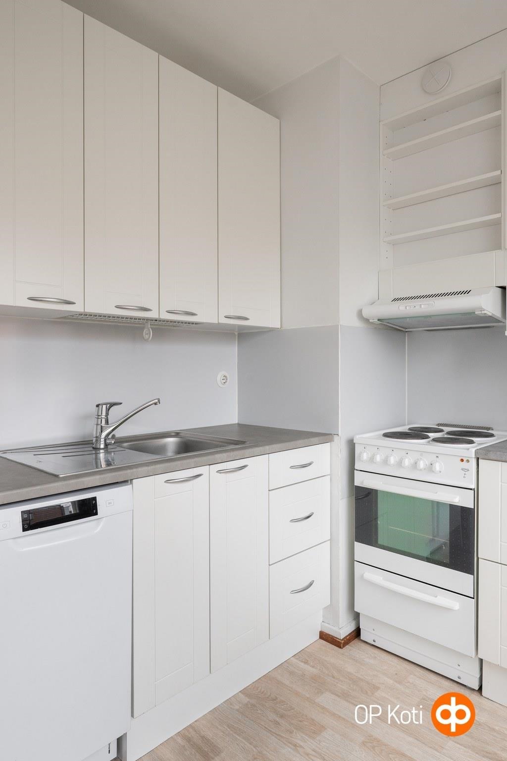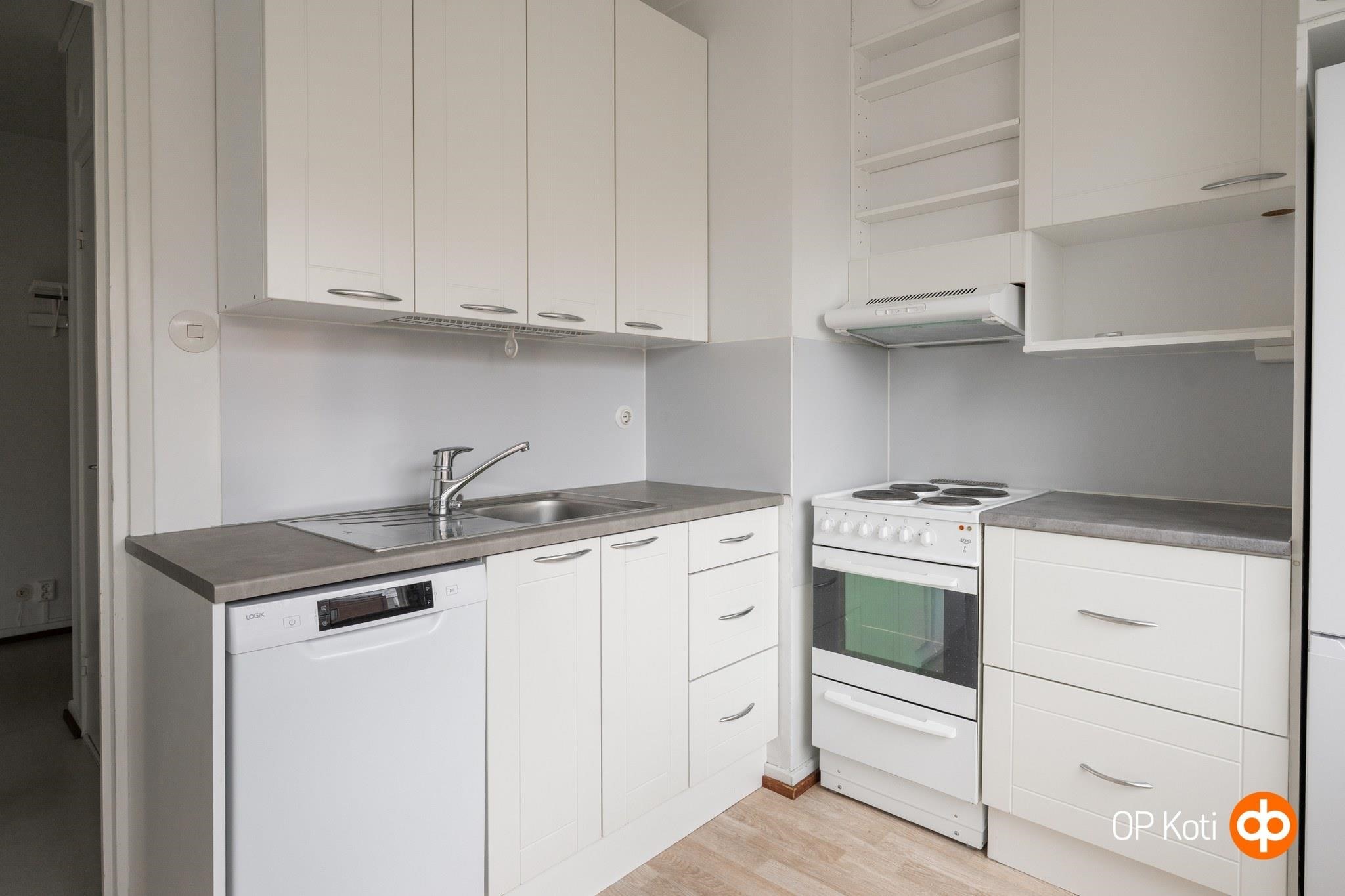 - Jääkaappi, sähköliesi, liesituuletin, astianpesukone, kaapistot, kiinteät valaisimet.