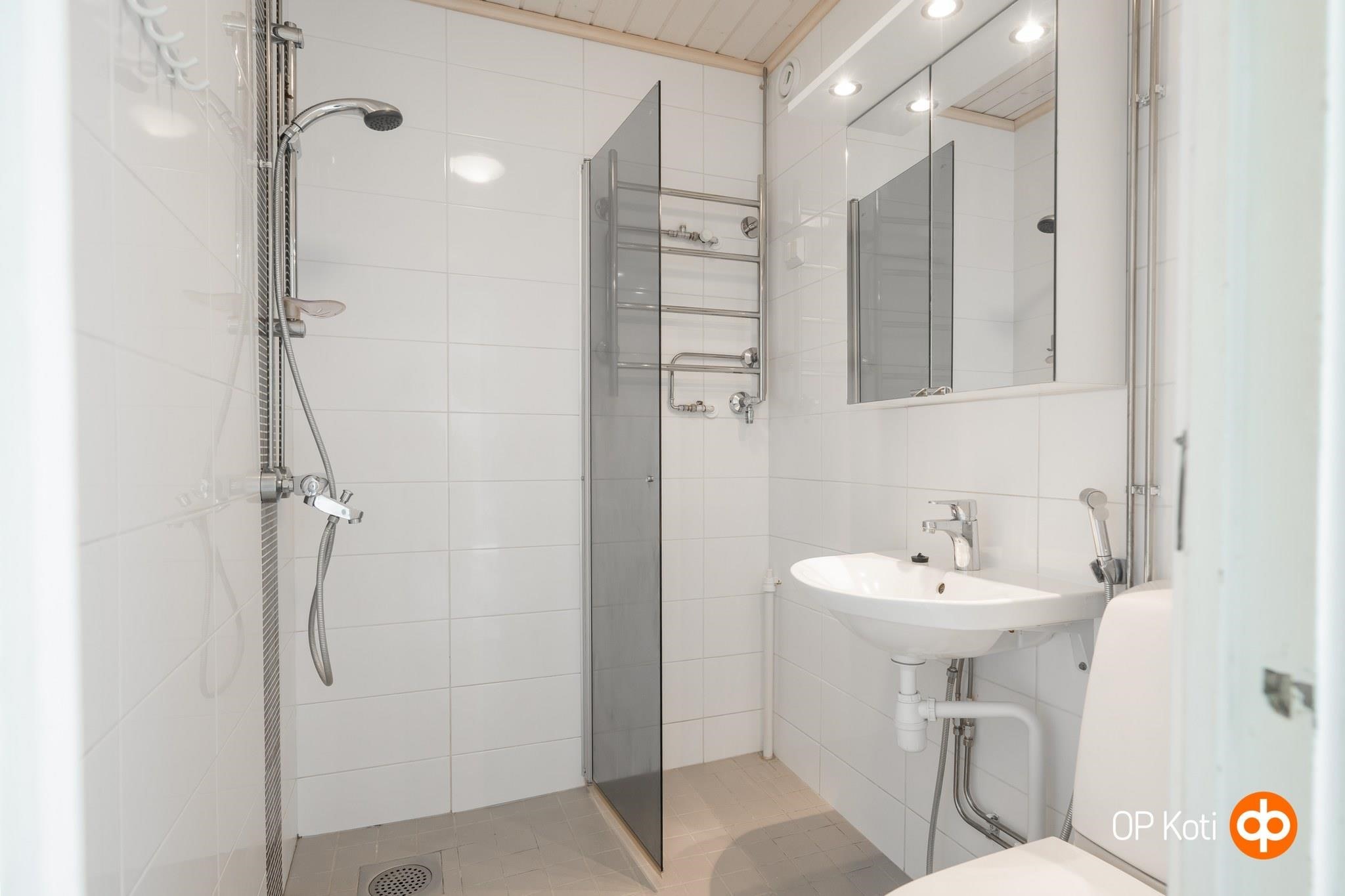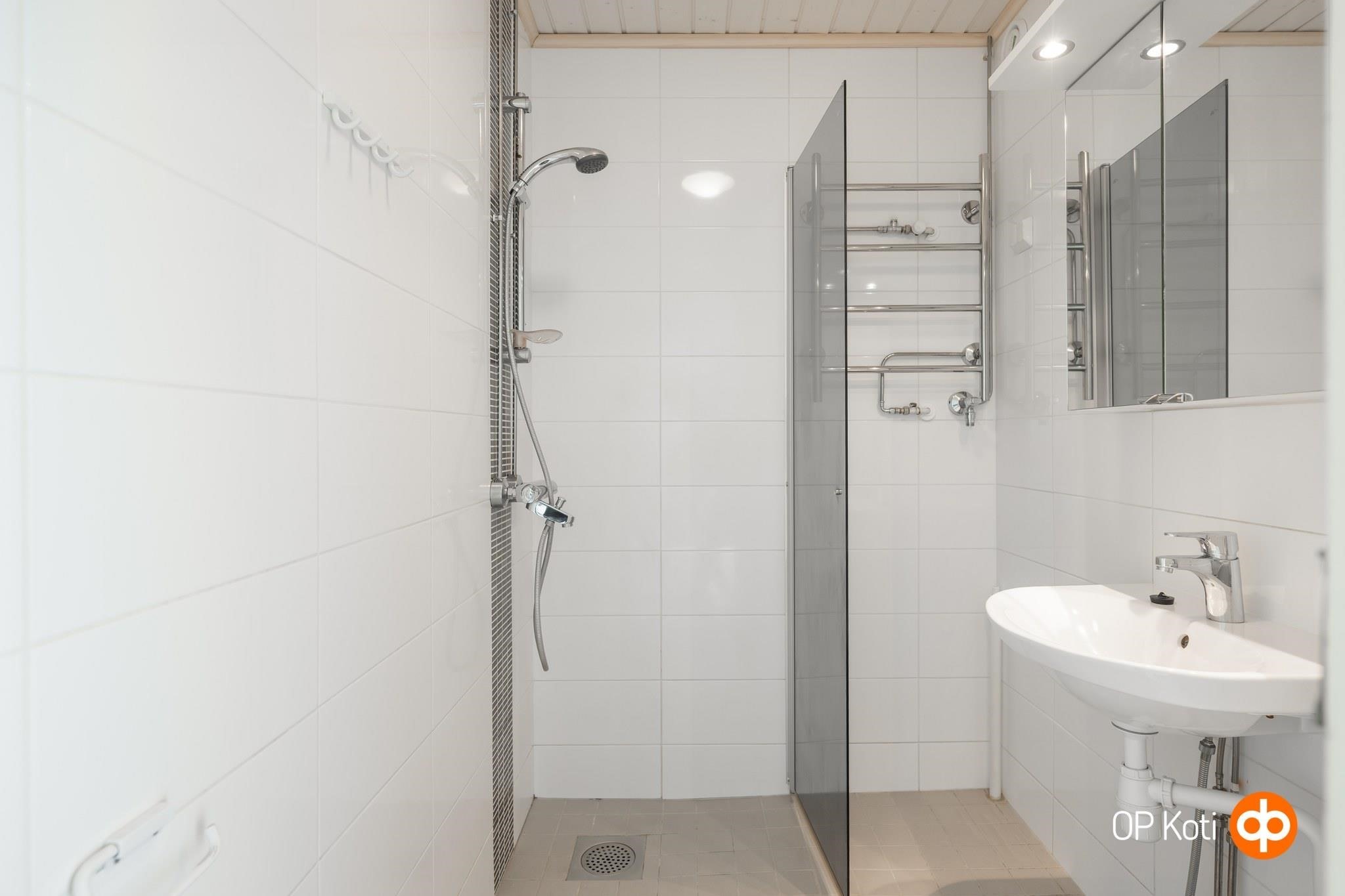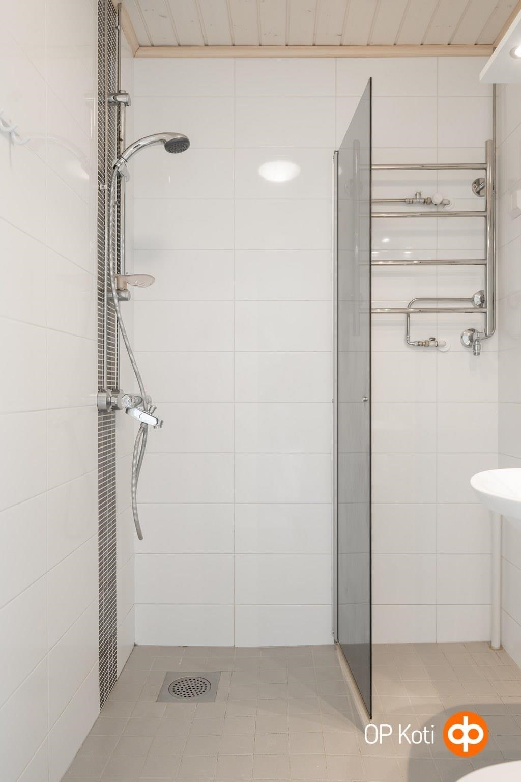 - Kylpyhuone, suihku, suihkuseinä, peilikaappi, pesukoneliitäntä, lattialämmitys, kiinteät valaisimet, rättipatteri.