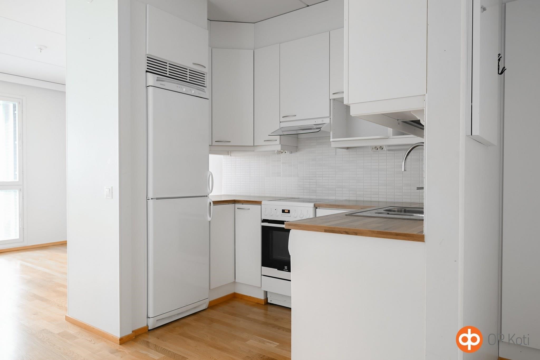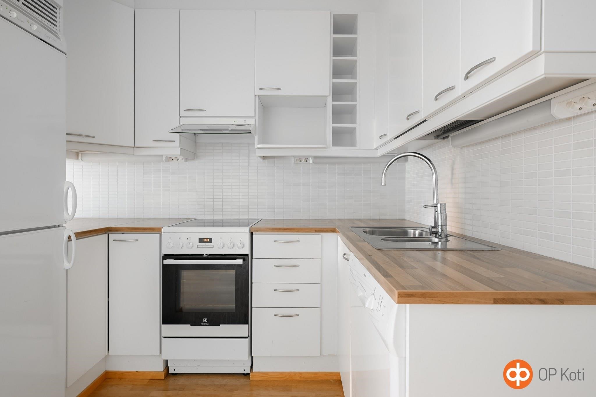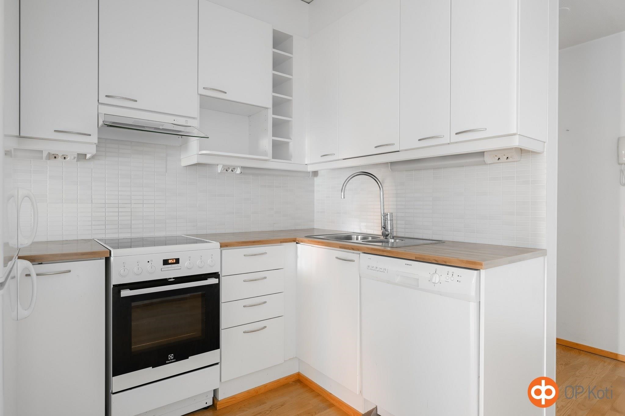 - Jääkaappipakastin, keraaminen liesi, liesituuletin, astianpesukone, kaapistot, kiinteät valaisimet.