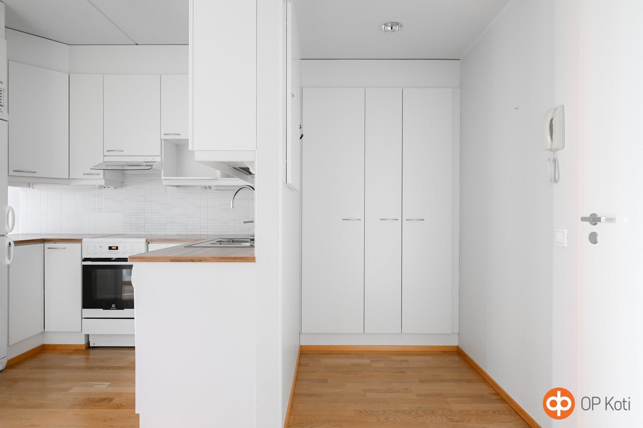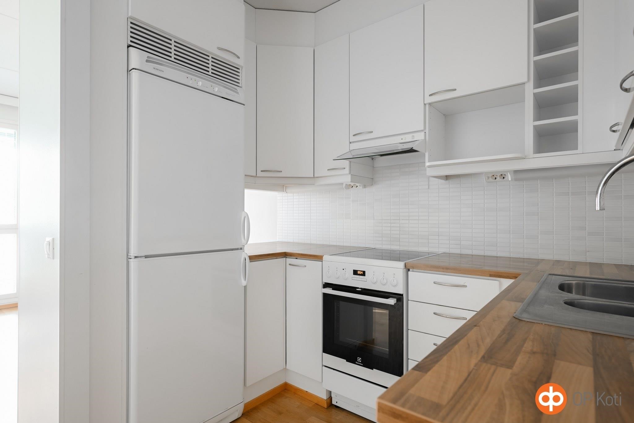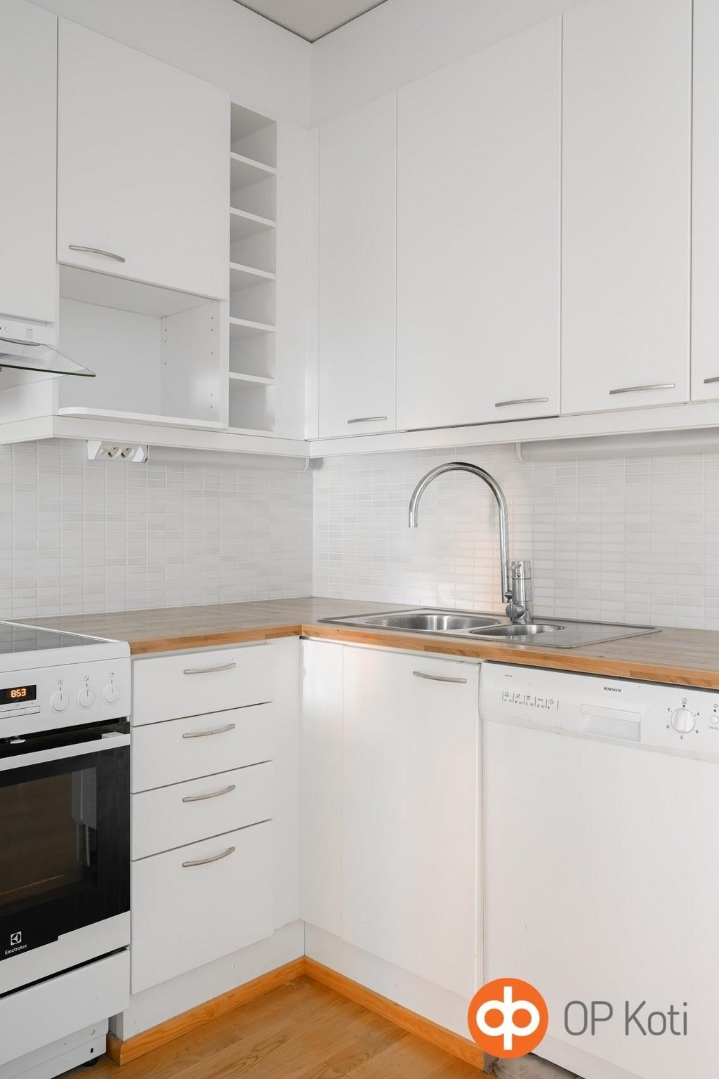 - Jääkaappipakastin, keraaminen liesi, liesituuletin, astianpesukone, kaapistot, kiinteät valaisimet.