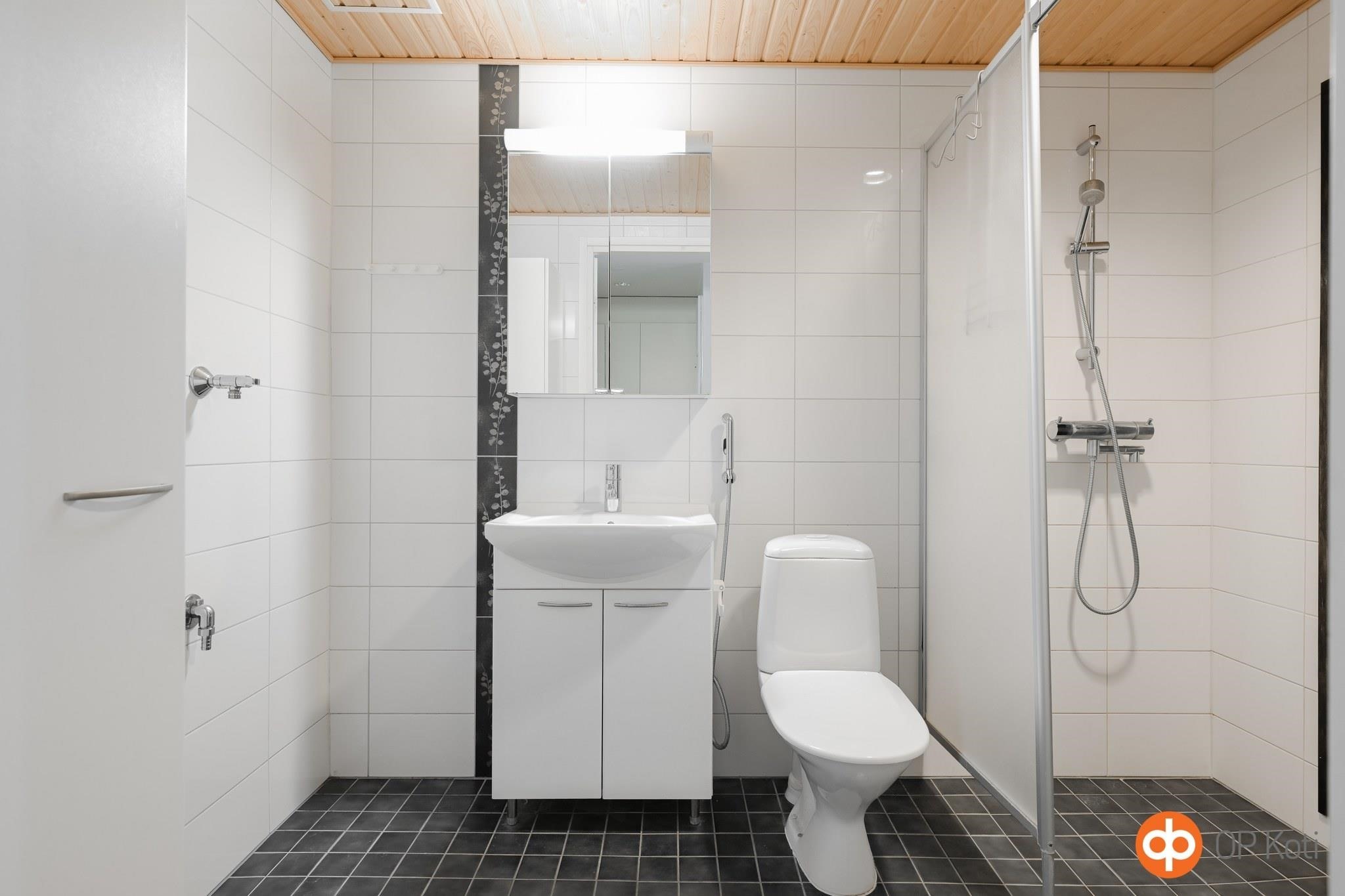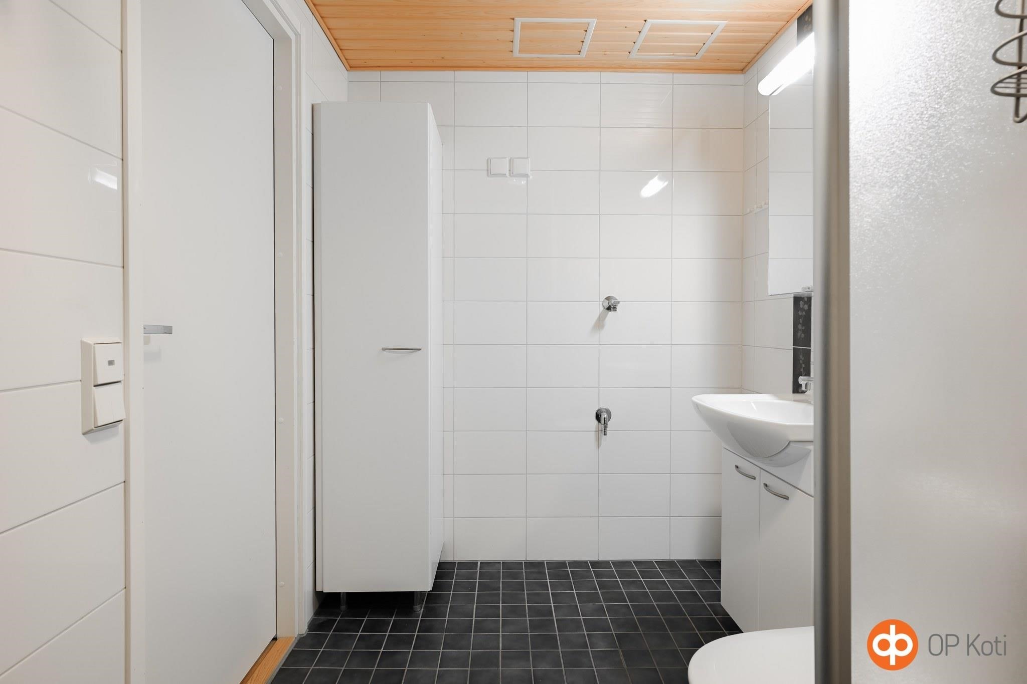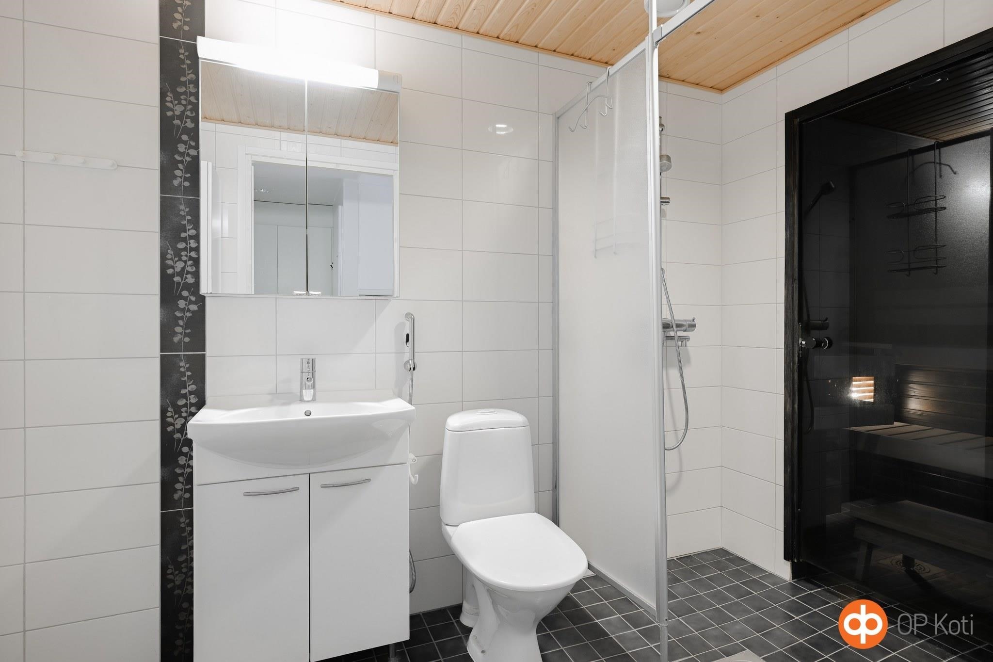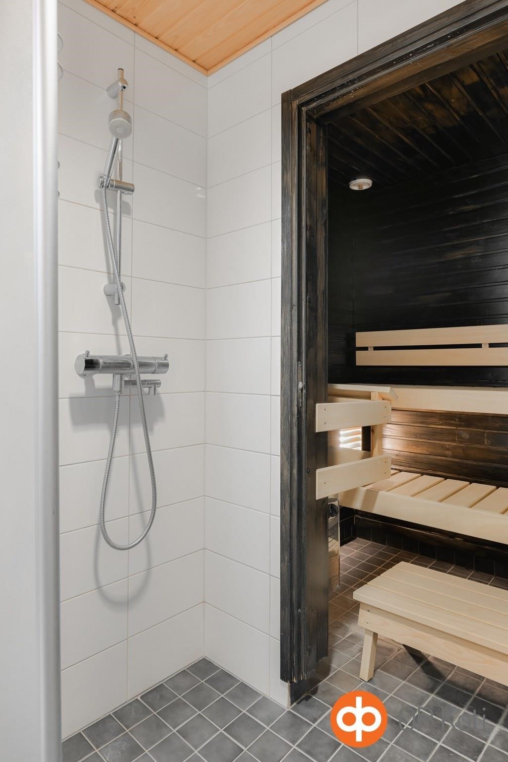 - Sauna, sähkökiuas, suihkuseinä, peilikaappi, pesukoneliitäntä, lattialämmitys, kiinteät valaisimet.