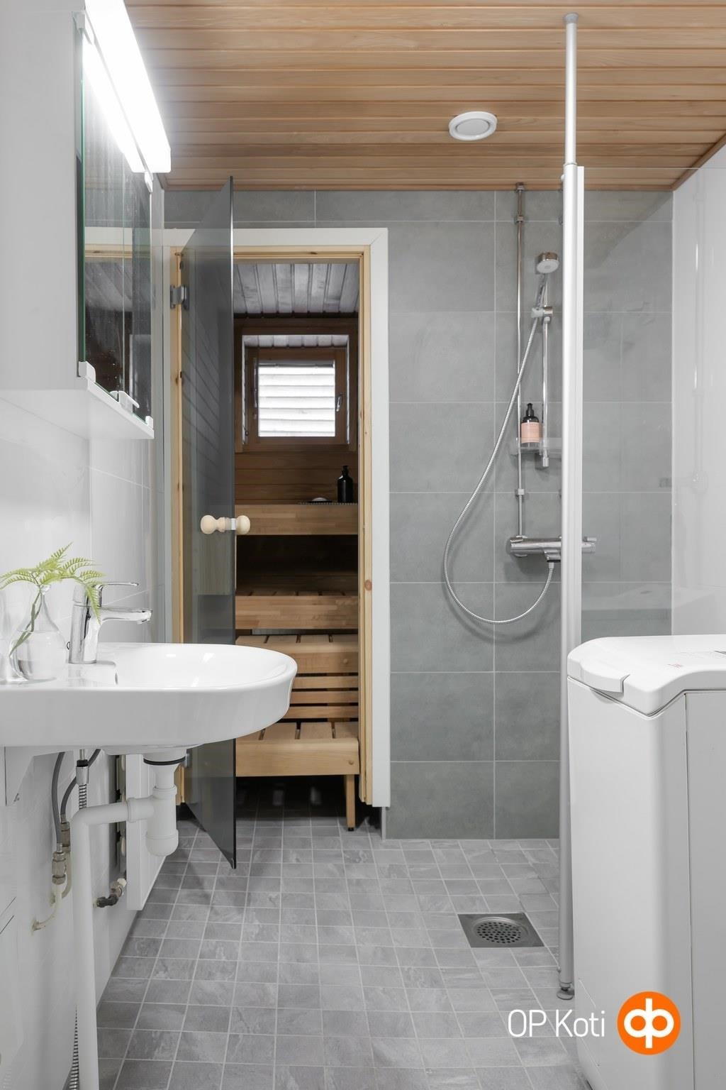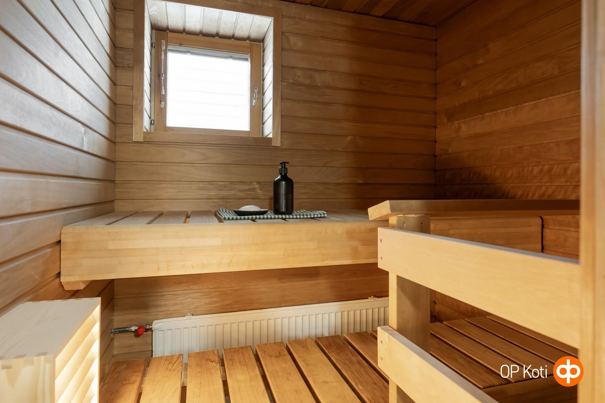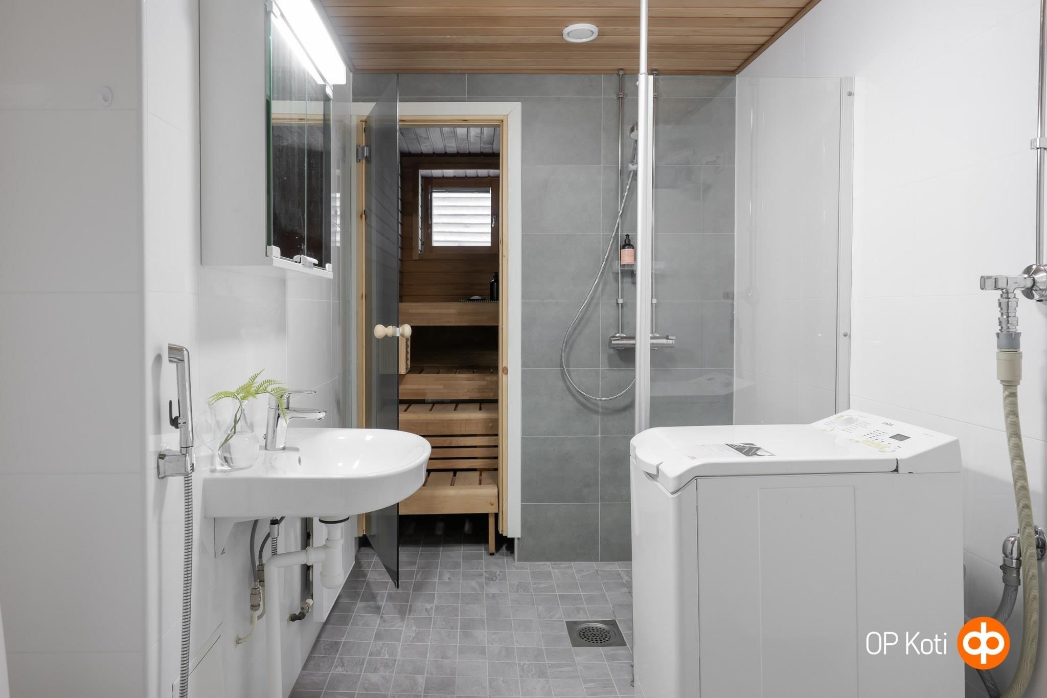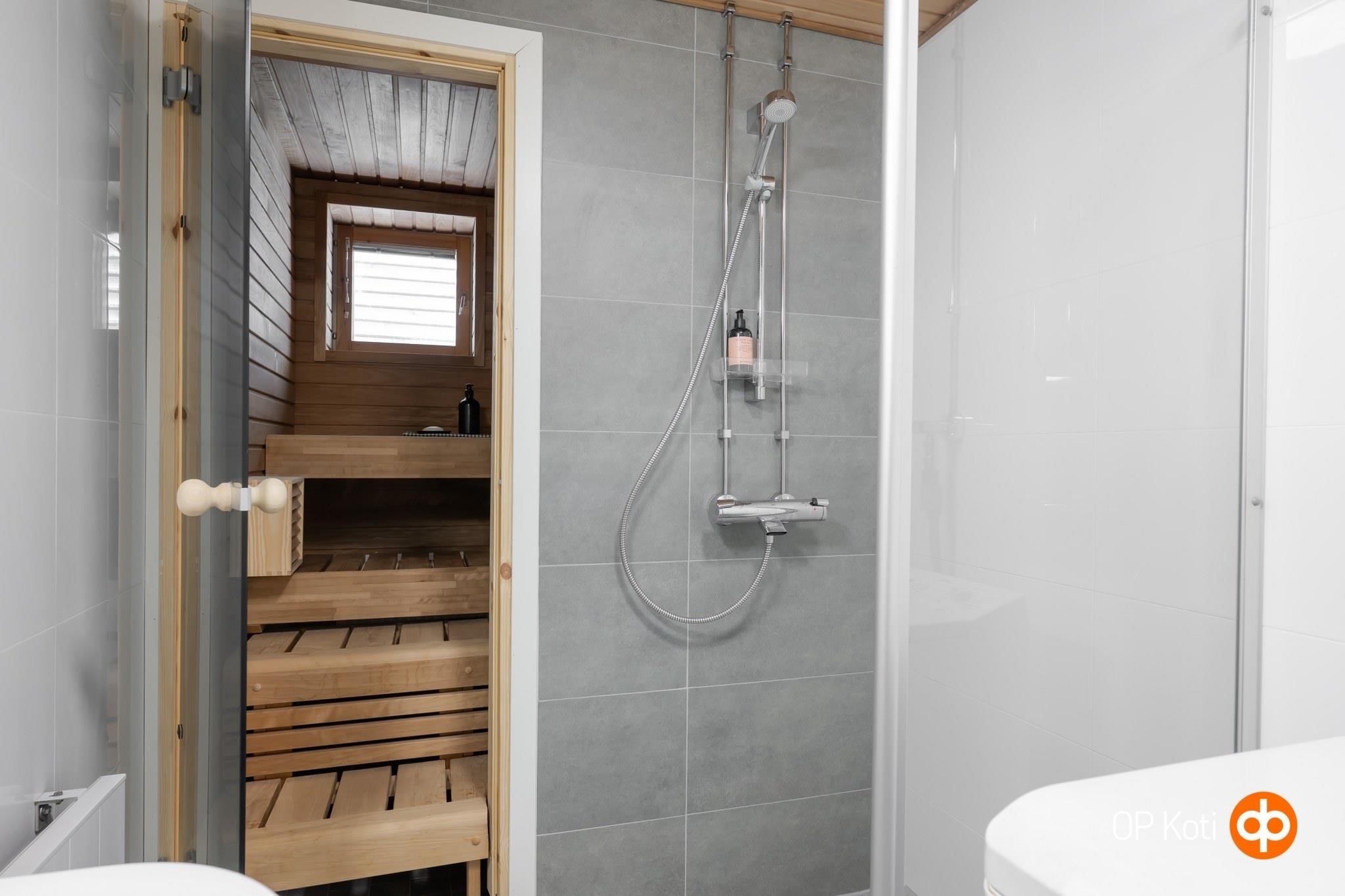 - Sauna, sähkökiuas, kylpyhuone, suihku, suihkuseinä, peilikaappi, kaapit, pesukoneliitäntä, kiinteät valaisimet. Kylpyhuone ja sauna remontoitu 2023