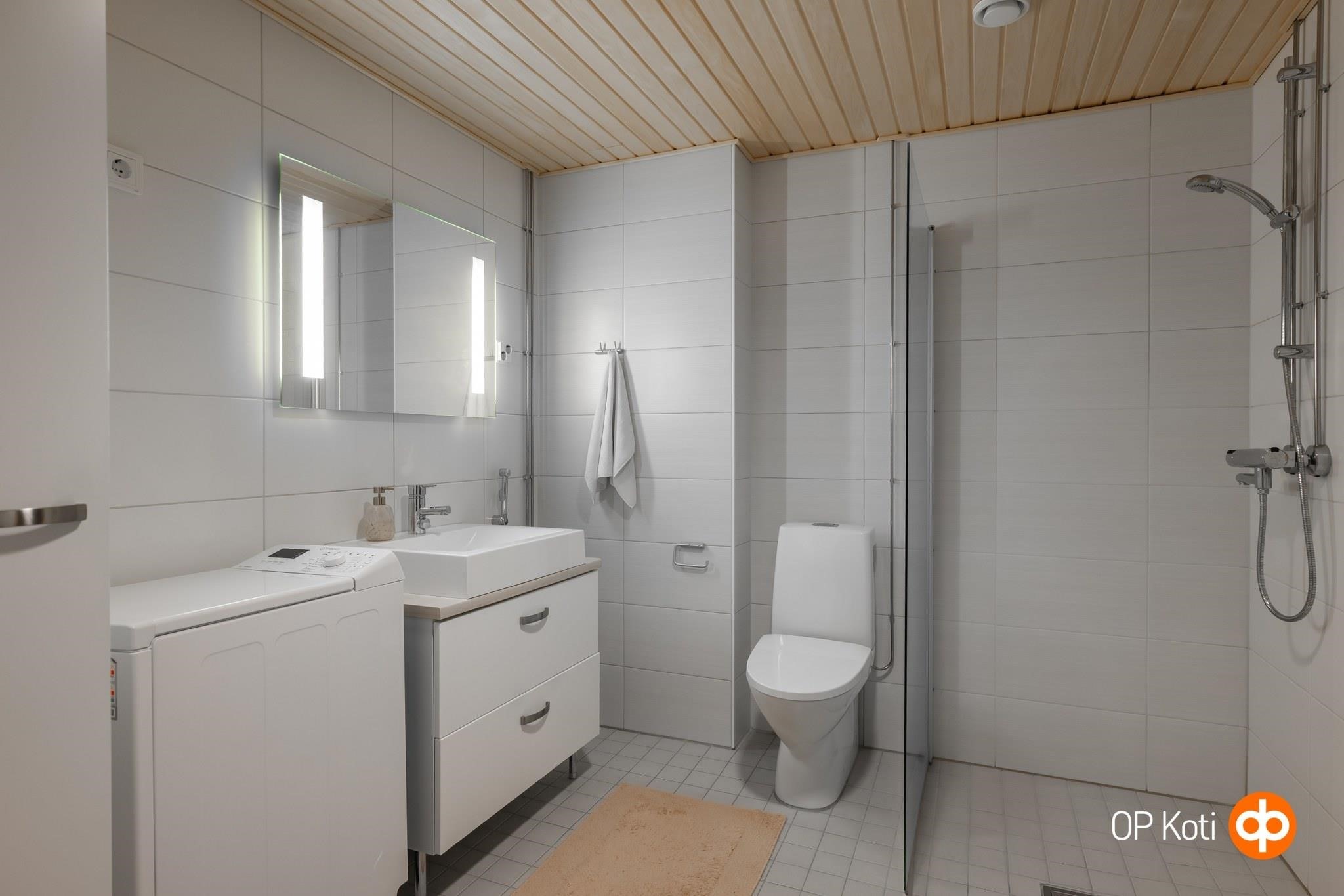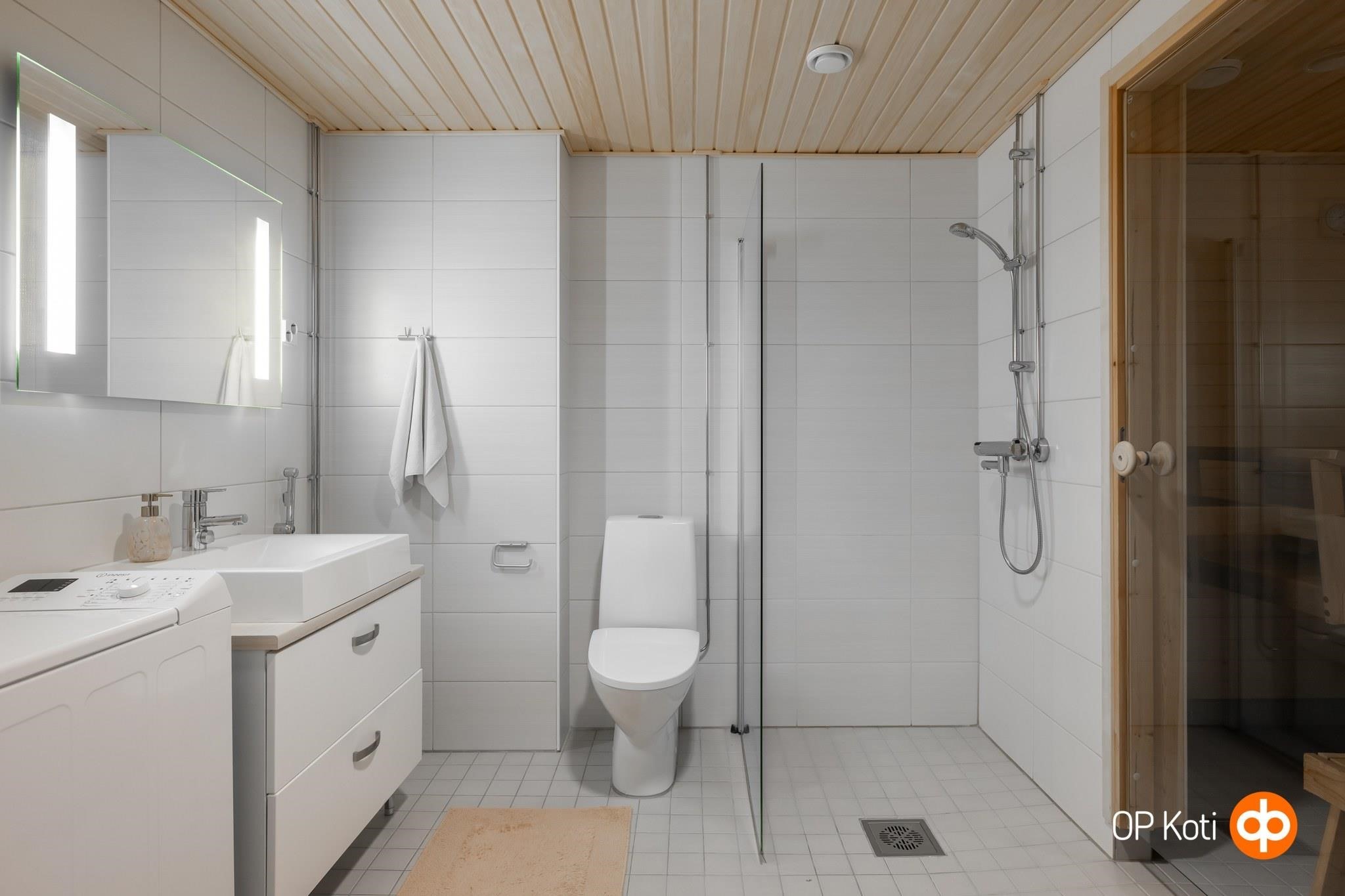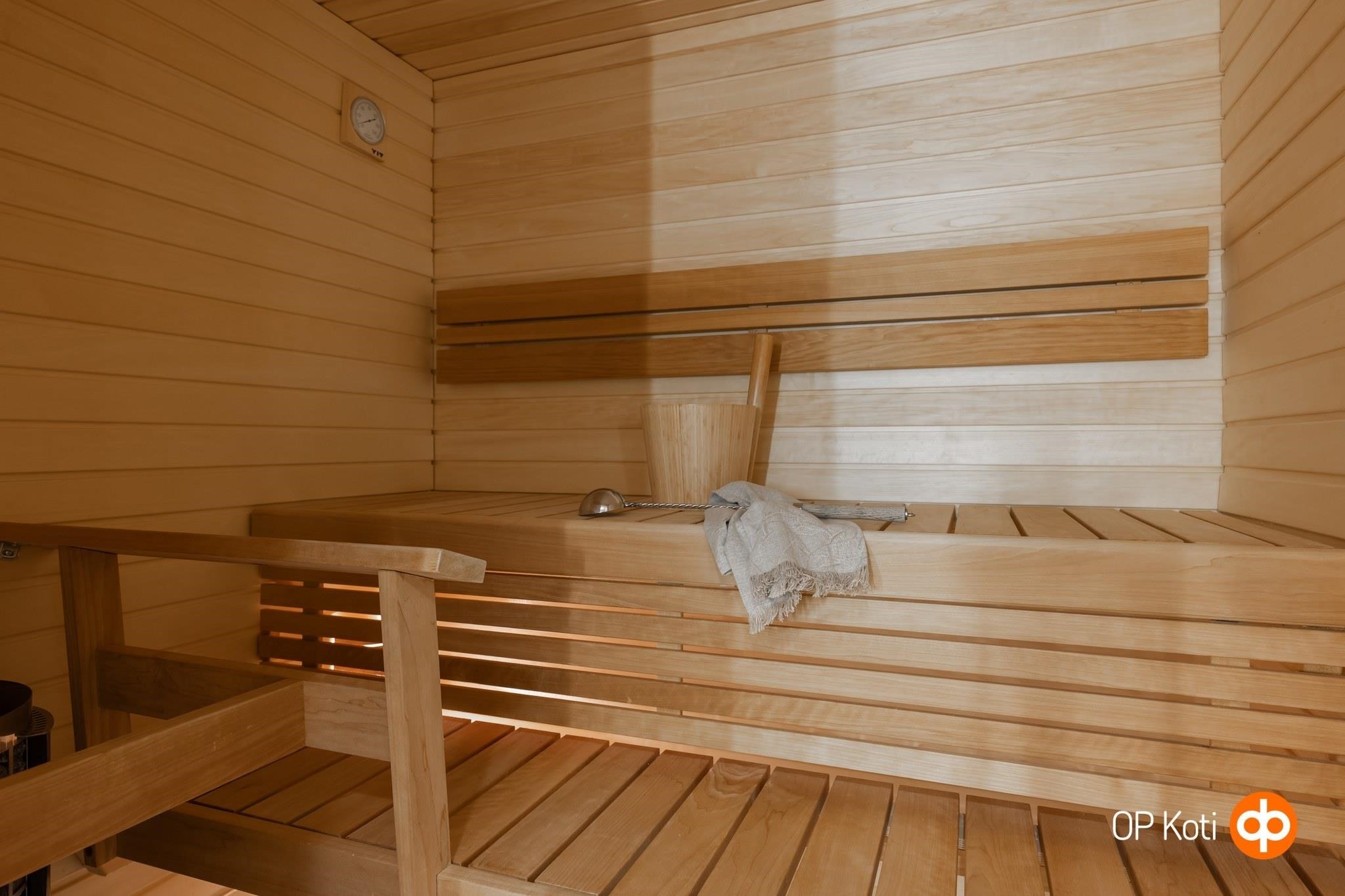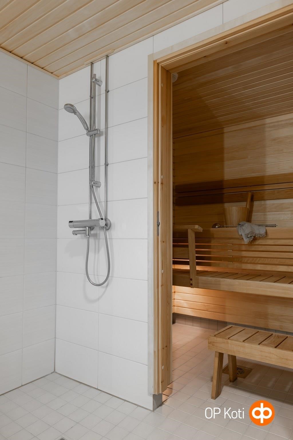 - Sauna, sähkökiuas, erillinen wc, suihku, suihkuseinä, peilit, kaapit, allaskaappi, pesukoneliitäntä, lattialämmitys, kiinteät valaisimet.