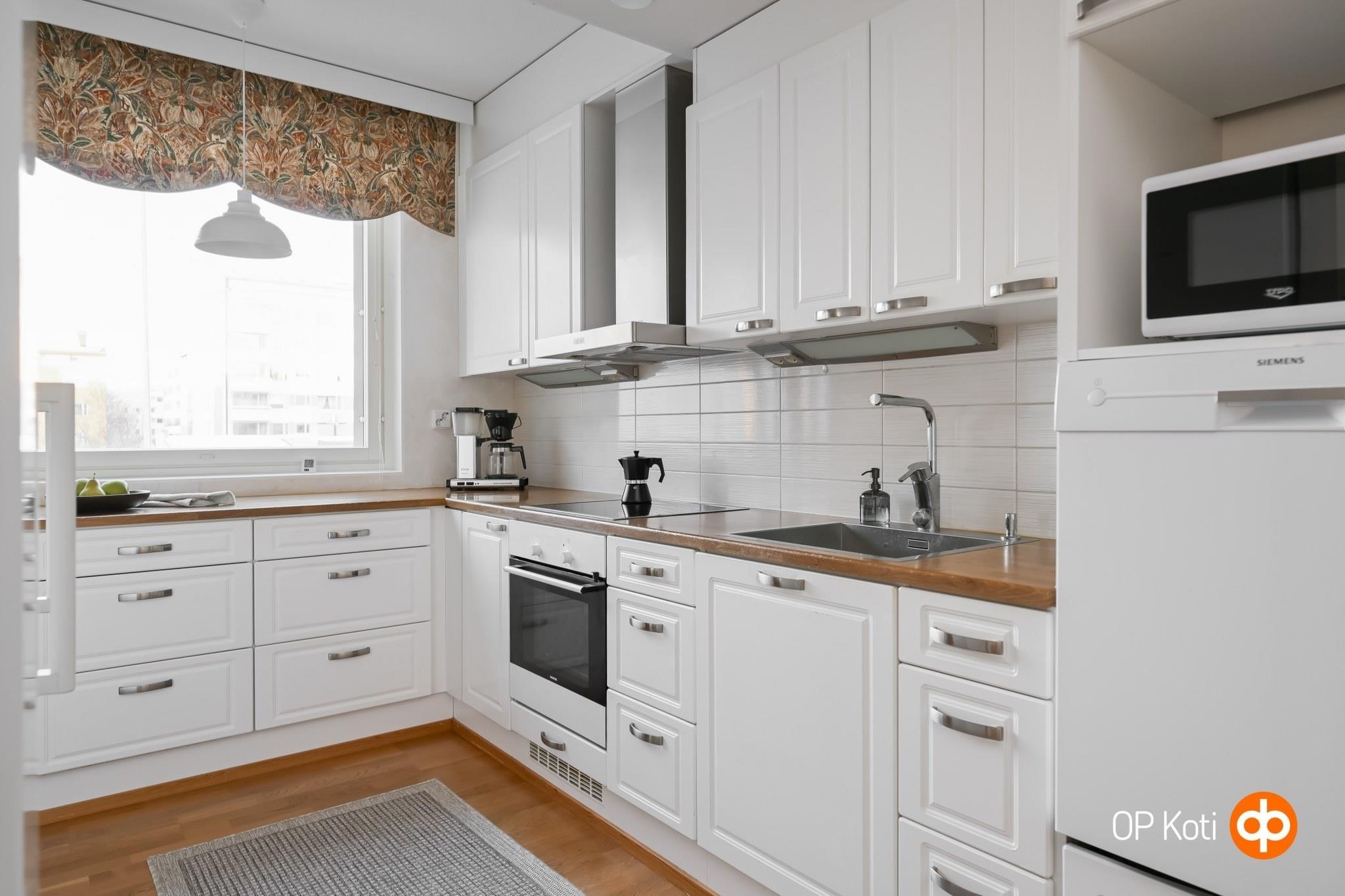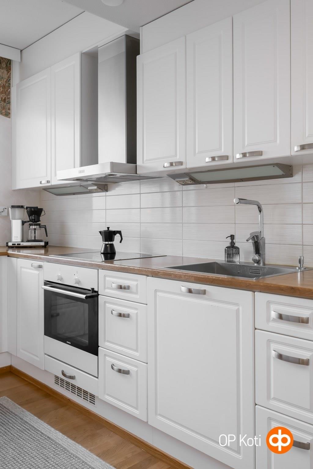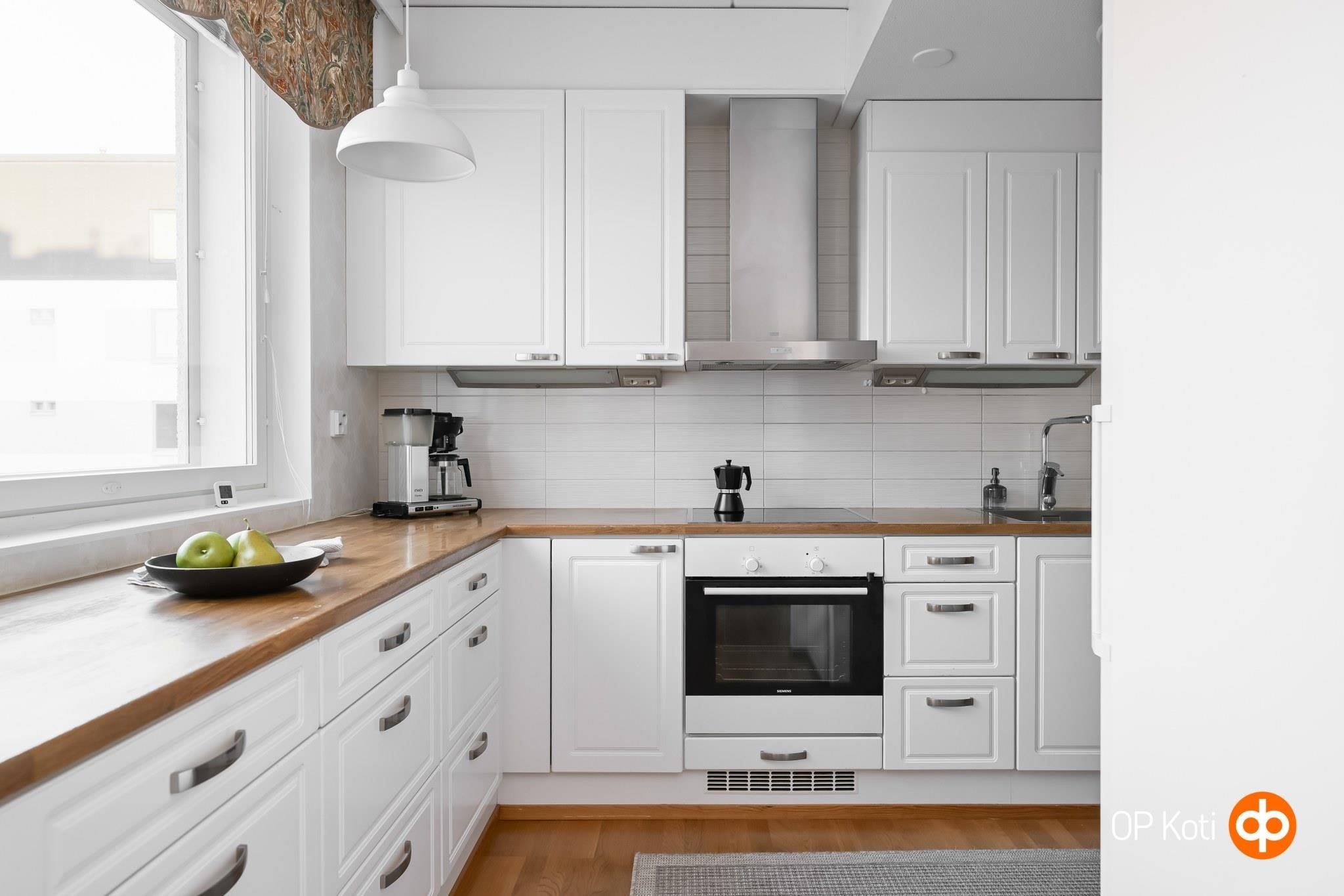 - Jääkaappi, pakastekaappi, erillisuuni, liesitaso, induktioliesi, liesituuletin, astianpesukone, kaapistot, kiinteät valaisimet.