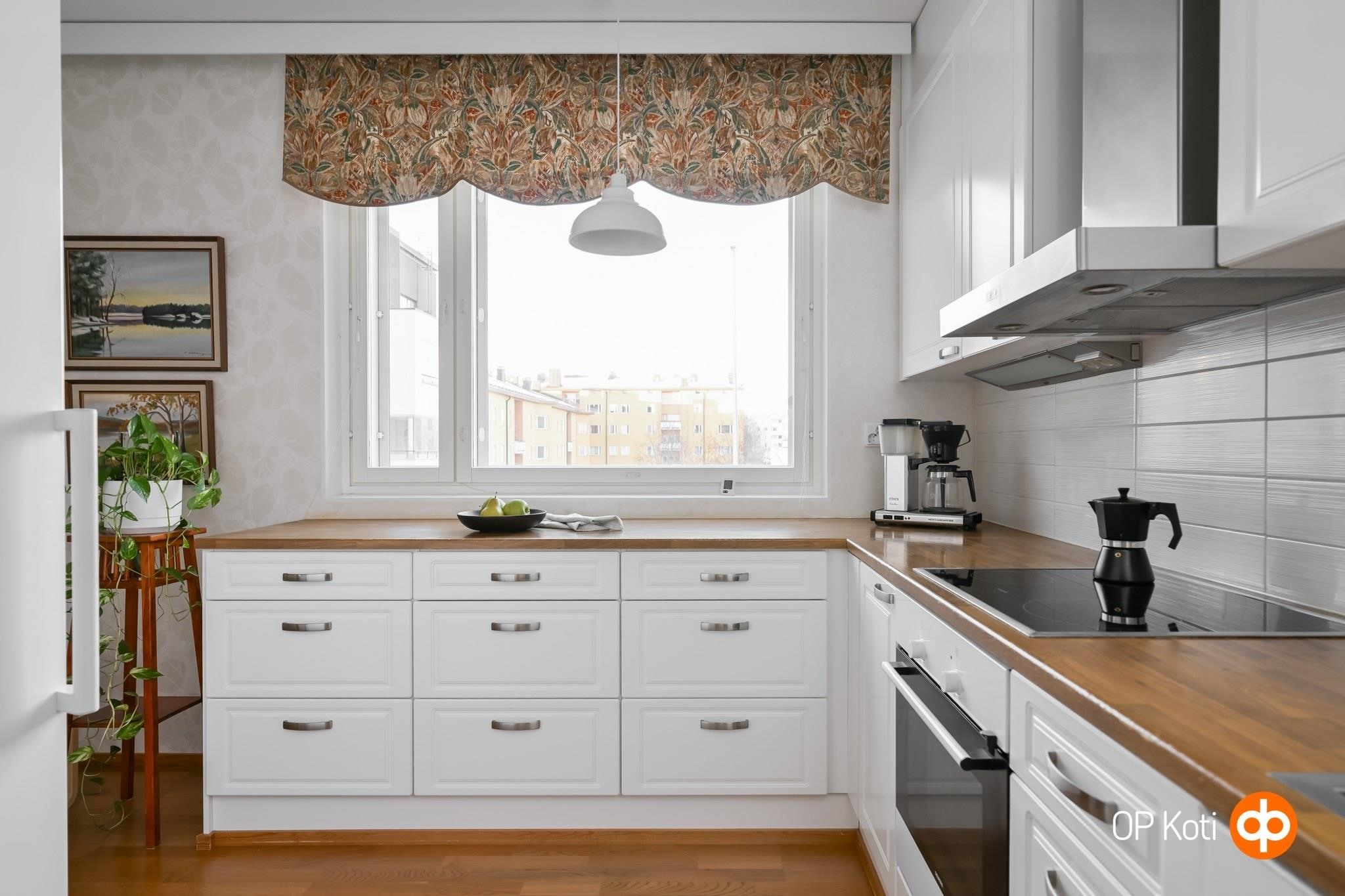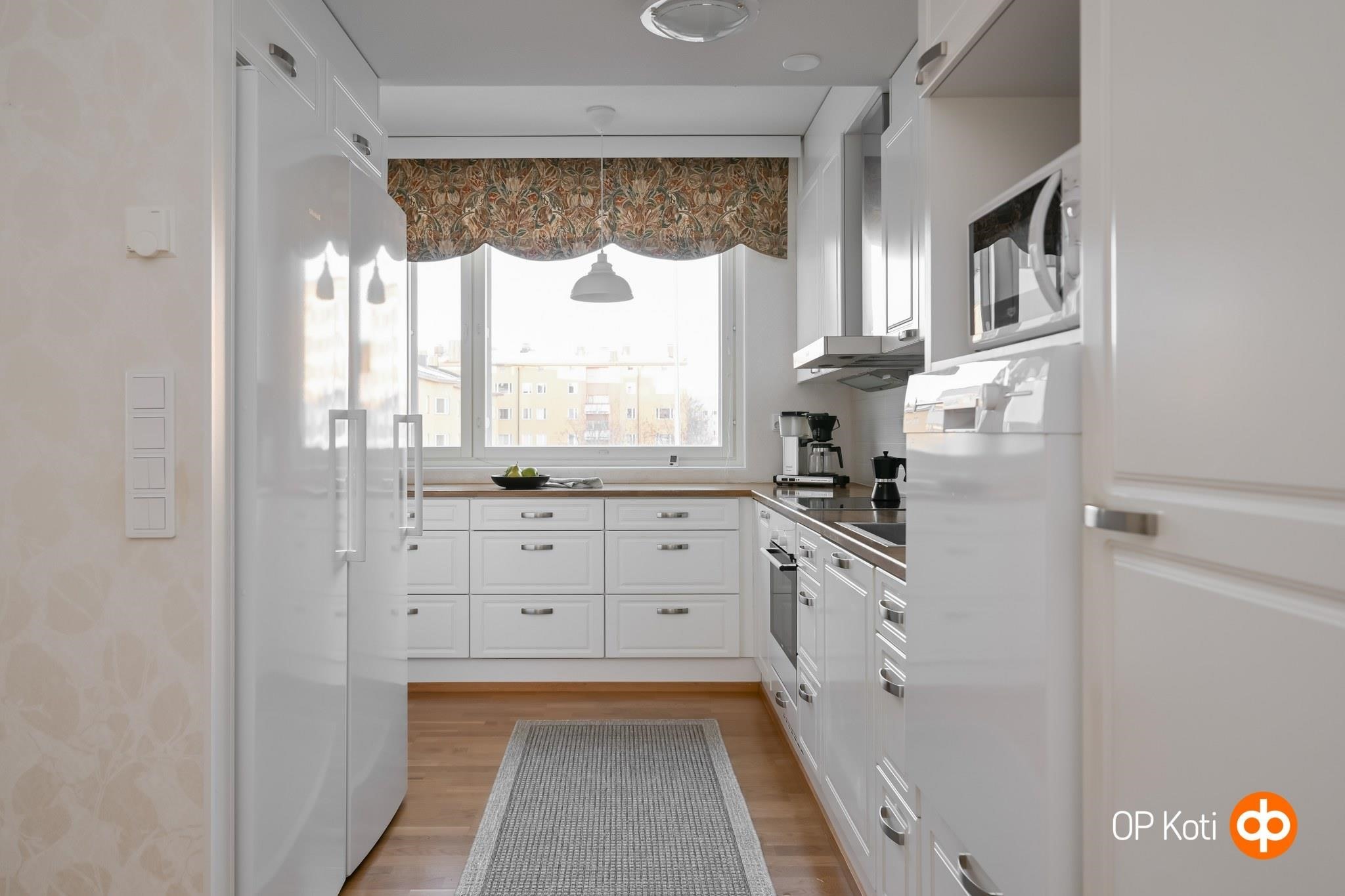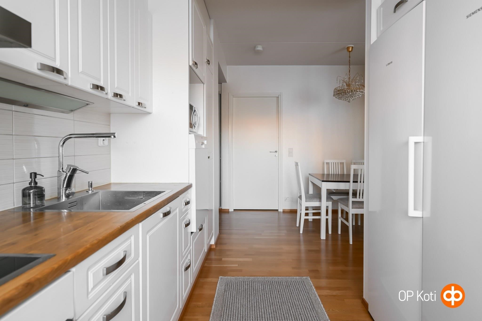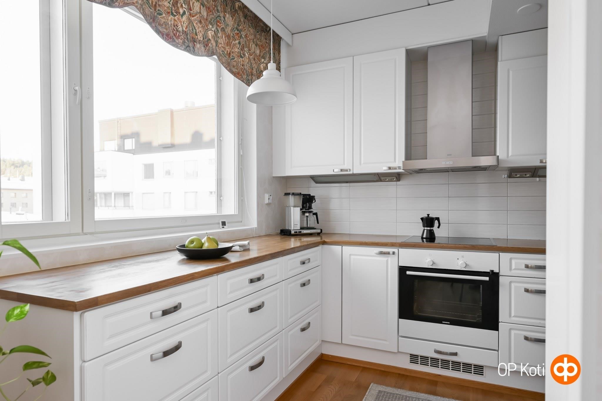 - Jääkaappi, pakastekaappi, erillisuuni, liesitaso, induktioliesi, liesituuletin, astianpesukone, kaapistot, kiinteät valaisimet.