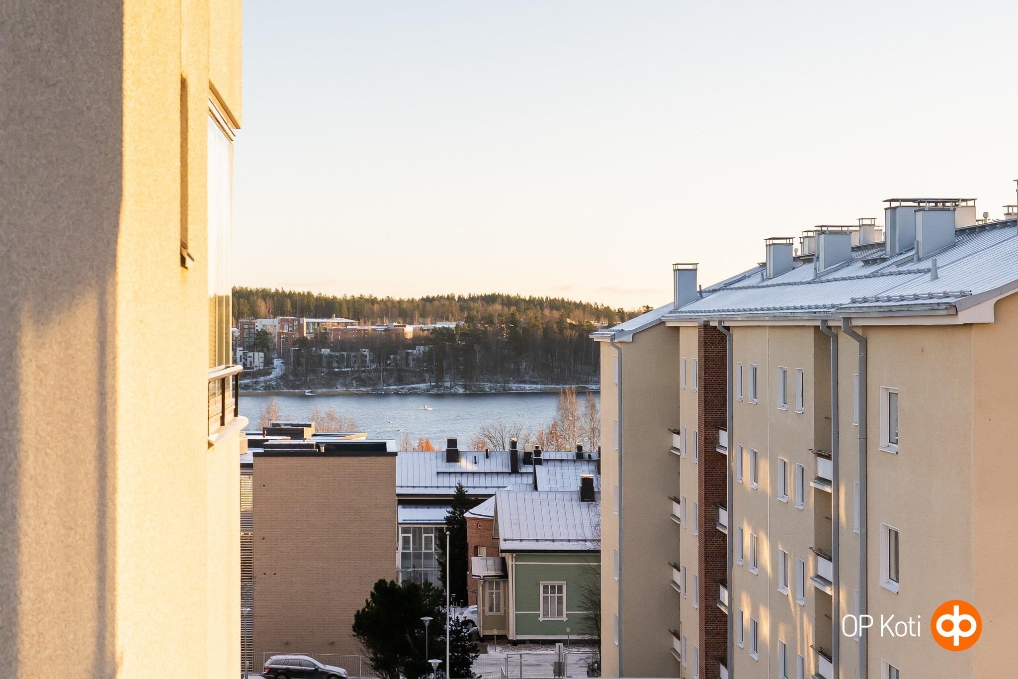 - Keittiöstä, olohuoneesta ja makuuhuoneesta näkymät sisäpihalle Harjun suuntaan, pienemmästä makuuhuoneesta sisäpihalle etelään ja parvekkeelta itään Jyväsjärven suuntaan