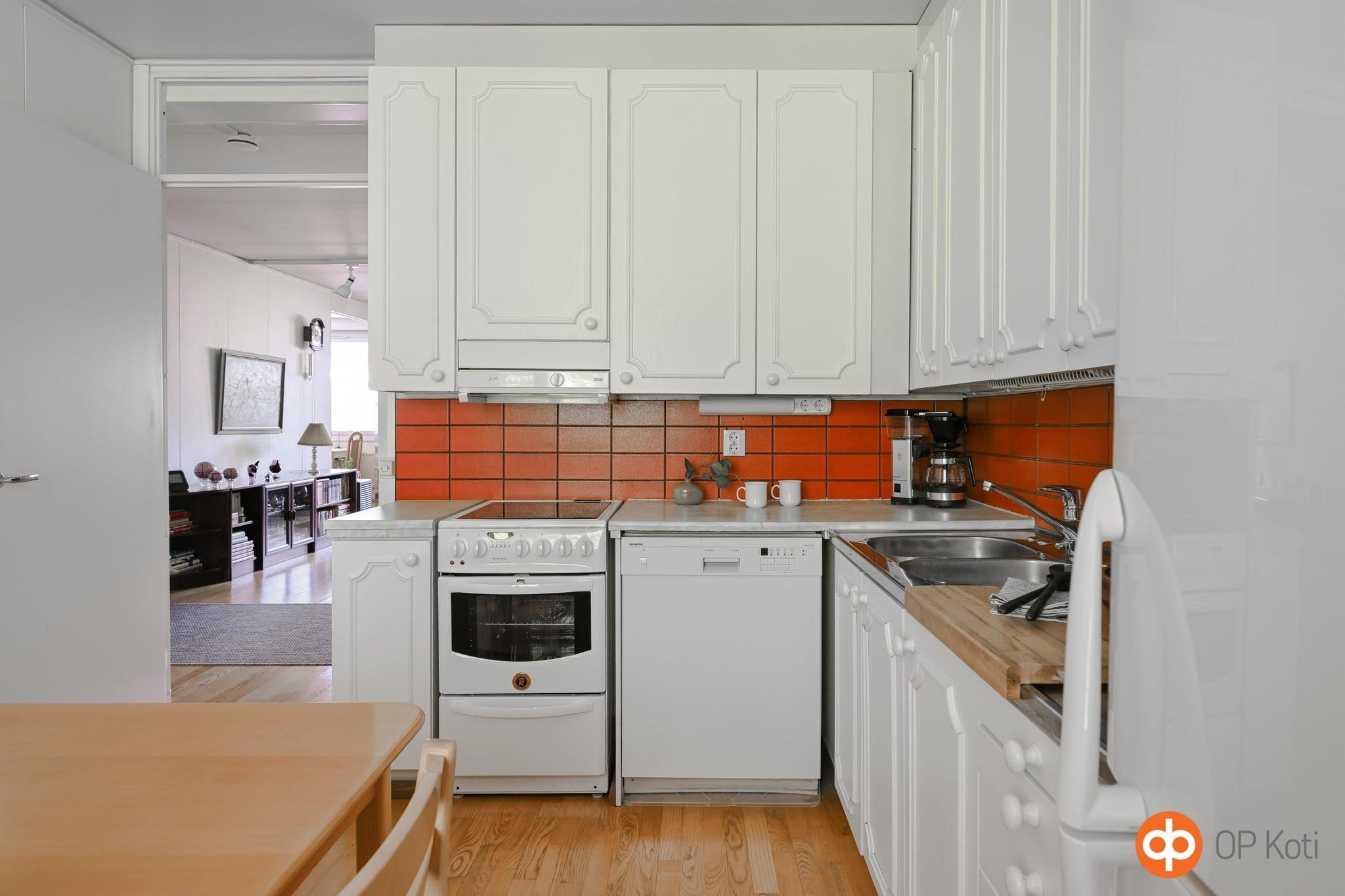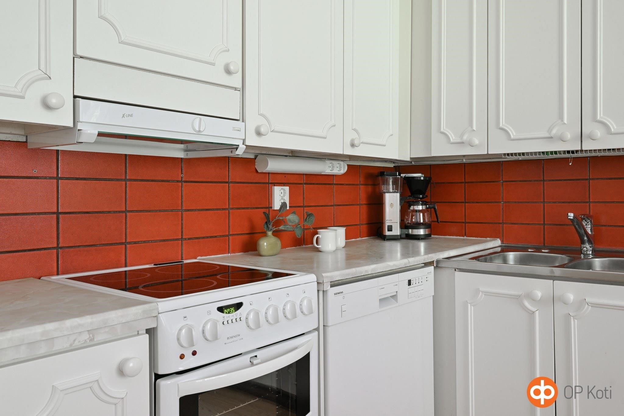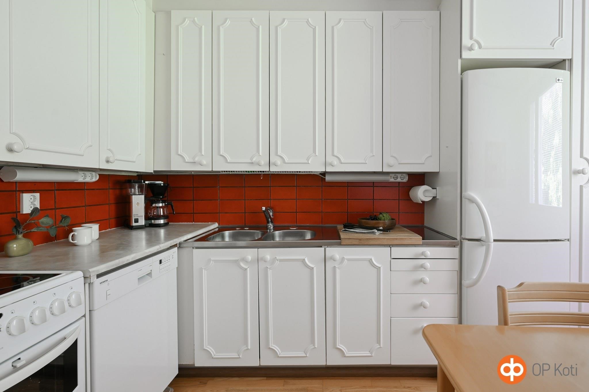 - Jääkaappipakastin, keraaminen liesi, liesituuletin, astianpesukone, kaapistot, kiinteät valaisimet.