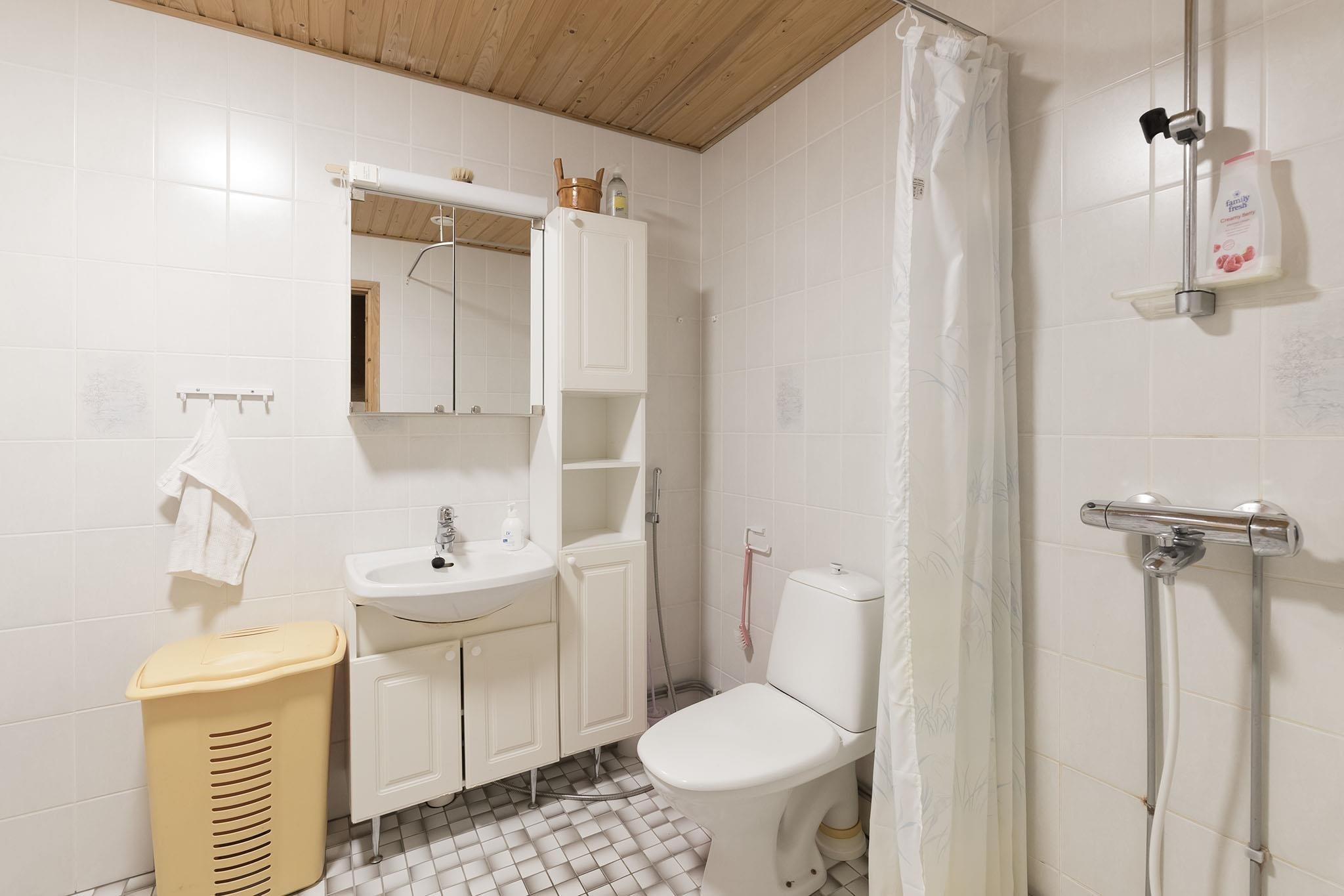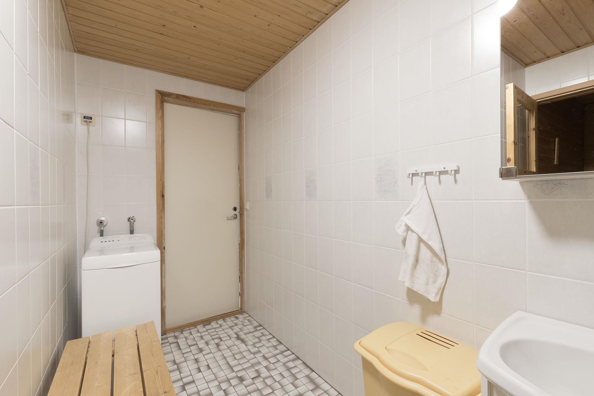 - Sauna, sähkökiuas, kylpyhuone, suihku, peilikaappi ph:ssa, allaskaappi ph:ssa, pesukoneliitäntä, kiinteät valaisimet.
