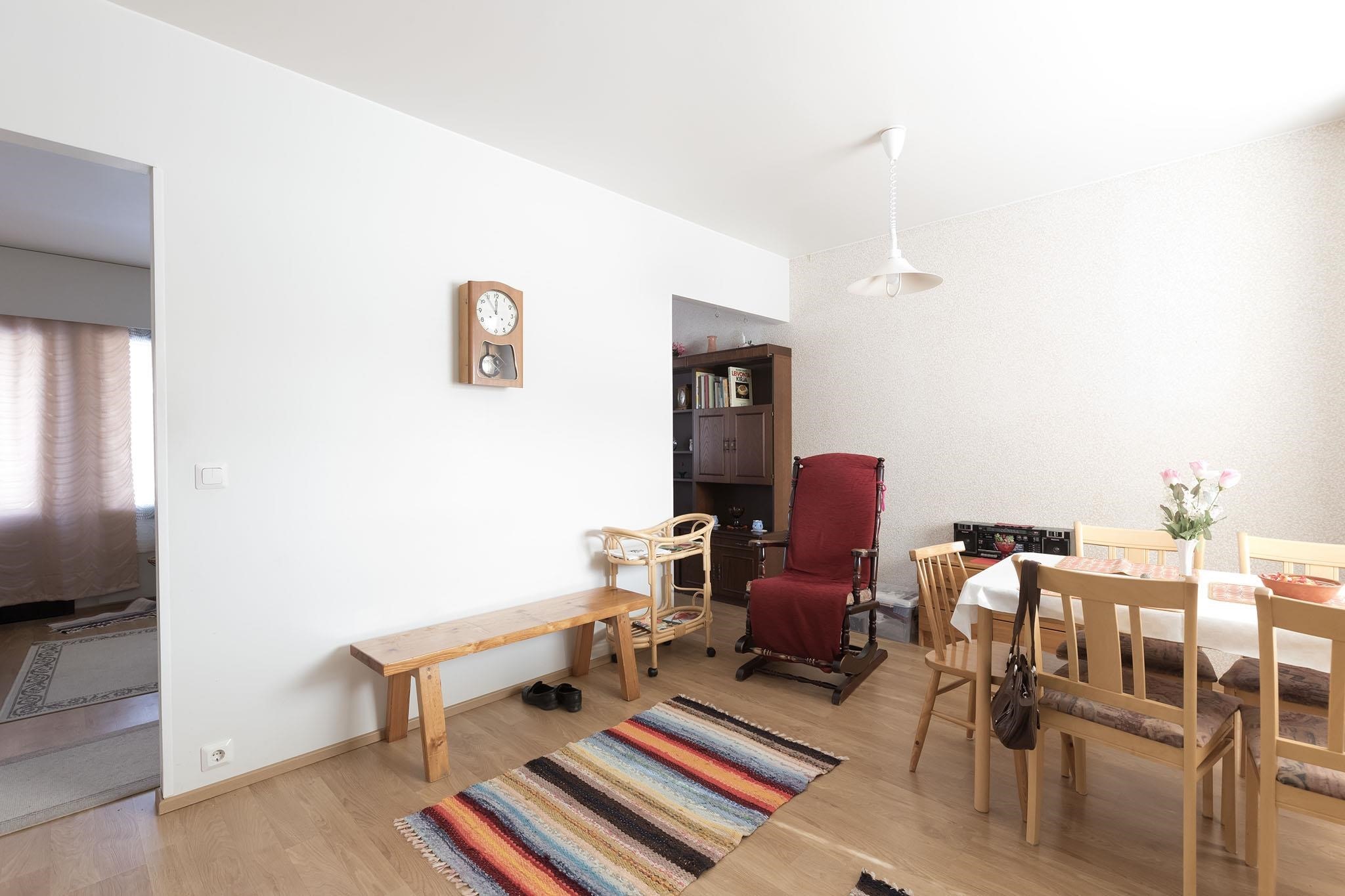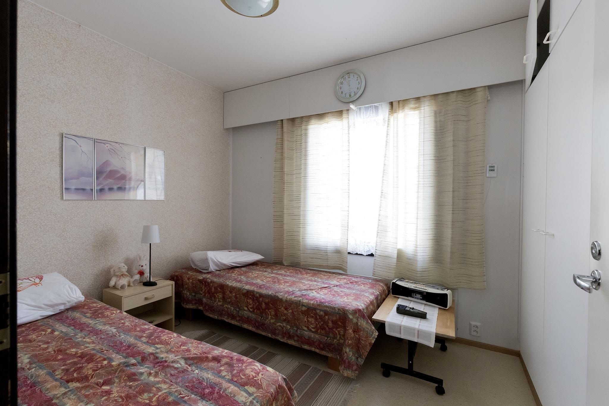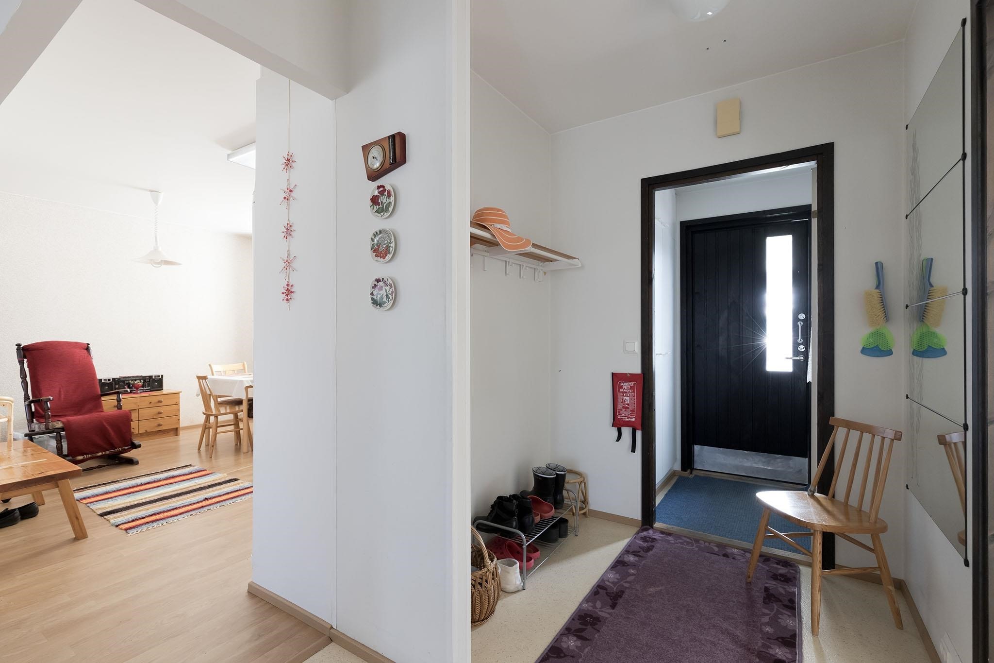Keittiö: Lattia laminaattia, seinät tapettia, maalia. Olohuone: Lattia laminaattia, seinät tapettia, maalia. Makuuhuone 1: Lattia muovia, seinät tapettia. Makuuhuone 2: Lattia muovia, seinät tapettia, maalia. Sauna: Lattia laattaa, seinät puuta. Kylpyhuone: Lattia ja seinät laattaa. Eteinen: Lattia muovia.