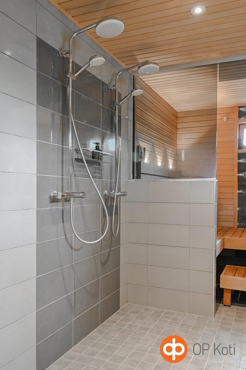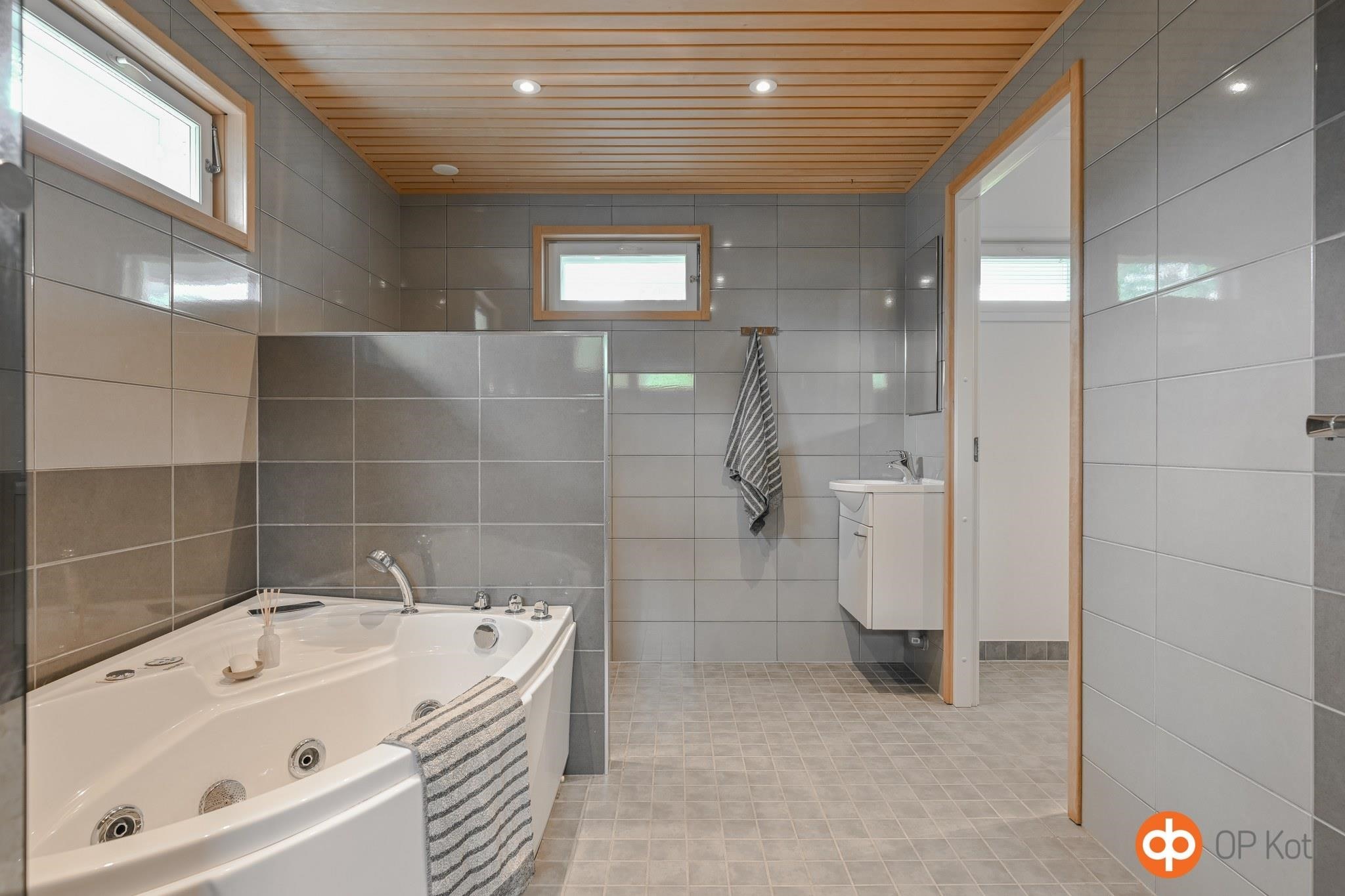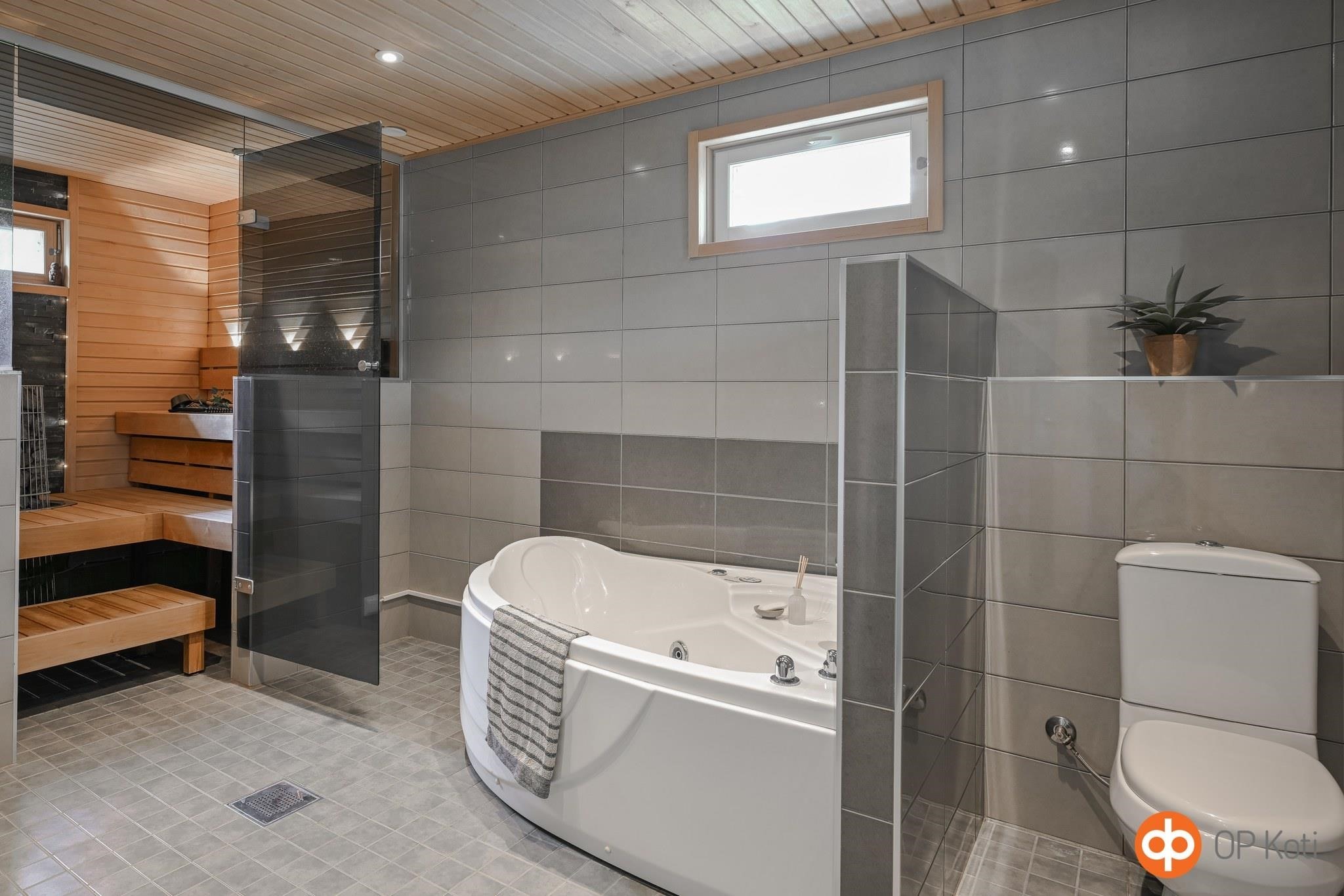 - Sauna, sähkökiuas, erillinen wc x3, suihku x2, poreallas, peilit, allaskaappi, pesukoneliitäntä, lattialämmitys, kiinteät valaisimet. Kaksi erillistä wc -tilaa sekä kylpyhuoneen yhteydessä omansa