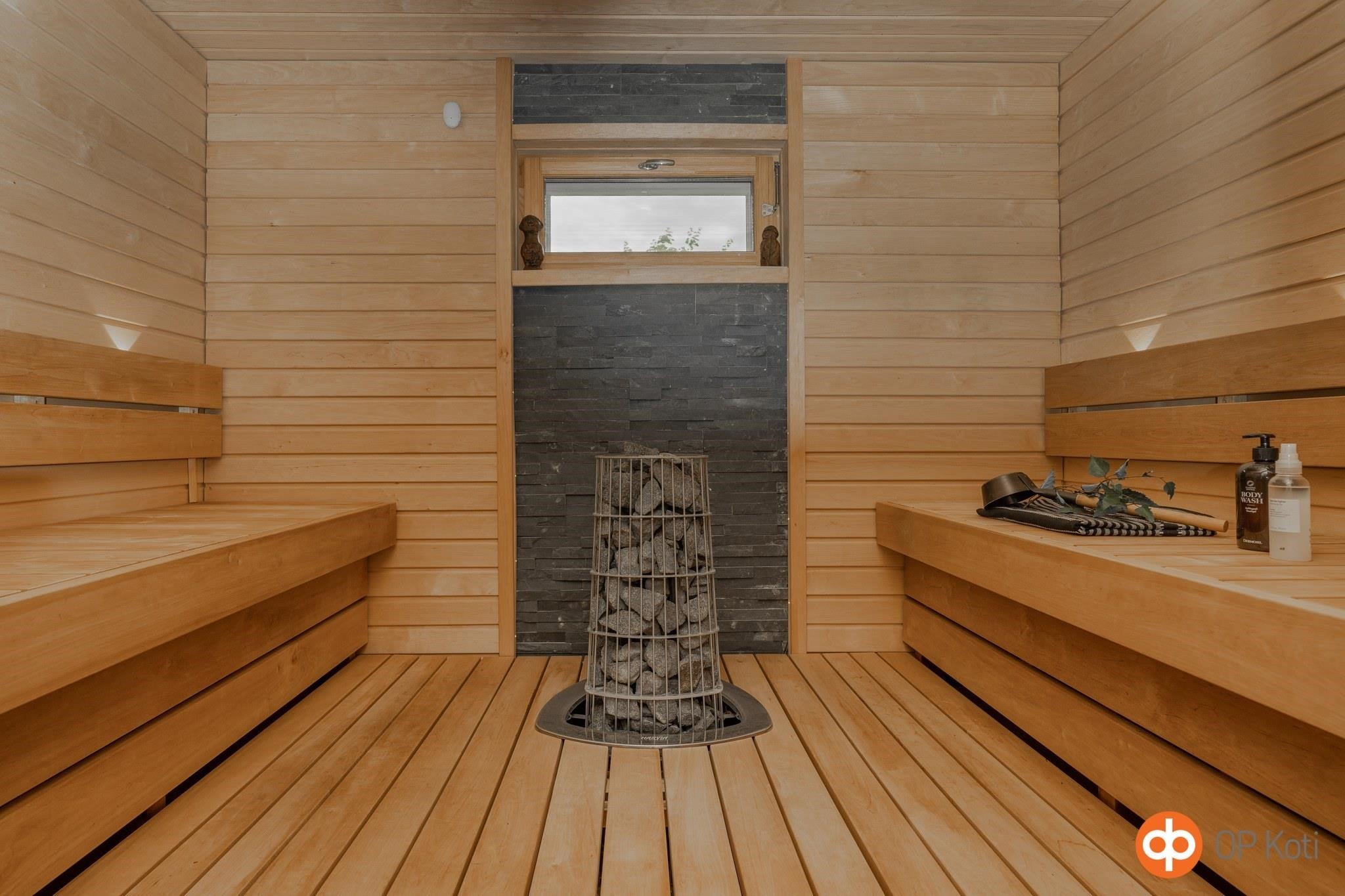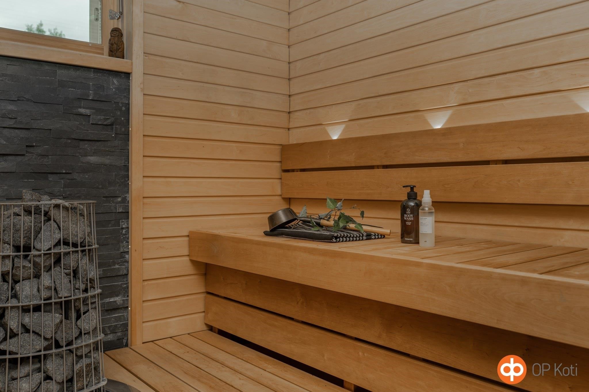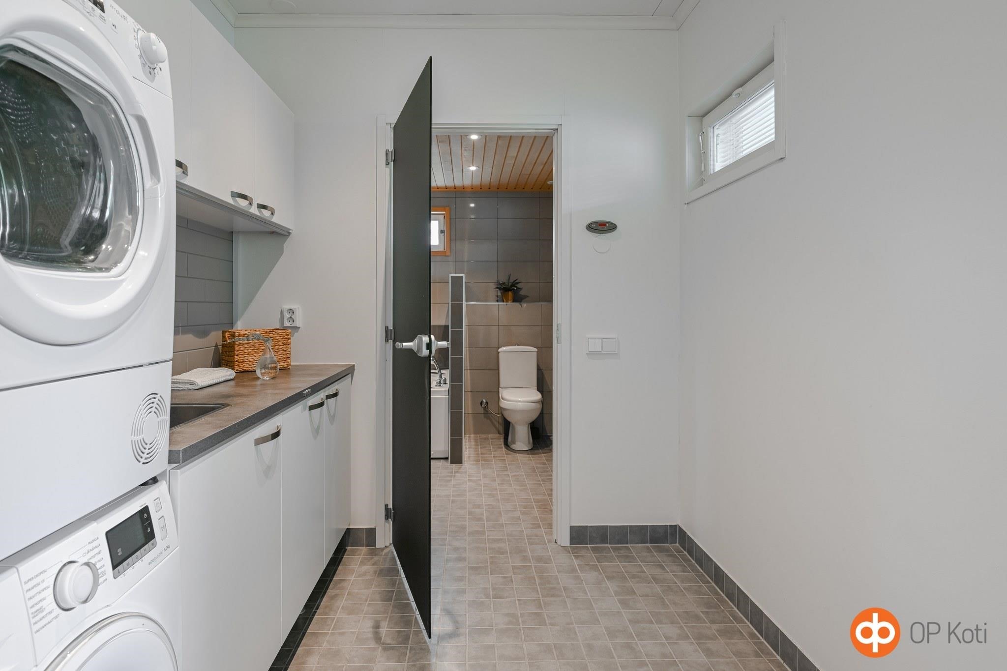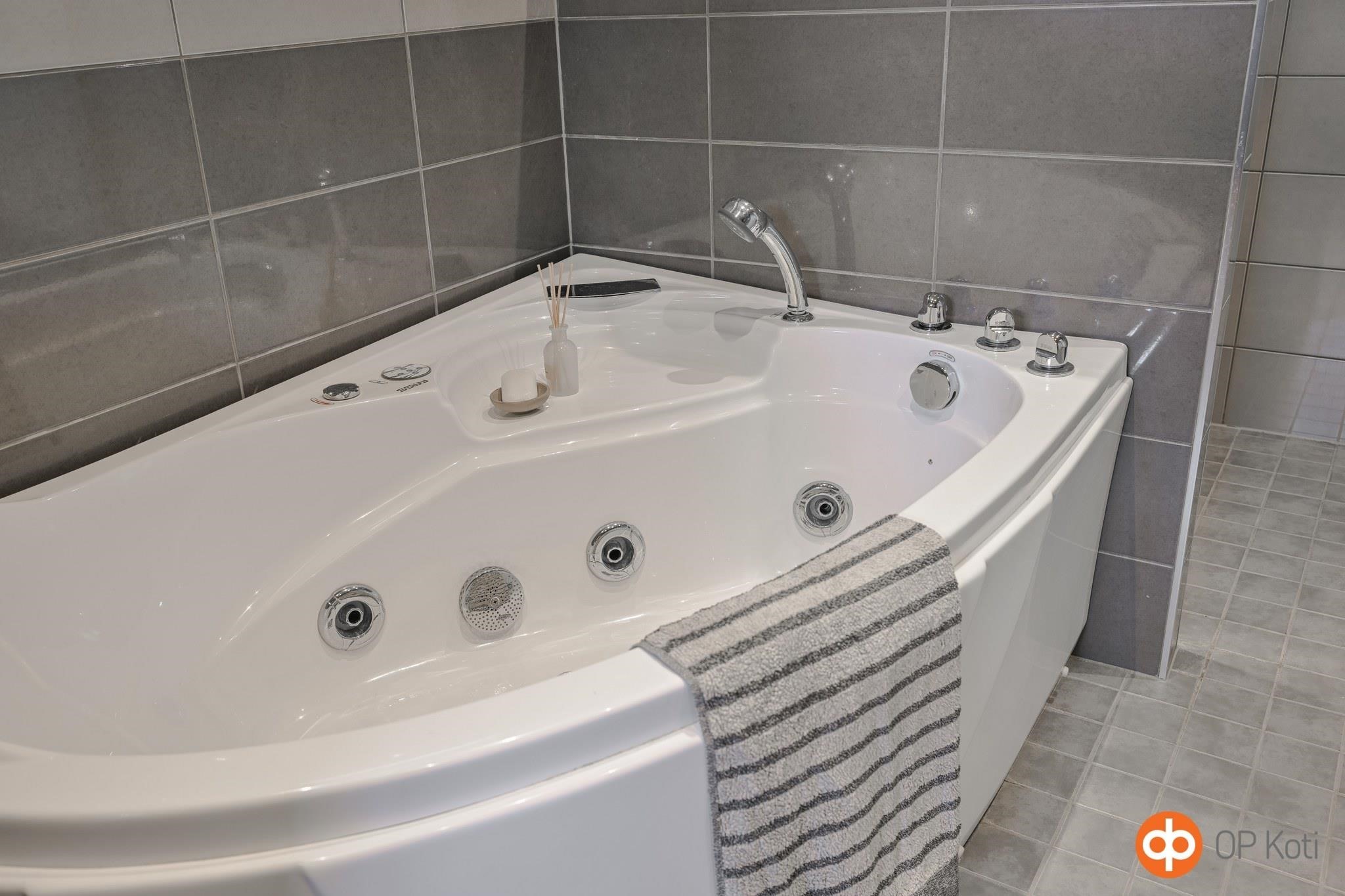 - Sauna, sähkökiuas, erillinen wc x3, suihku x2, poreallas, peilit, allaskaappi, pesukoneliitäntä, lattialämmitys, kiinteät valaisimet. Kaksi erillistä wc -tilaa sekä kylpyhuoneen yhteydessä omansa