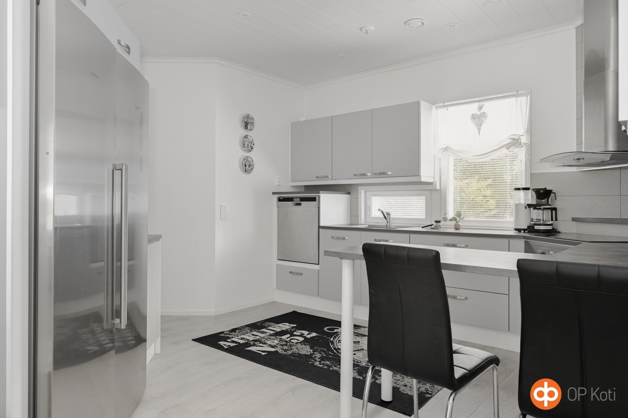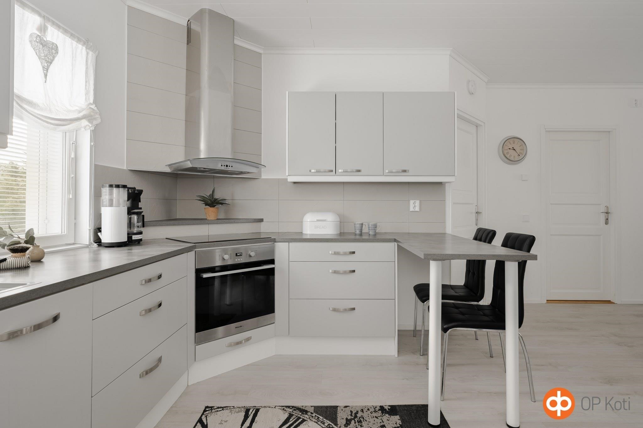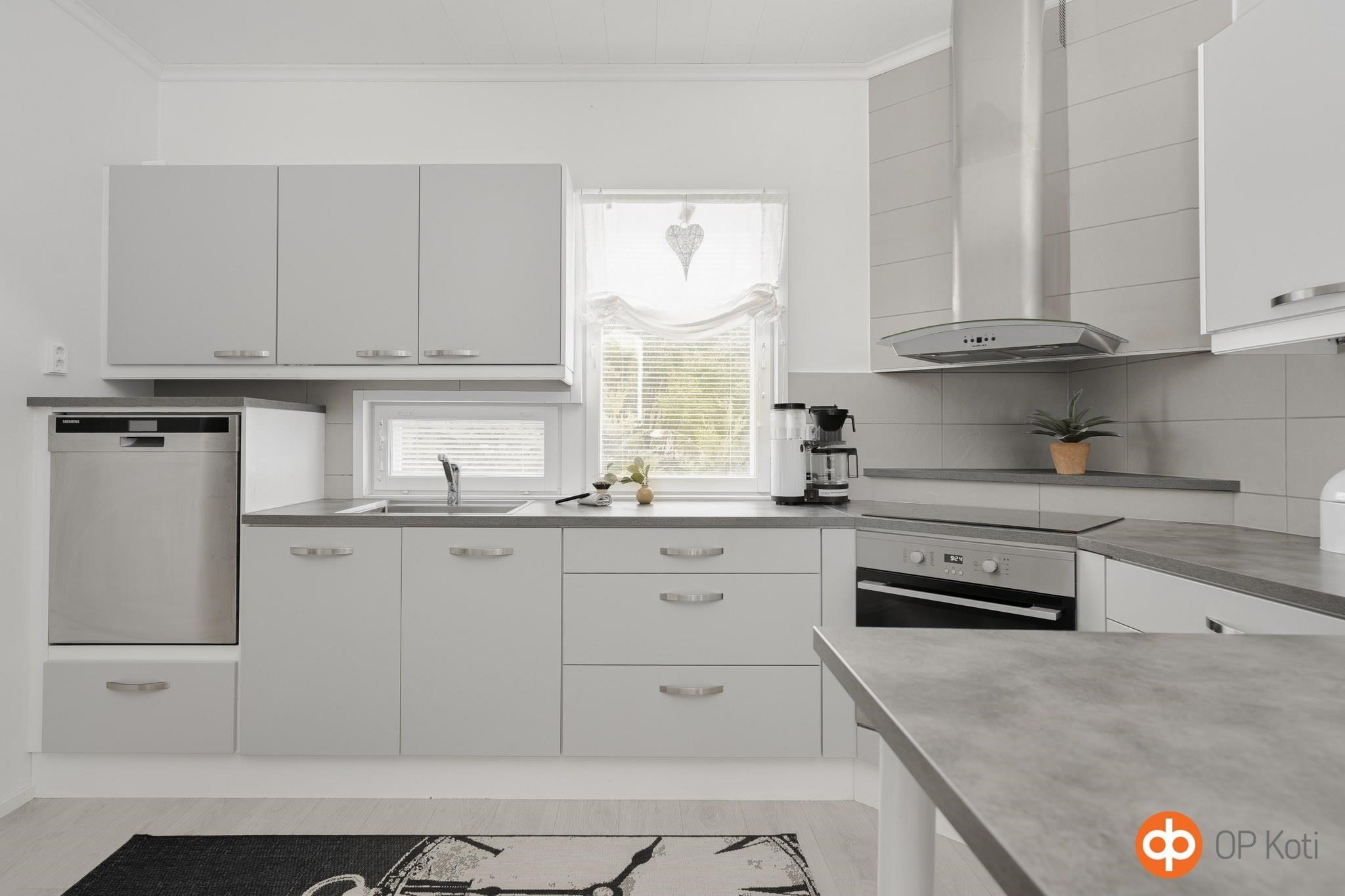- Jääkaappi, pakastekaappi, erillisuuni, liesitaso, induktioliesi, liesituuletin, astianpesukone, kaapistot, kiinteät valaisimet, pöytätasojen materiaali laminaatti.