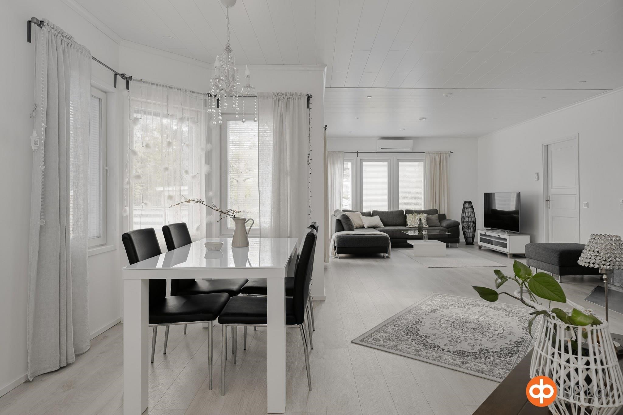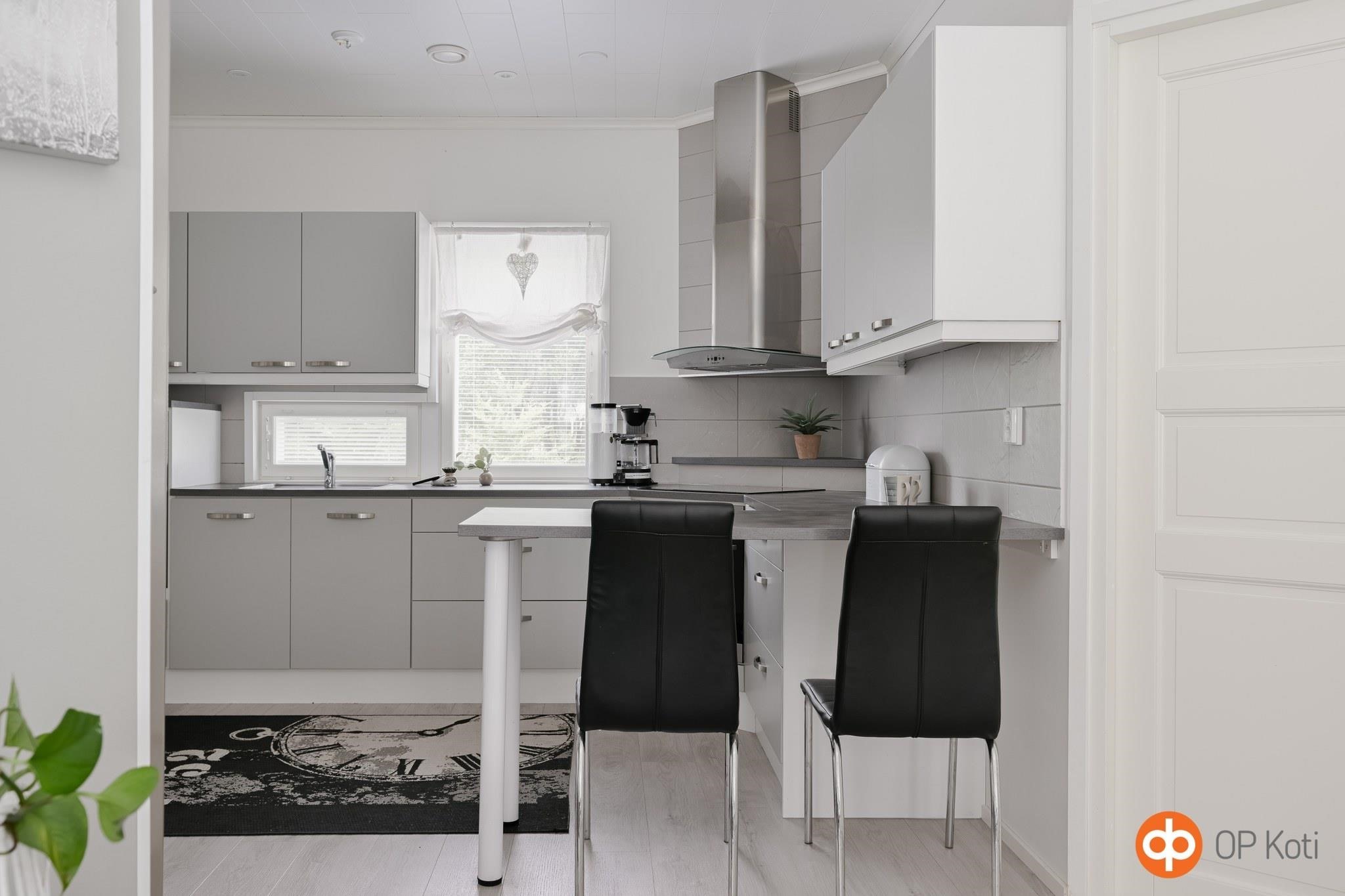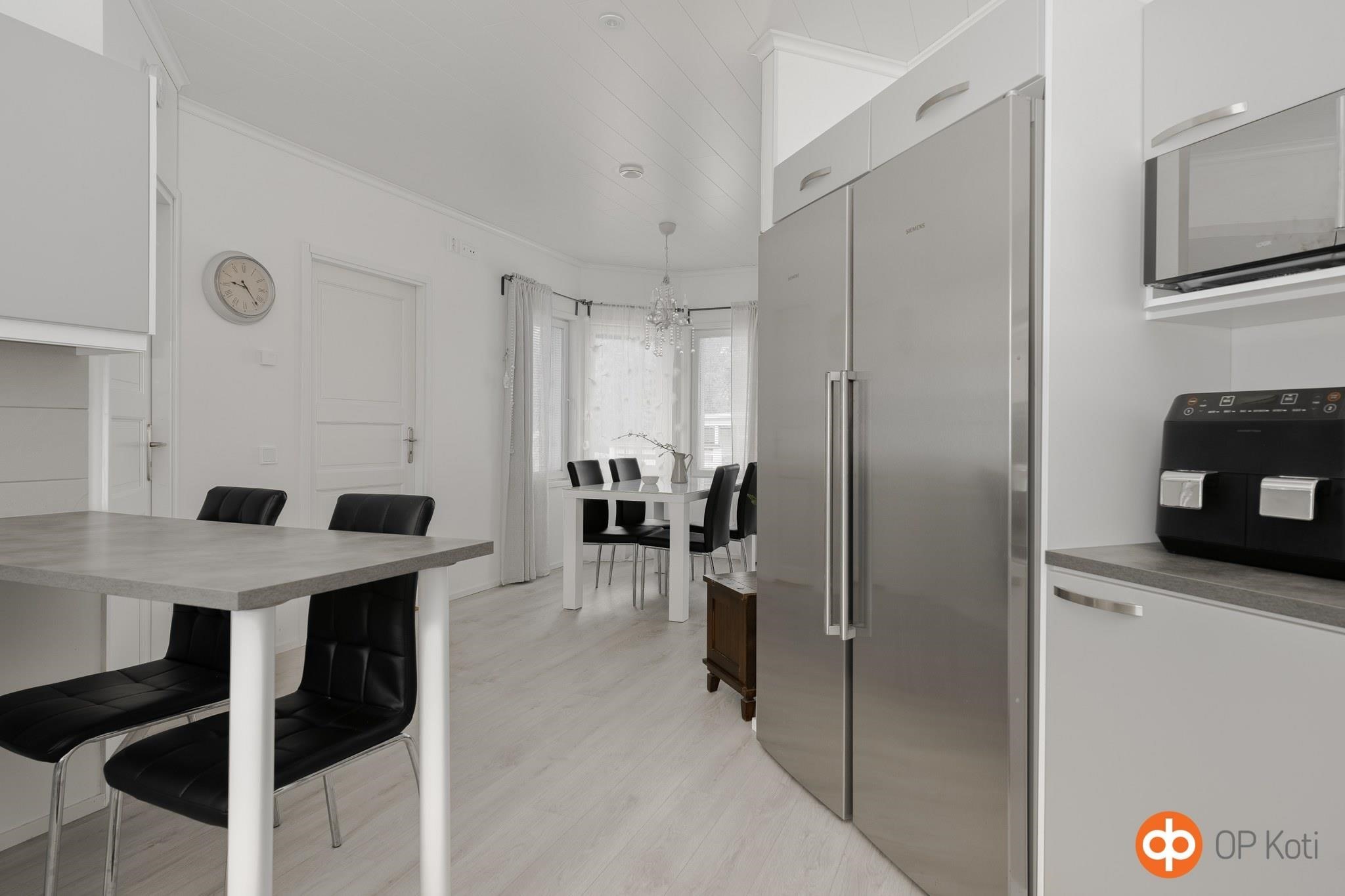 - Jääkaappi, pakastekaappi, erillisuuni, liesitaso, induktioliesi, liesituuletin, astianpesukone, kaapistot, kiinteät valaisimet, pöytätasojen materiaali laminaatti.