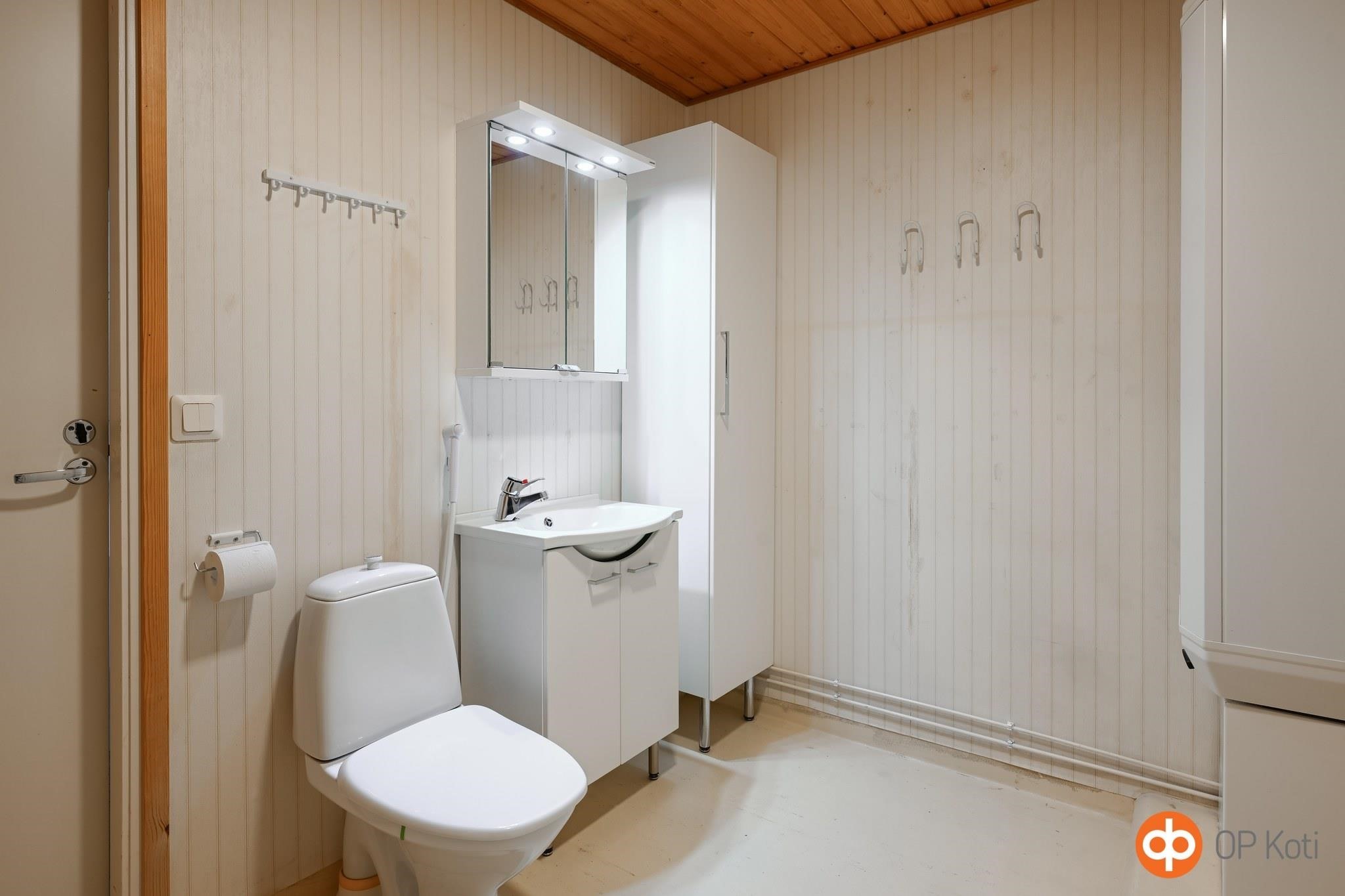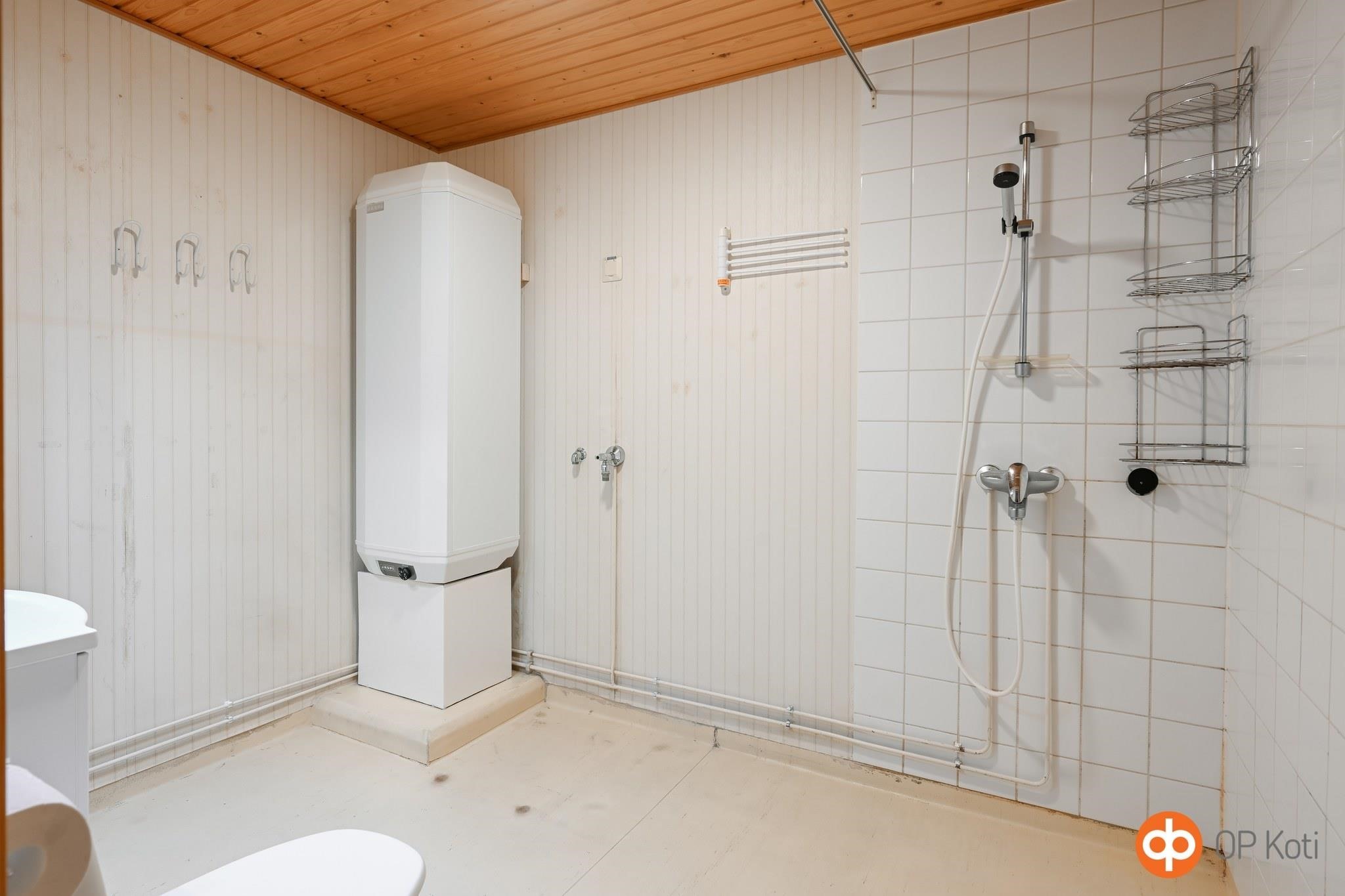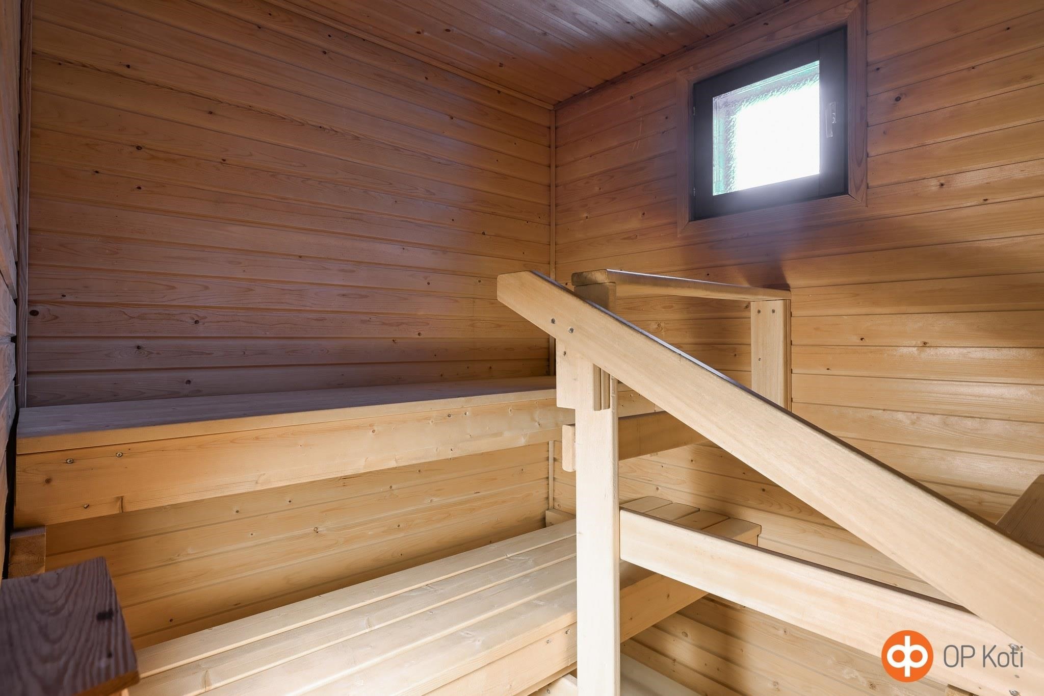 - Sauna, sähkökiuas, kylpyhuone, suihku, peilit, kaapit, allaskaappi, pesukoneliitäntä, kiinteät valaisimet.