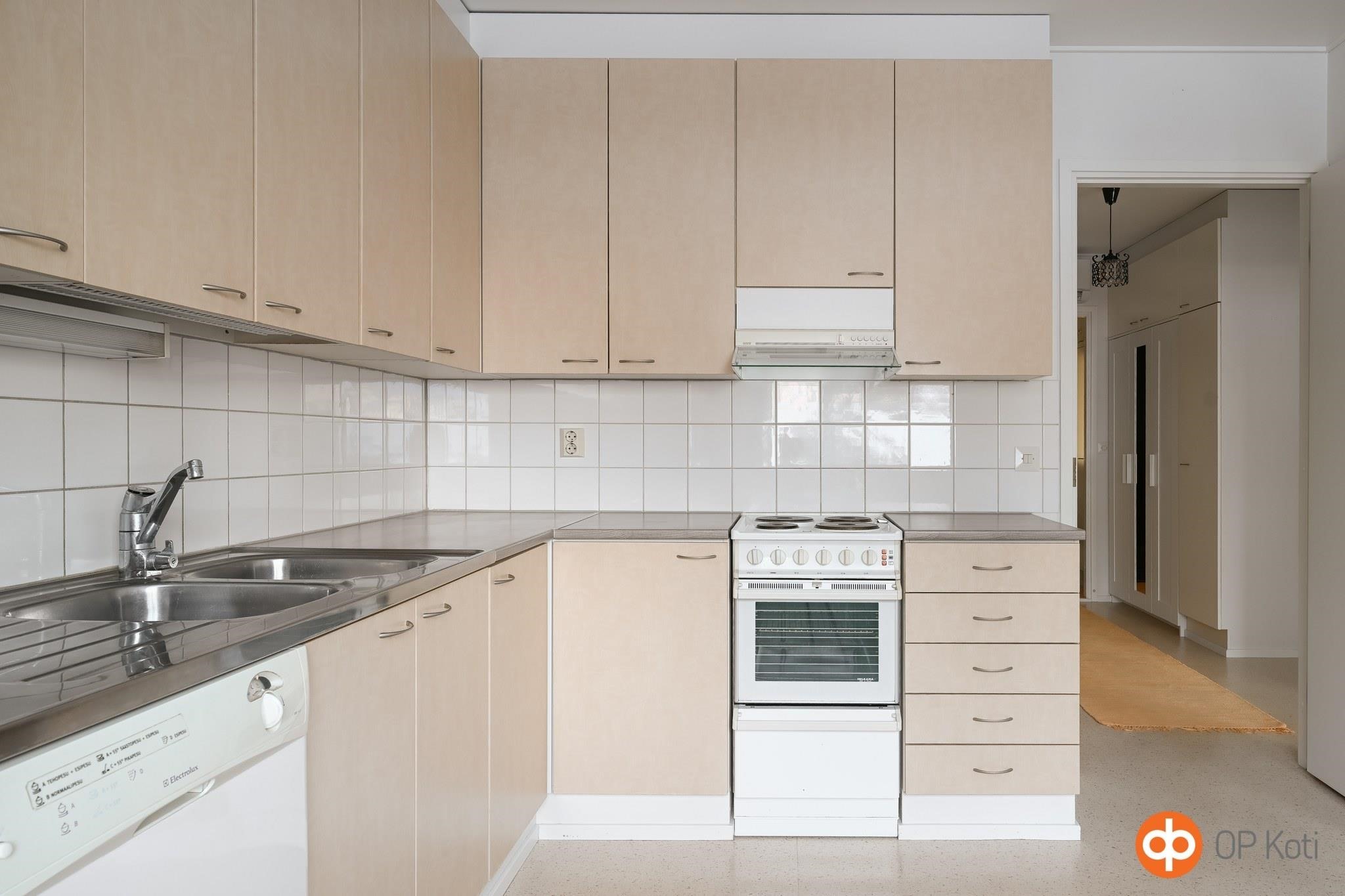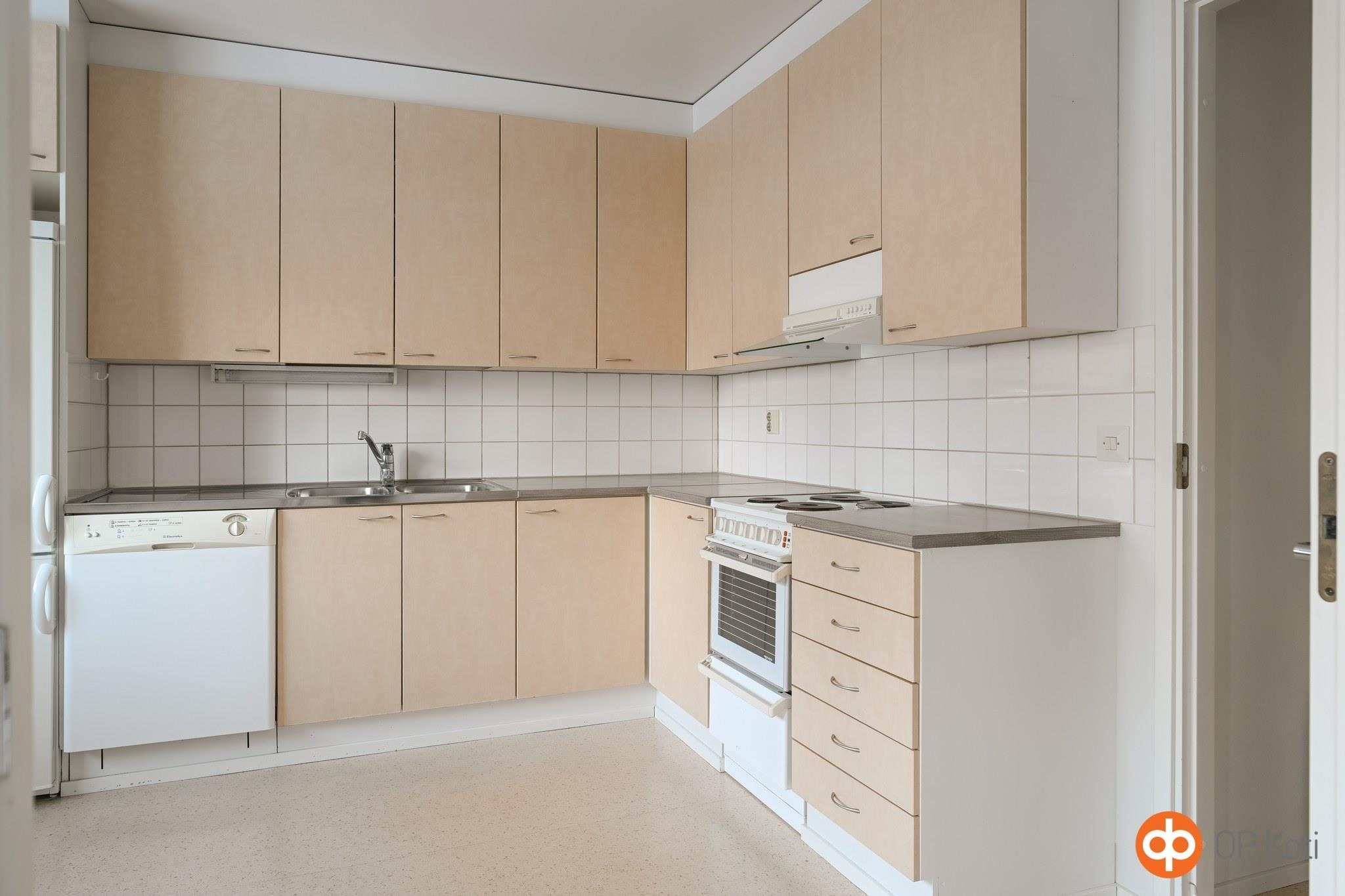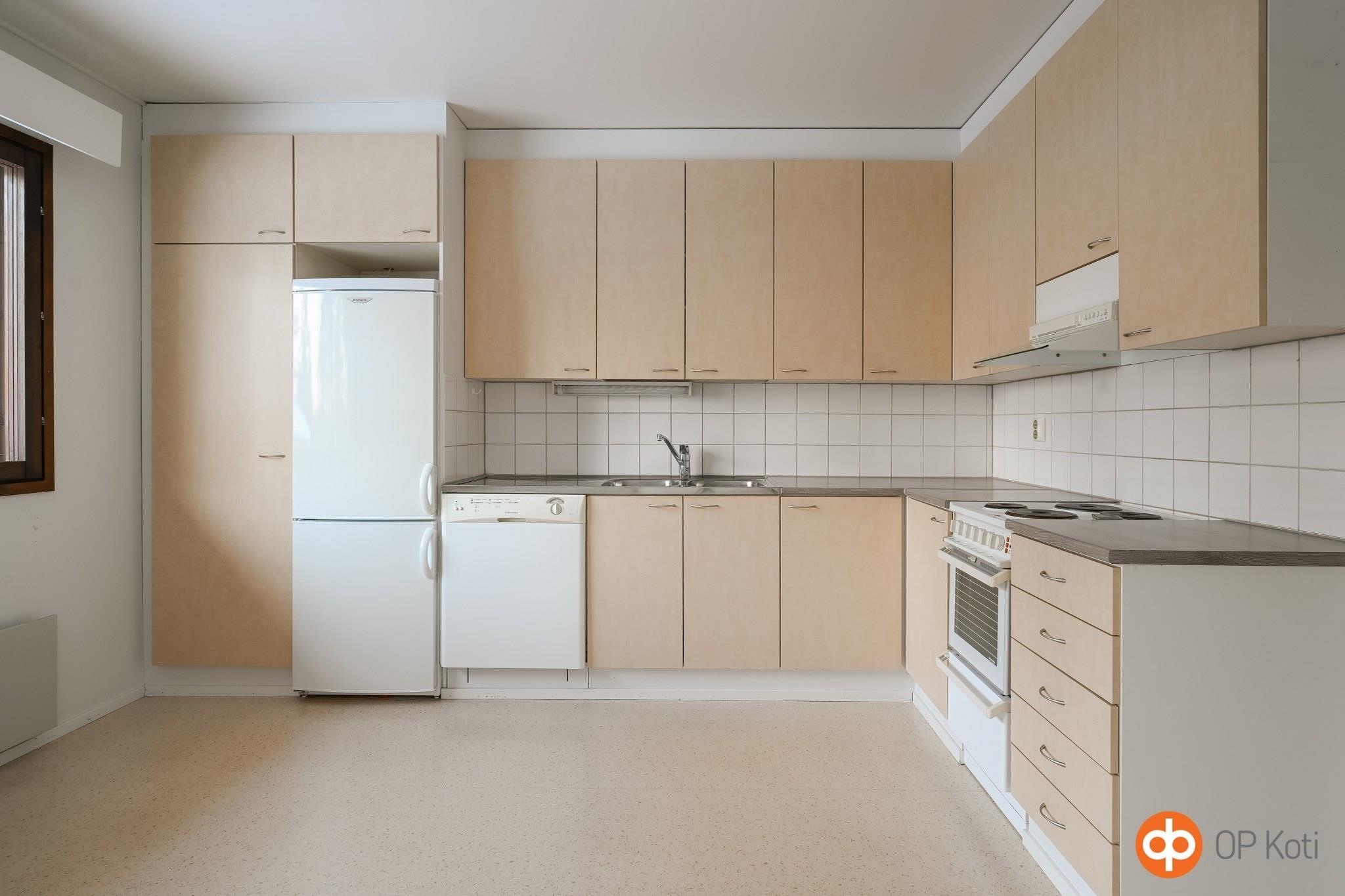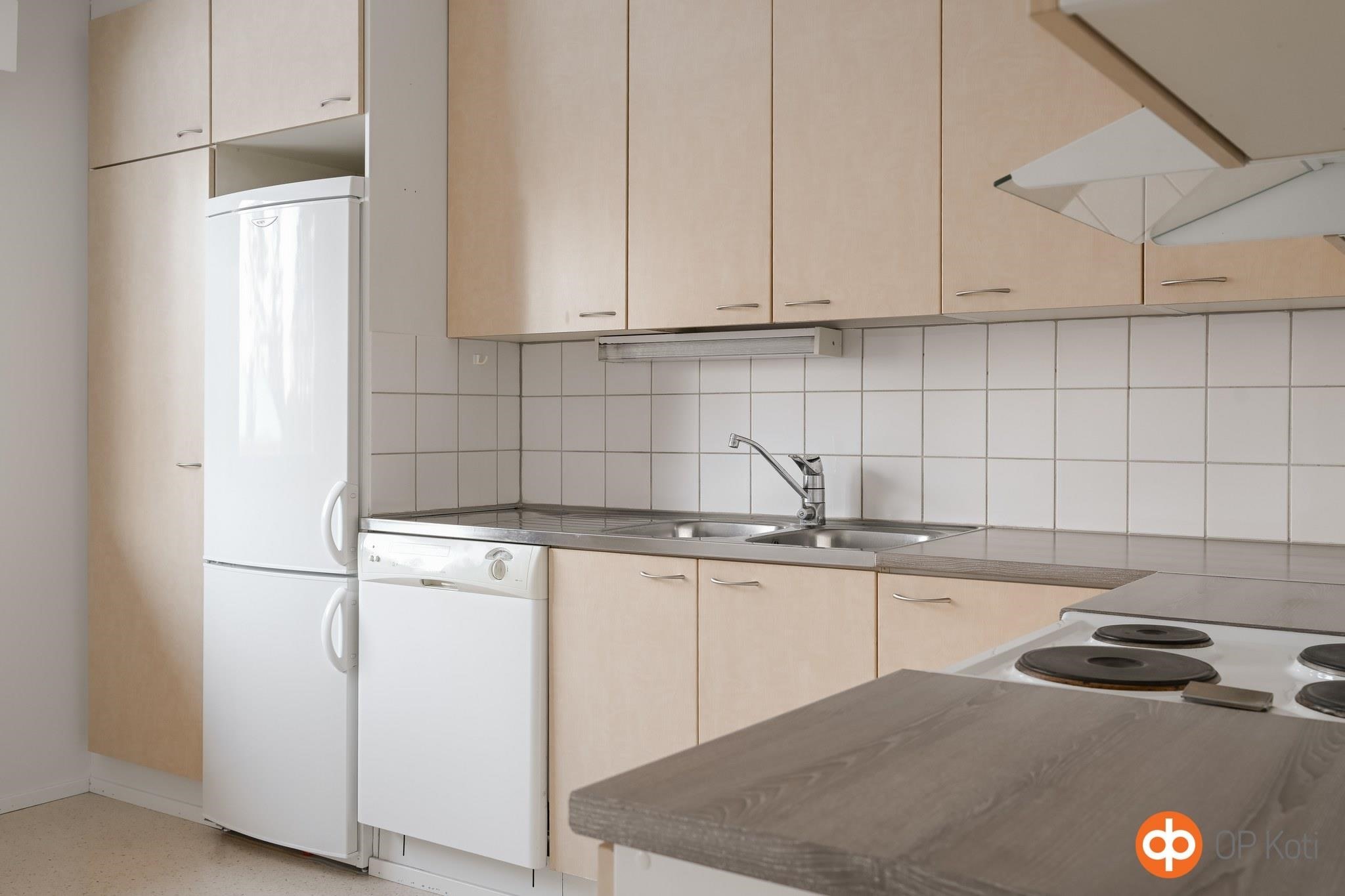 - Jääkaappipakastin, sähköliesi, liesituuletin, astianpesukone, kaapistot, kiinteät valaisimet.