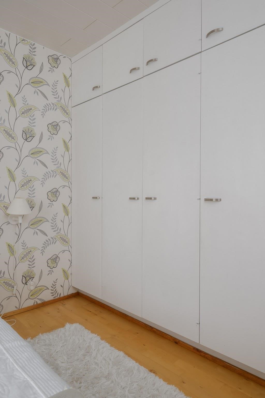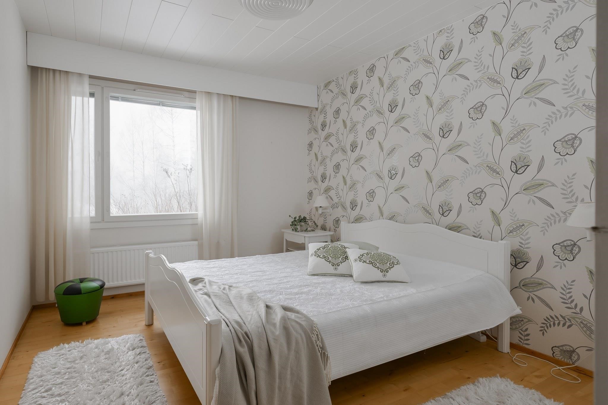 Keittiö: Lattia laminaattia (alla muovimatto), seinät tapettia. Olohuone: Lattia laminaattia (alla koivuparketti), seinät. Makuuhuone 1: Lattia parkettia, seinät tapettia. Makuuhuone 2: Lattia parkettia, seinät tapettia. Makuuhuone 3: Lattia parkettia, seinät tapettia ja sisustuslevyä. Sauna: Lattia laattaa, seinät puuta. Kylpyhuone: Lattia ja seinät laattaa. Eteinen: Lattia laminaattia (alla koivuparketti), seinät maalia. Wc: Lattia ja seinät laattaa.