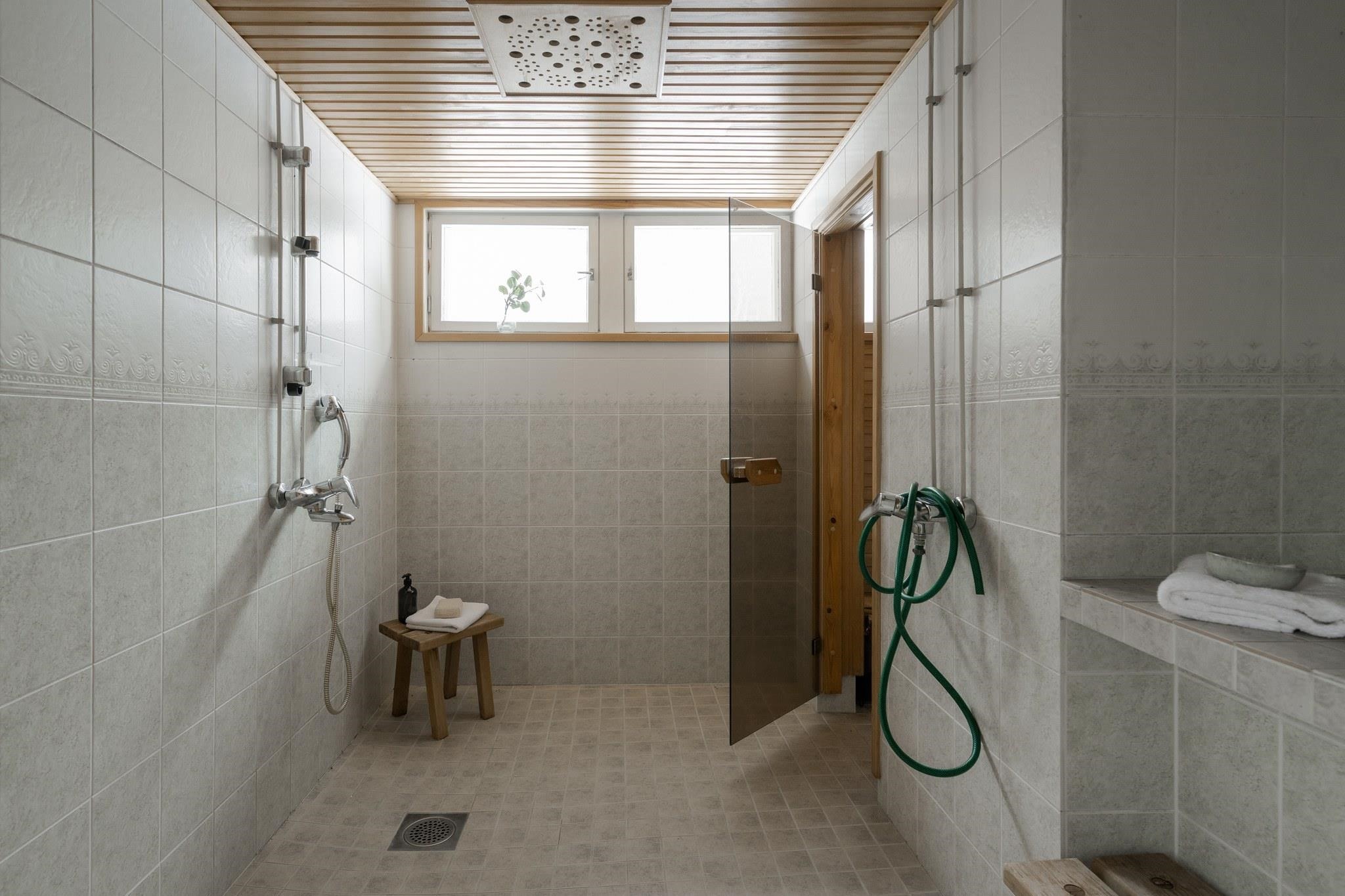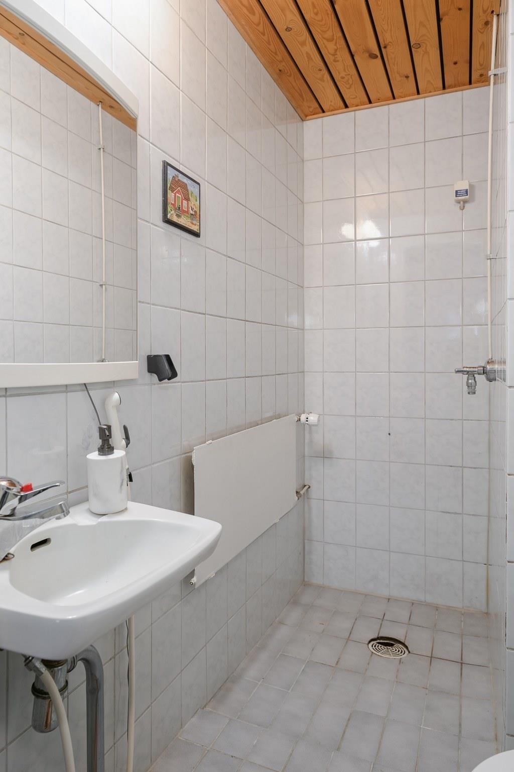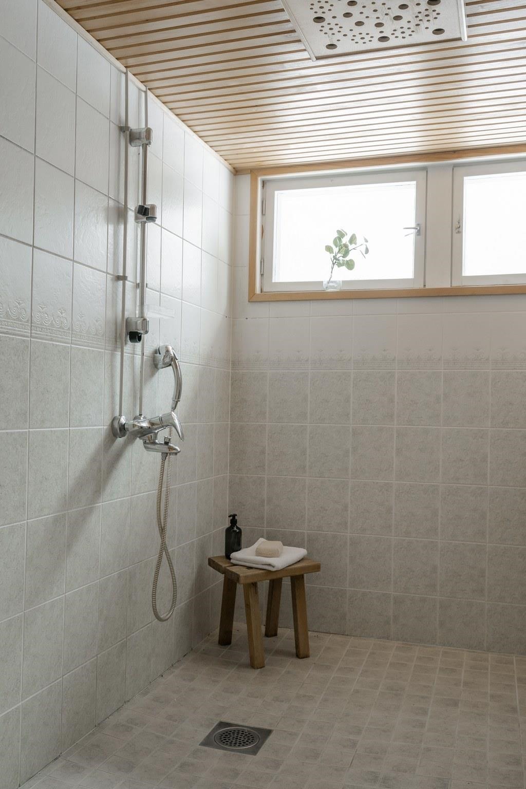 - Sauna, puukiuas, kylpyhuone, erillinen wc, suihku, peilit wc:ssa, pesukoneliitäntä wc:ssa, lattialämmitys, kiinteät valaisimet. Erillisessä pienessä kph:ssa lattia ja seinät laattaa, peili ja kaapistot. Kaapistojen alla on myös viemäri