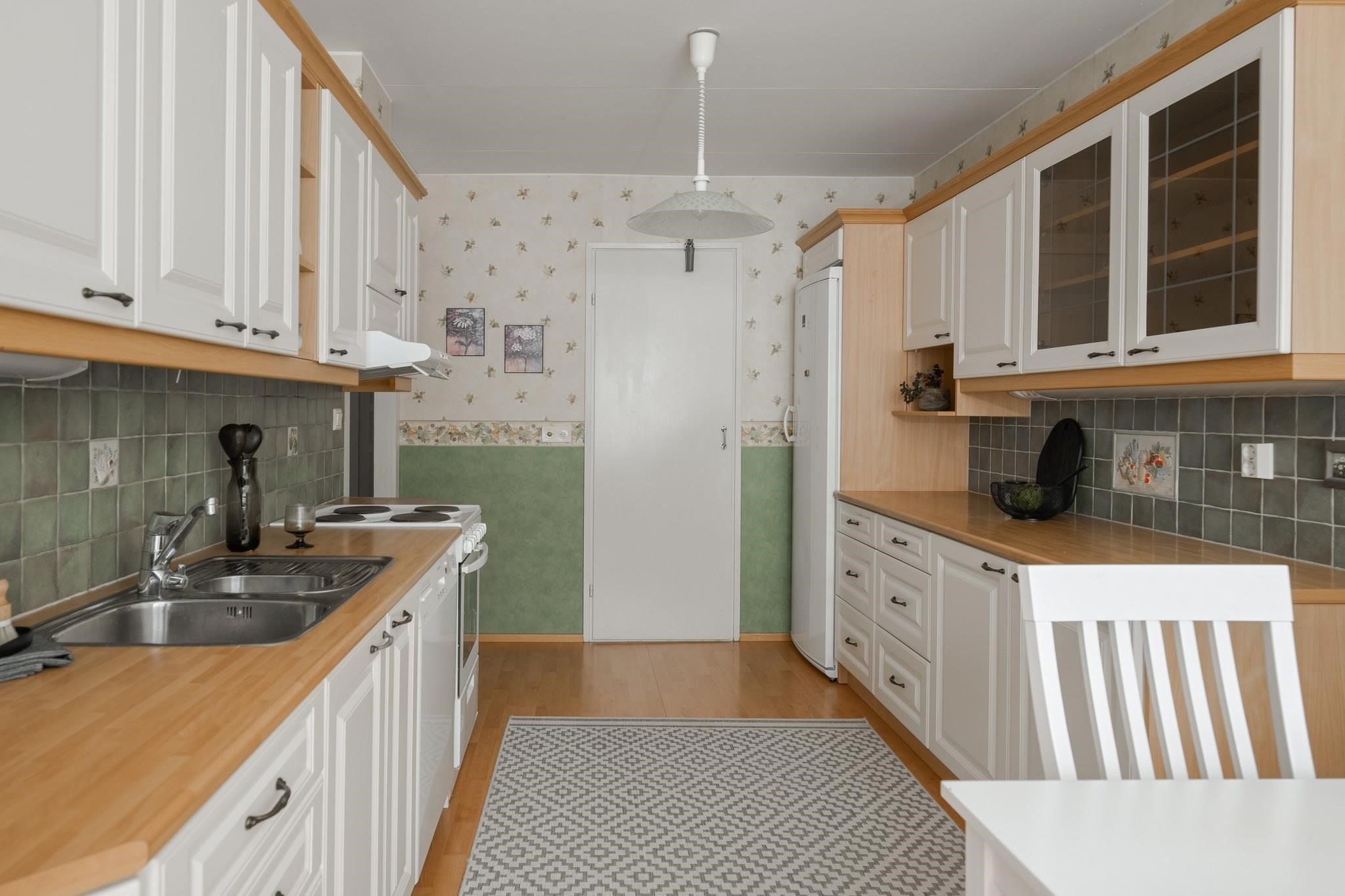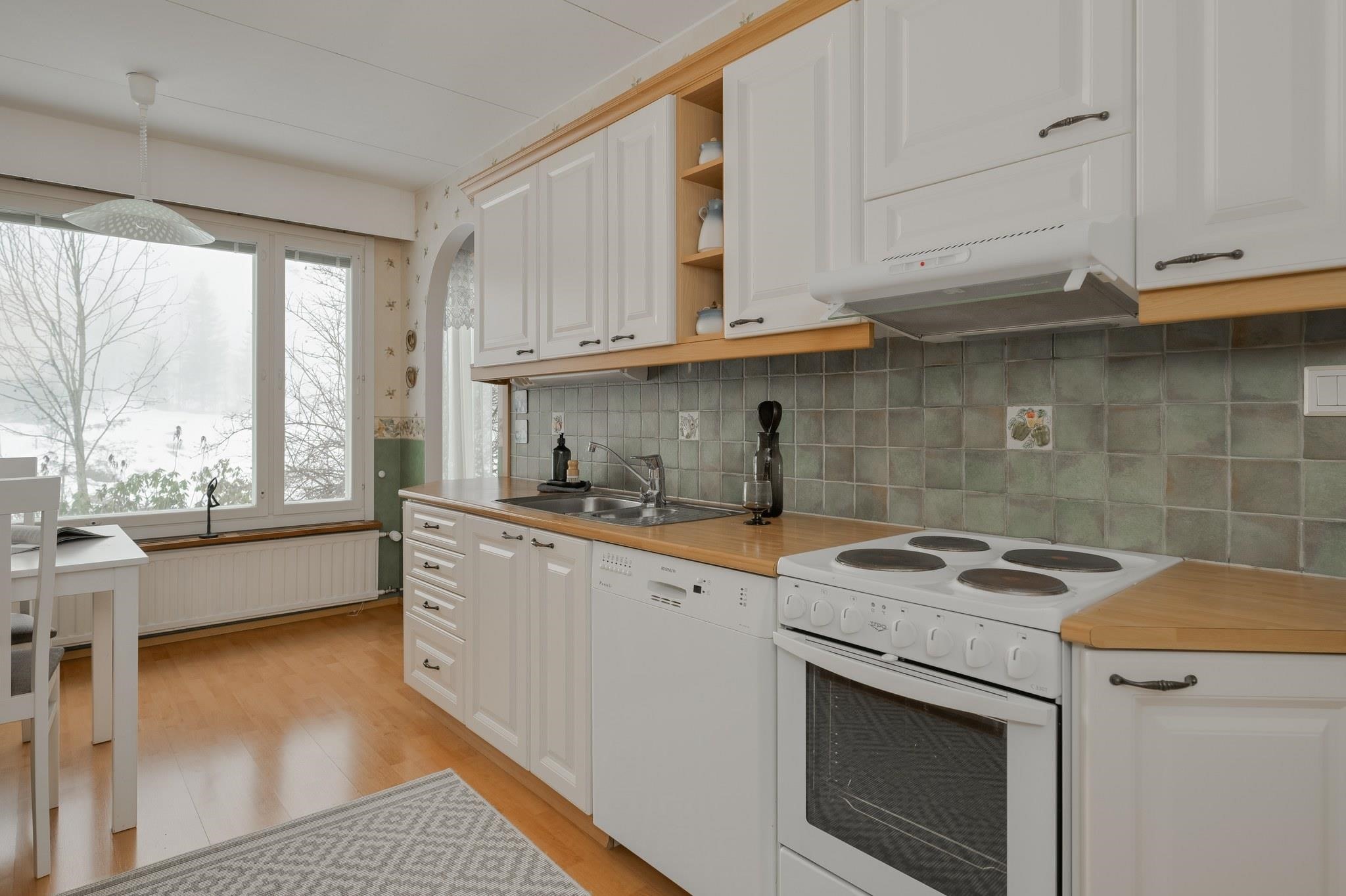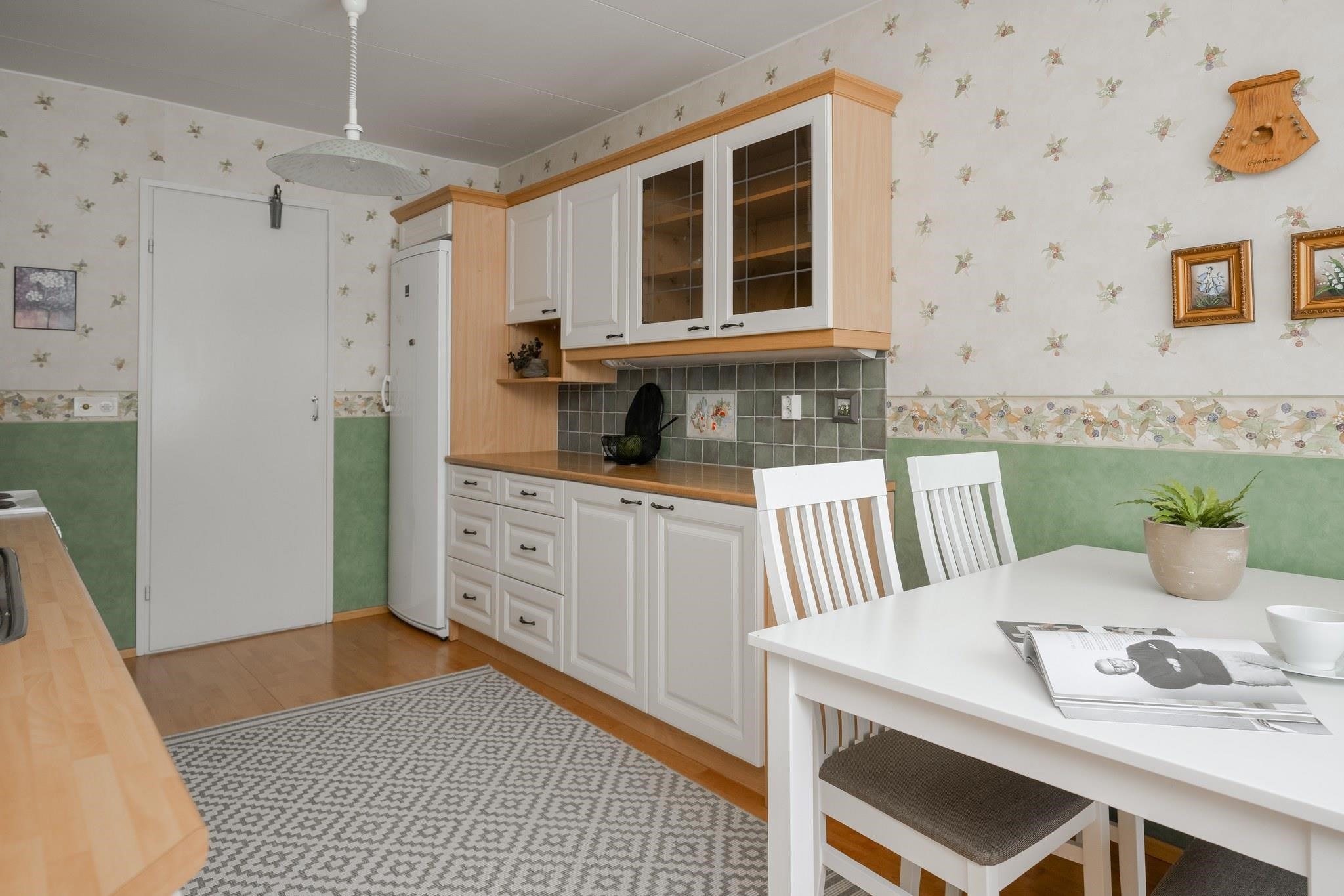 - Jääkaappi, sähköliesi, liesituuletin, astianpesukone, kaapistot, kiinteät valaisimet. Kylmäkomero