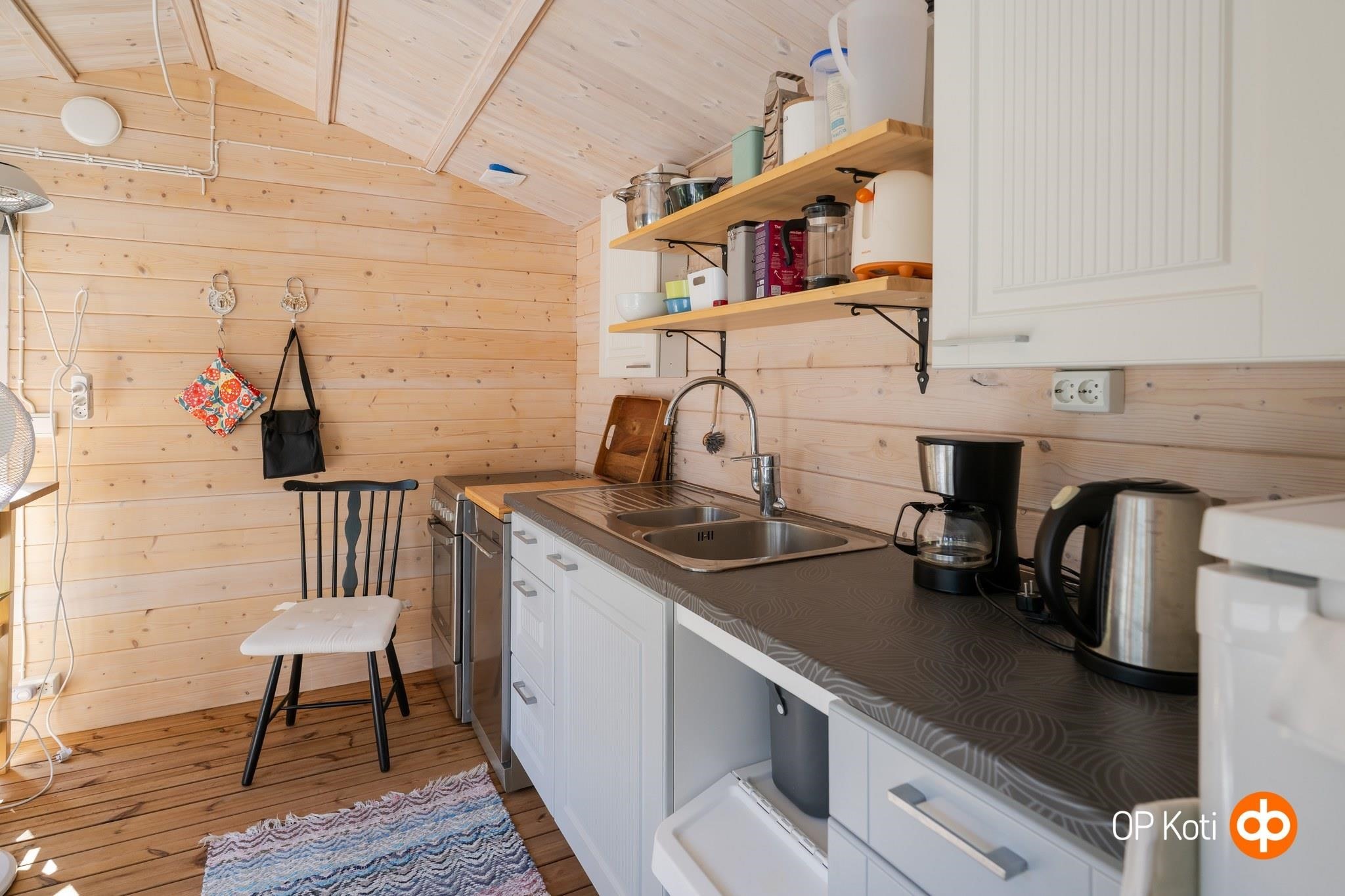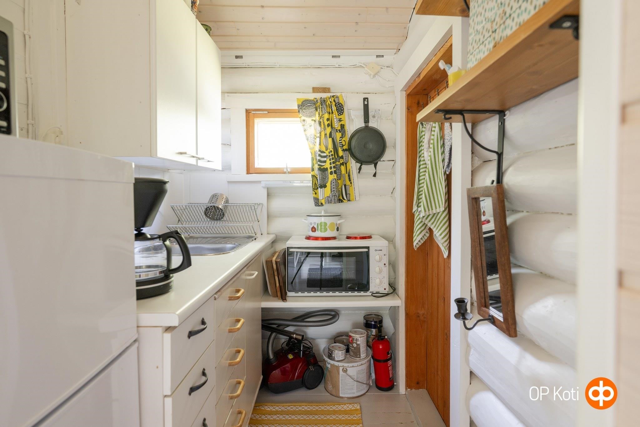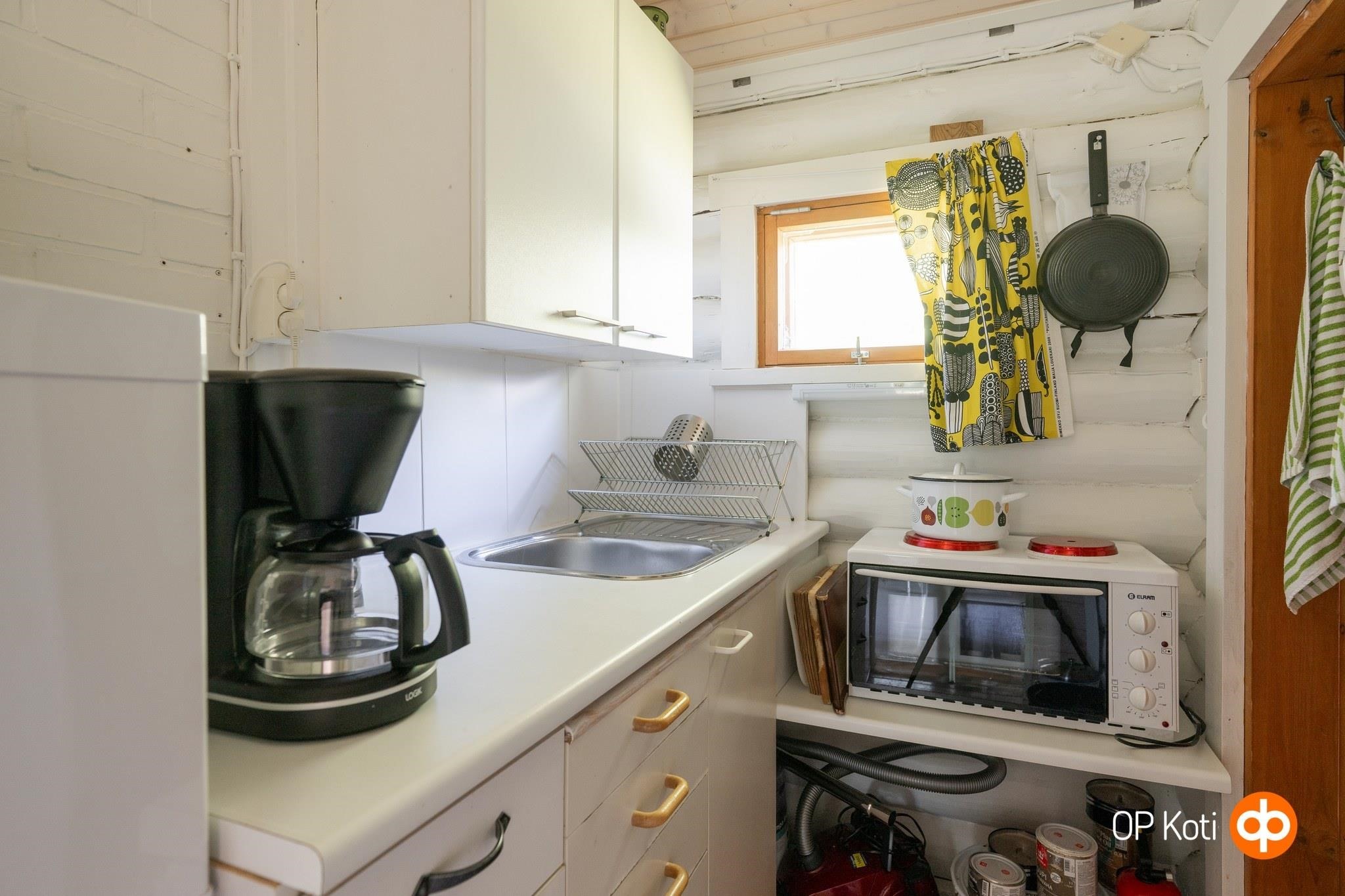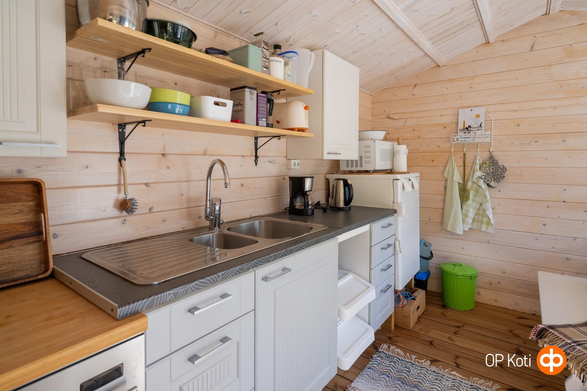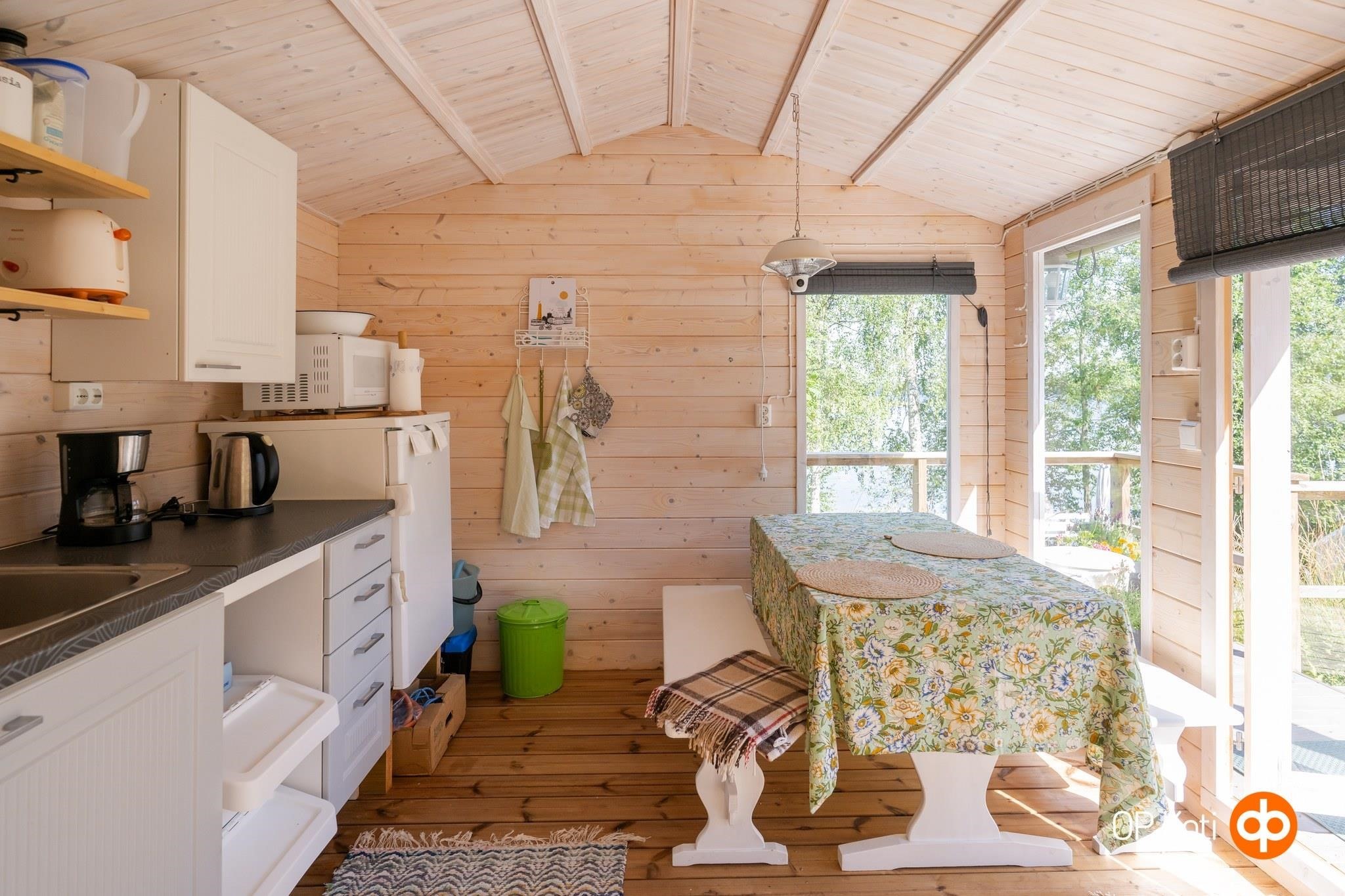 - Jääkaappi kesäkeittiössä, jenkkikaappi sisätiloissa, sähköliesi kesäkeittiössä, kaapistot. Mökkiuuni, 2 keittolevyä sisätiloissa