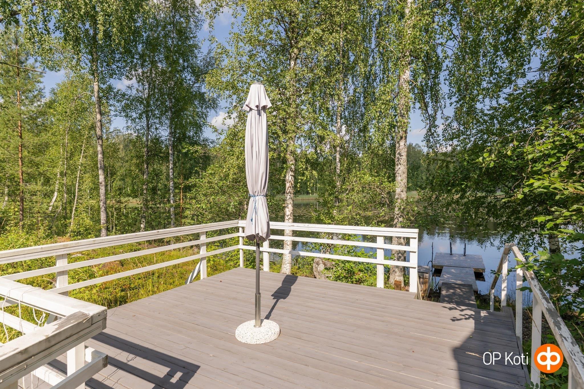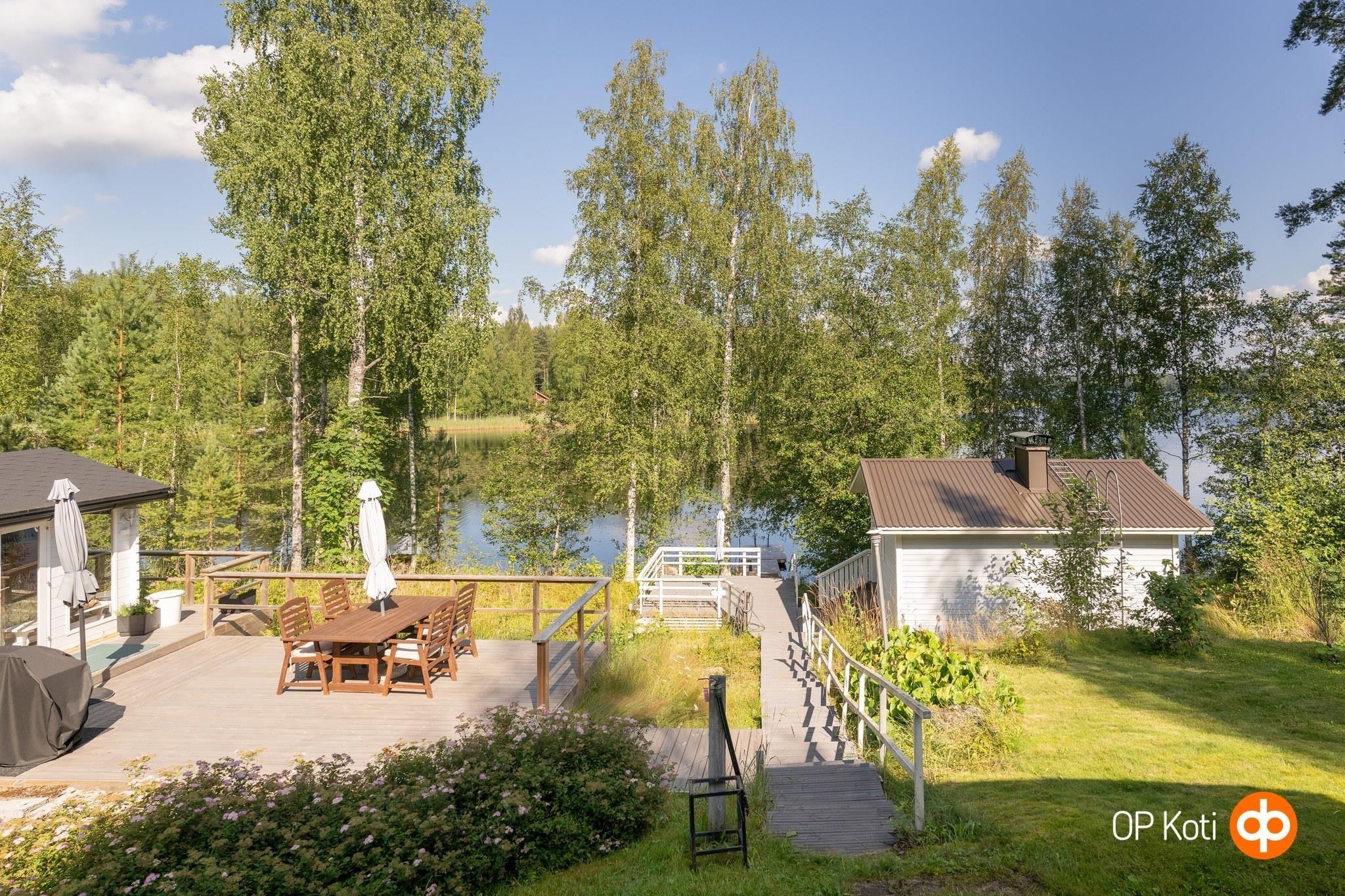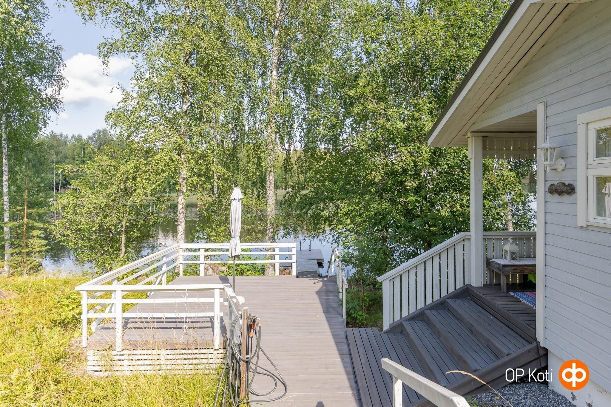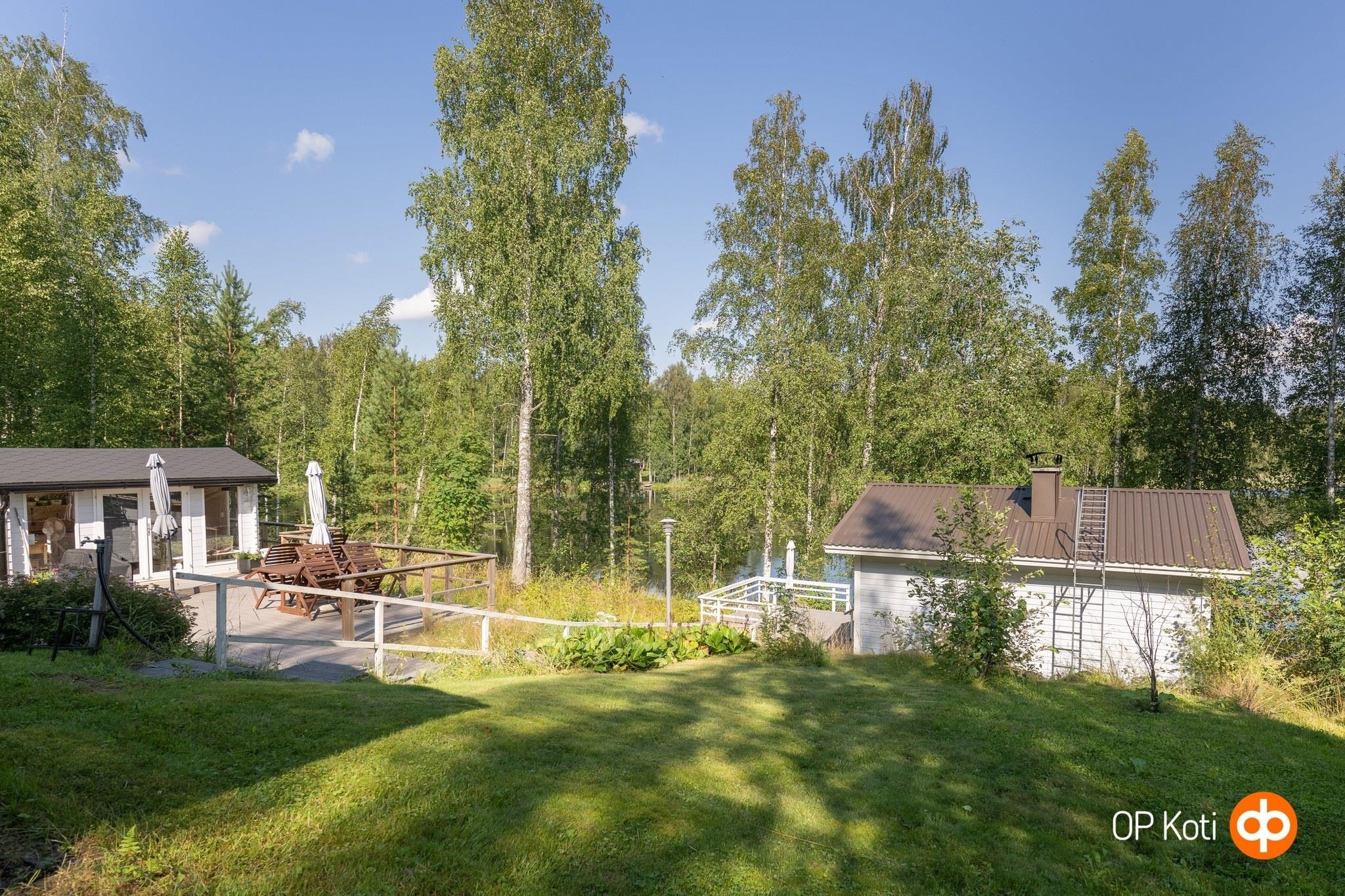 Pihapiiri on rantaan päin laskeva. Liikkumista helpottaa rakennetut portaikot kulkuväylineen sekä isot terassialueet. Pihapiiri on suojaisa ja pääosin luonnontilainen. Omalta pihalta keräät myös talven mustikat ja puolukat.