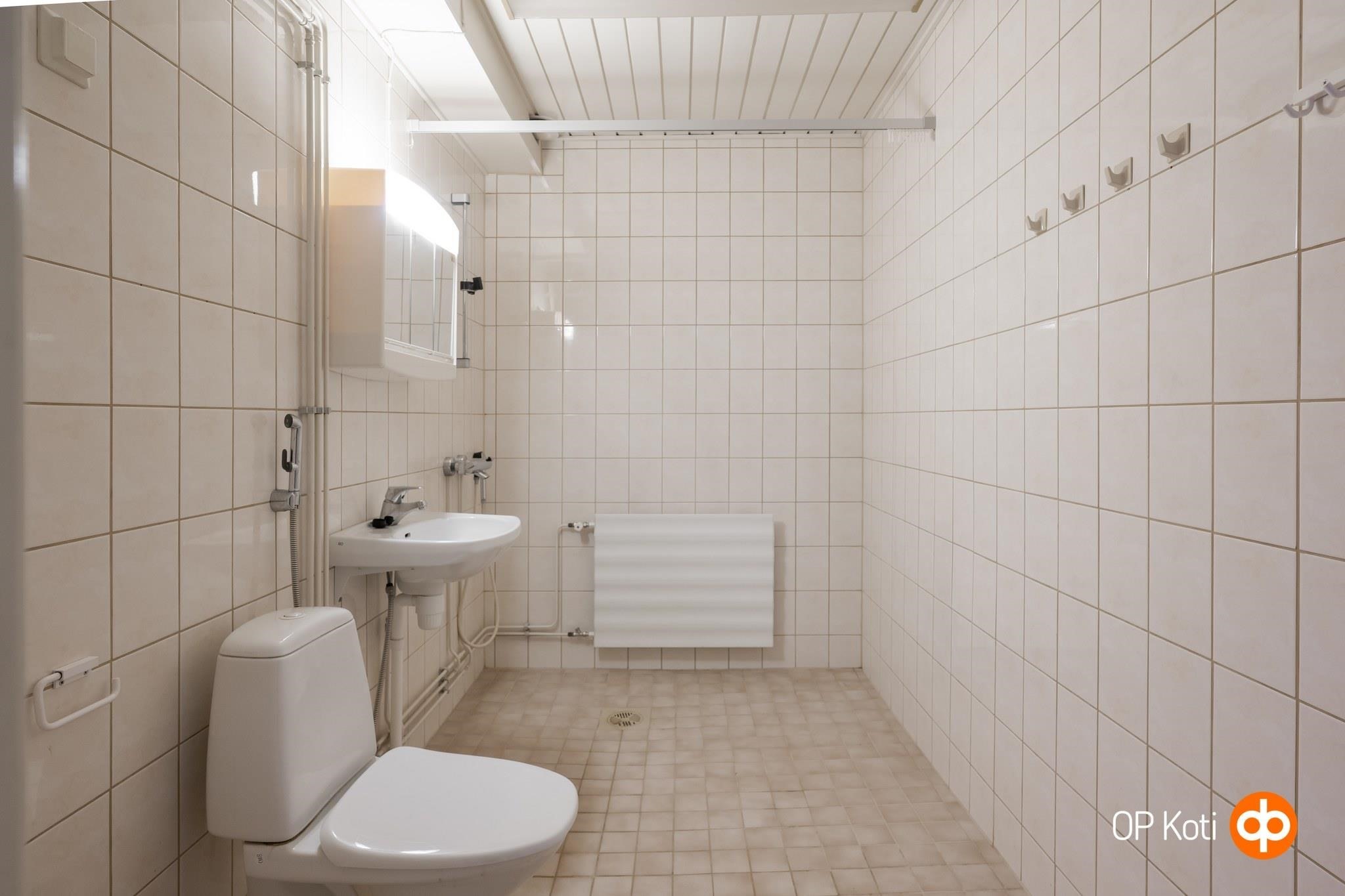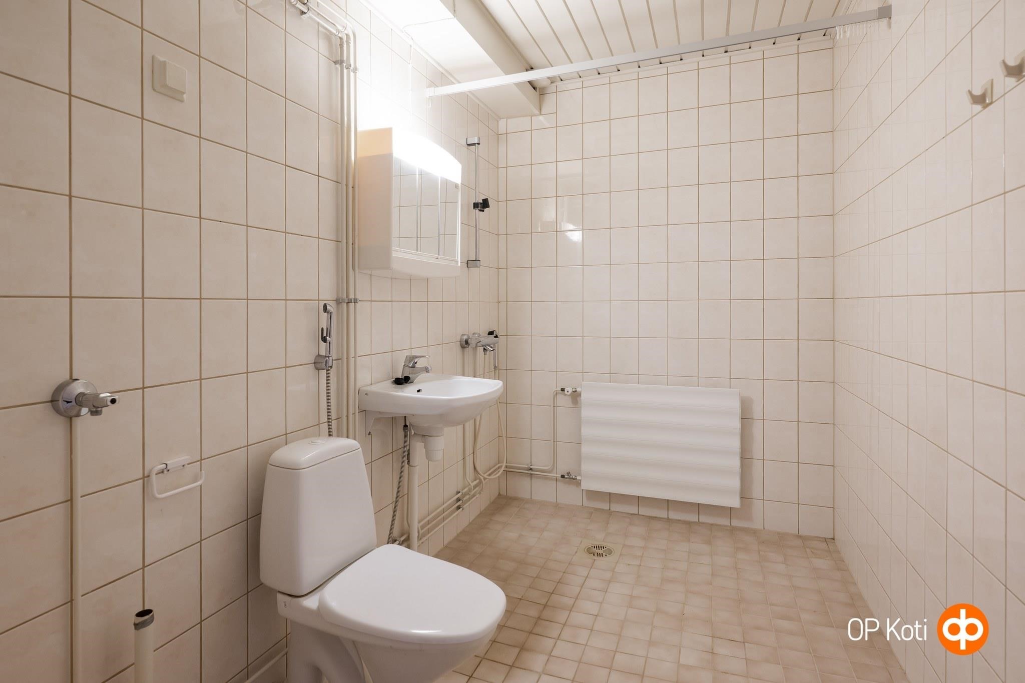 - Kylpyhuone, suihku, peilikaappi, pesukoneliitäntä, kiinteät valaisimet.
