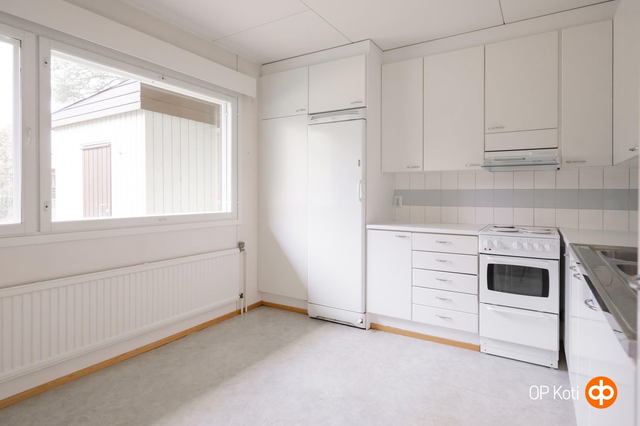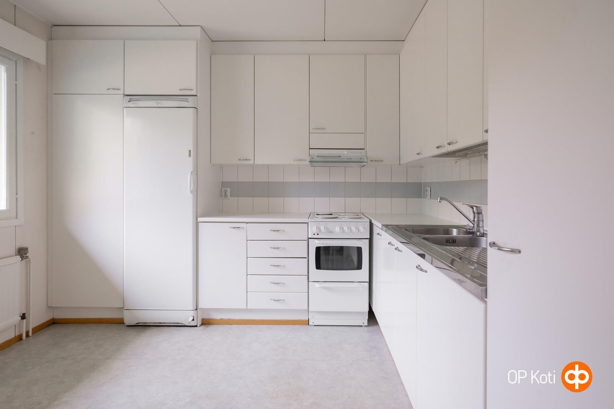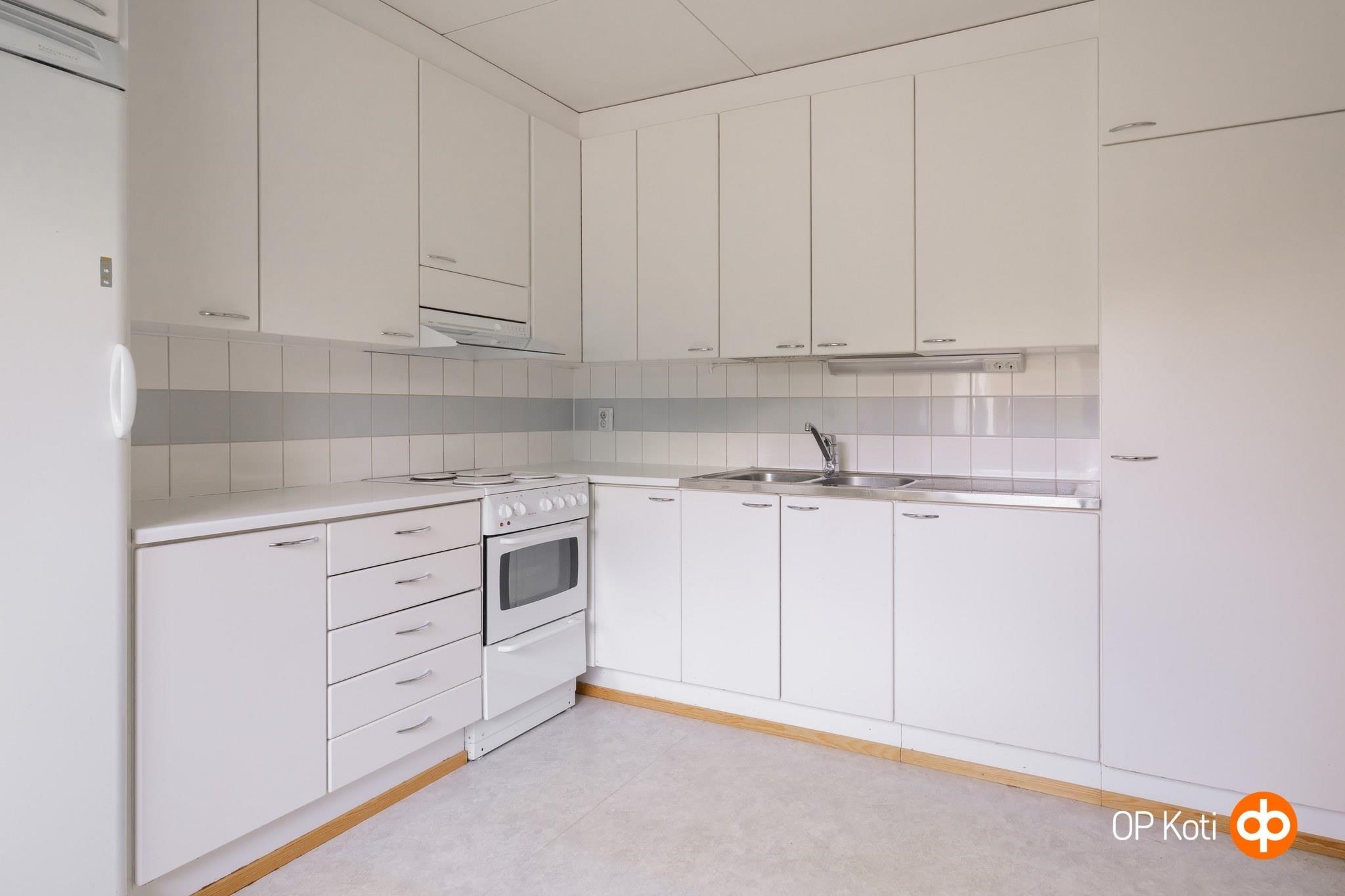 - Jääkaappi, sähköliesi, liesituuletin, kaapistot, kiinteät valaisimet.