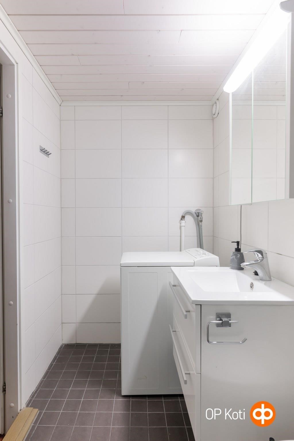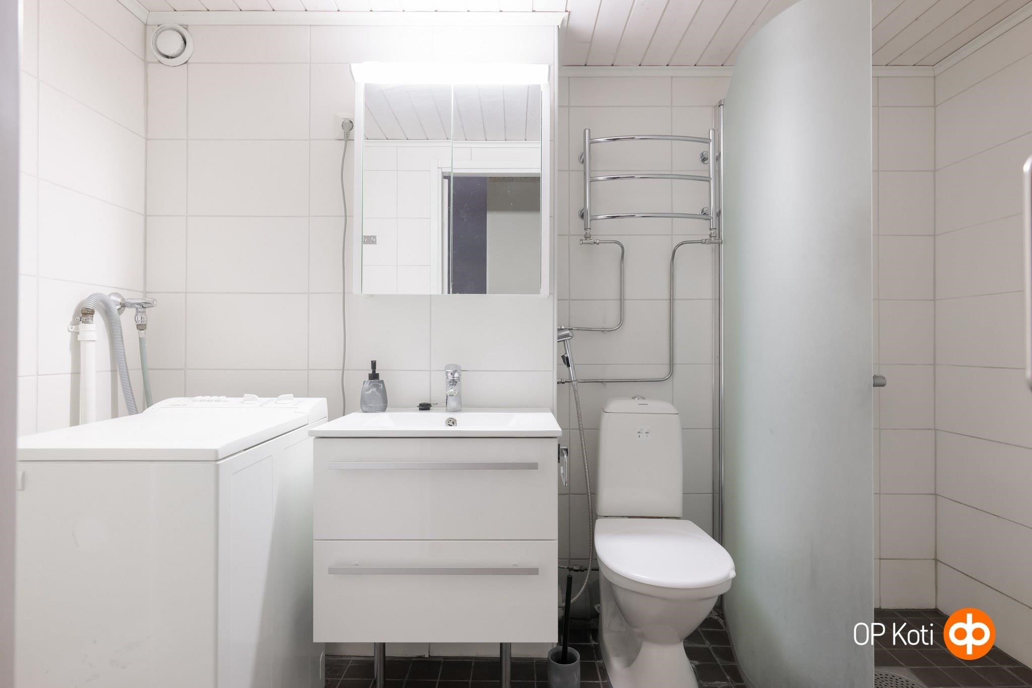 - Kylpyhuone, suihku, suihkuseinä, peilikaappi, allaskaappi, pesukoneliitäntä, kiinteät valaisimet.
