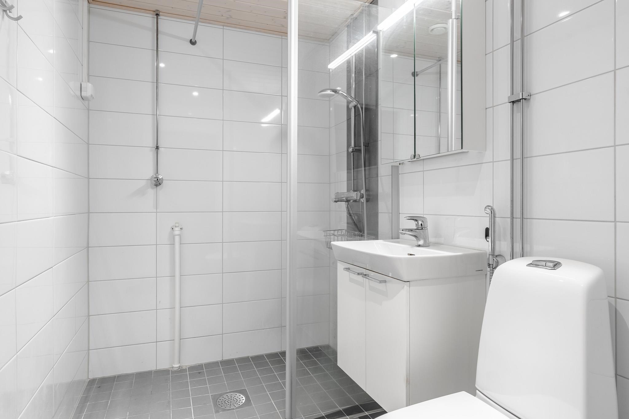 - Kylpyhuone, suihkuseinä, peilikaappi, allaskaappi, pesukoneliitäntä, lattialämmitys, kiinteät valaisimet.
