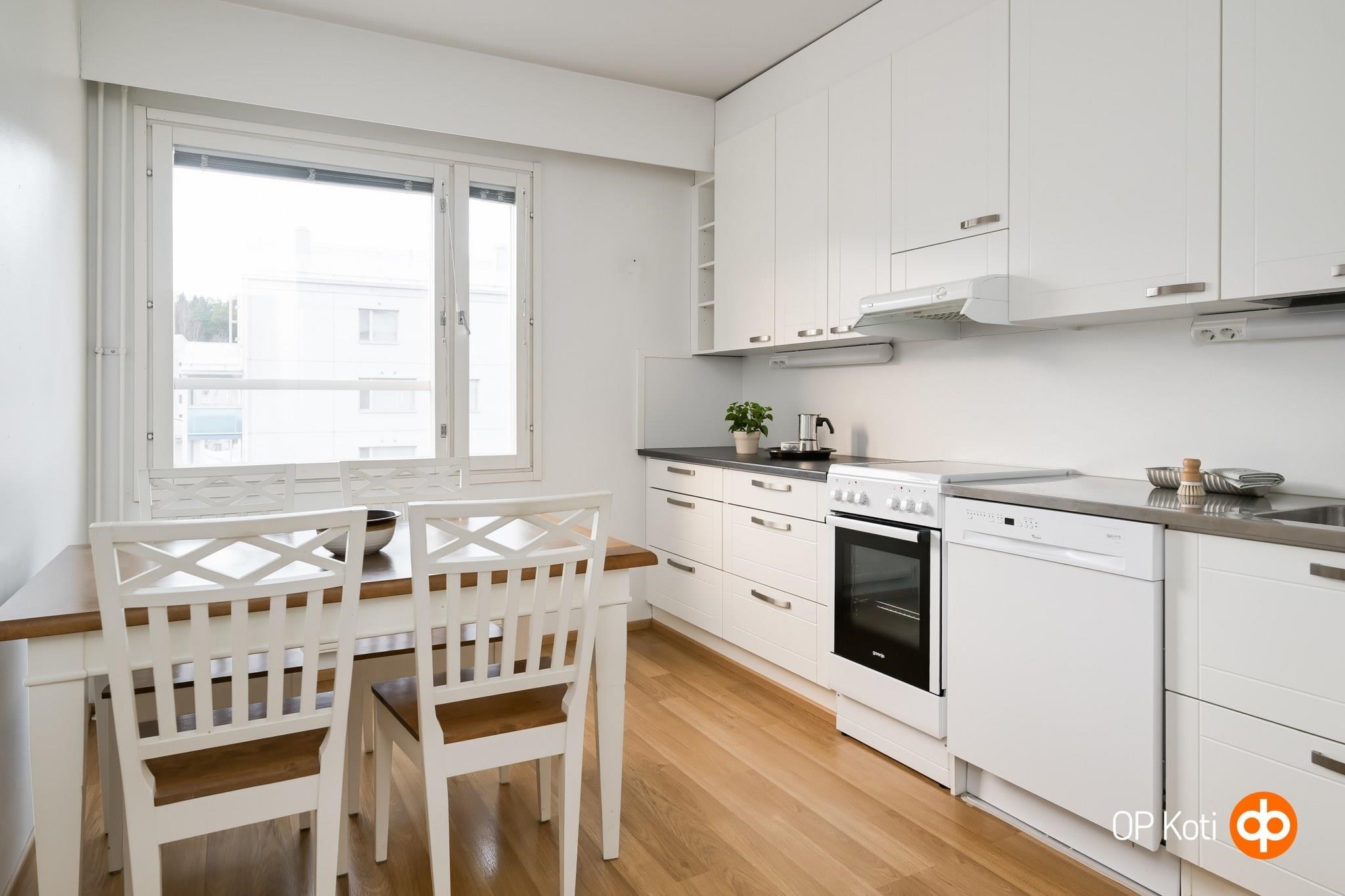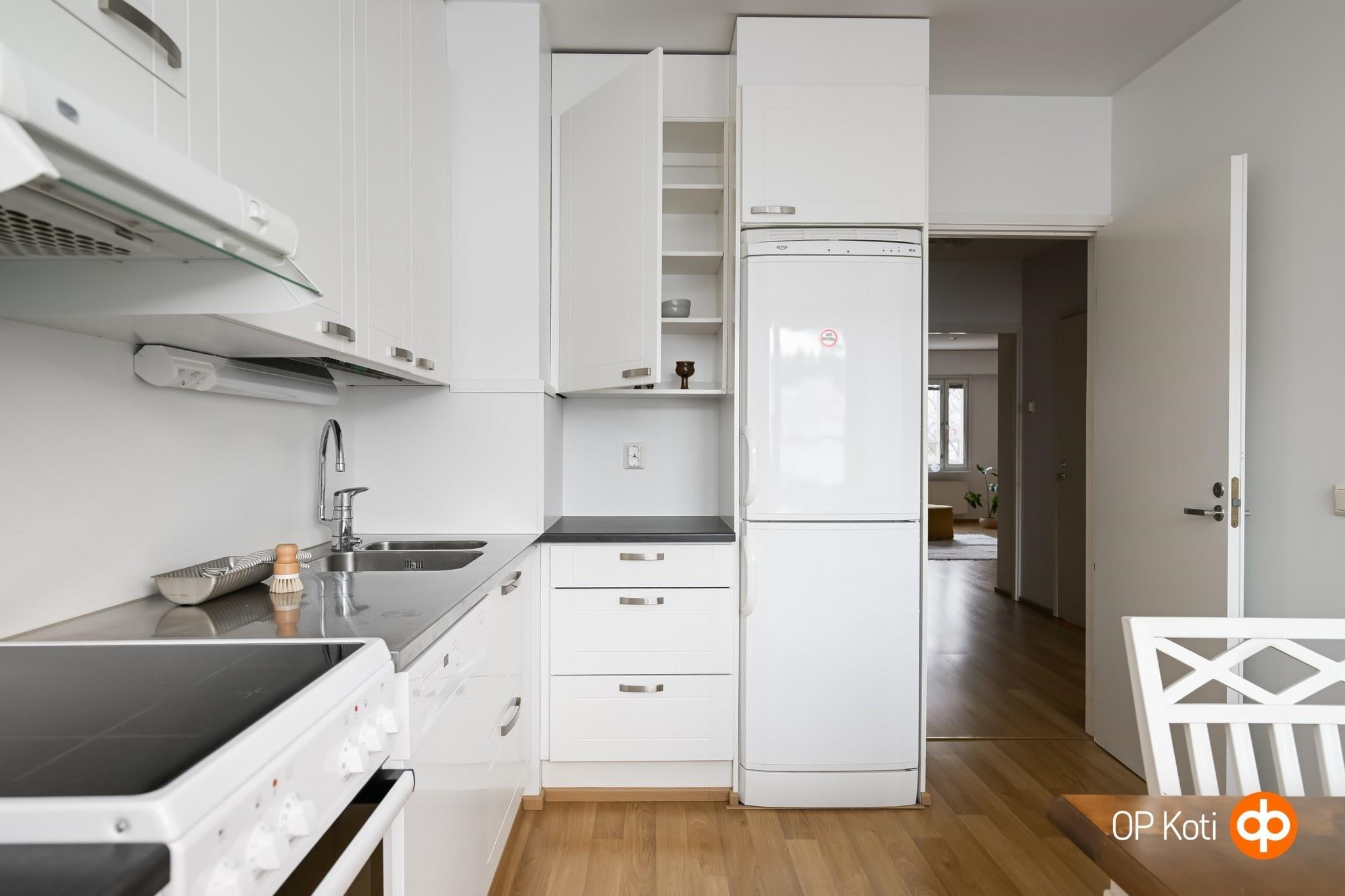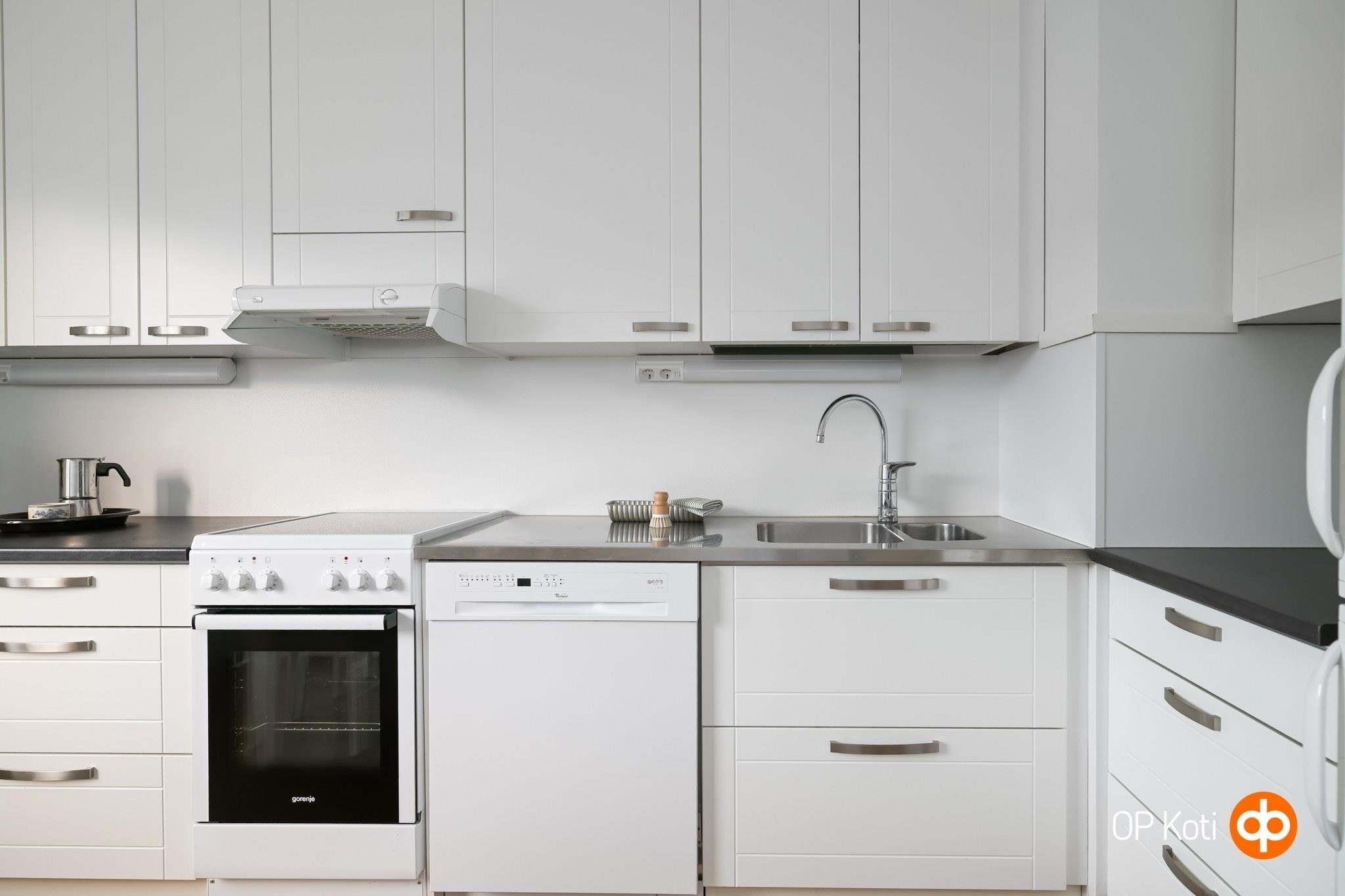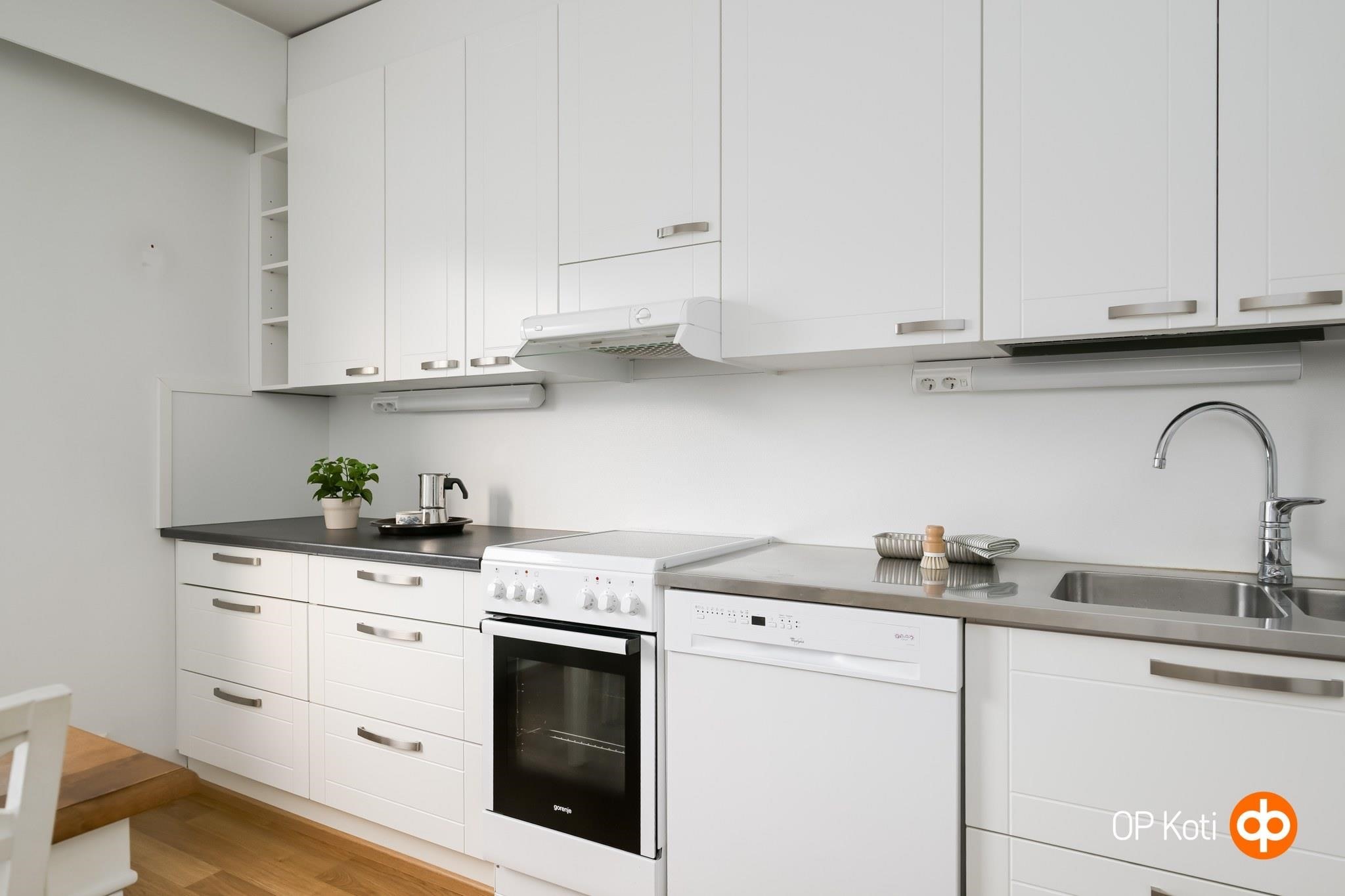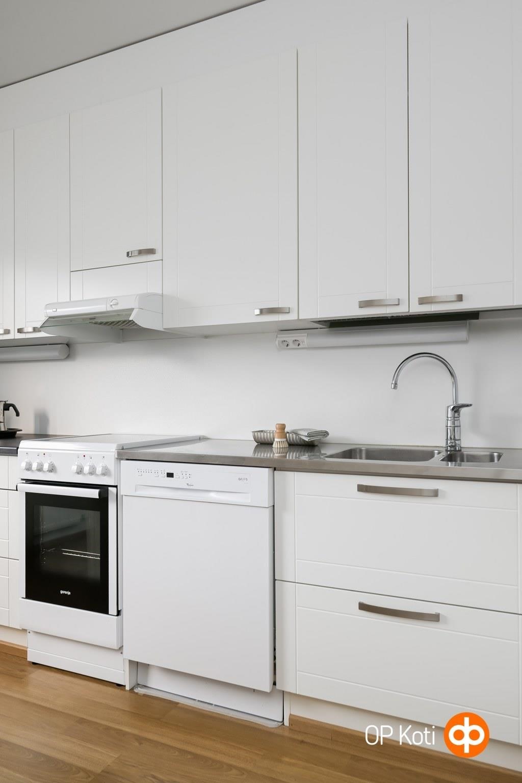 - Jääkaappipakastin, lattialiesi, sähköliesi, liesituuletin, astianpesukone, kaapistot, kiinteät valaisimet.