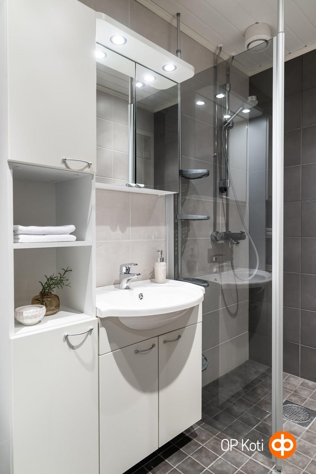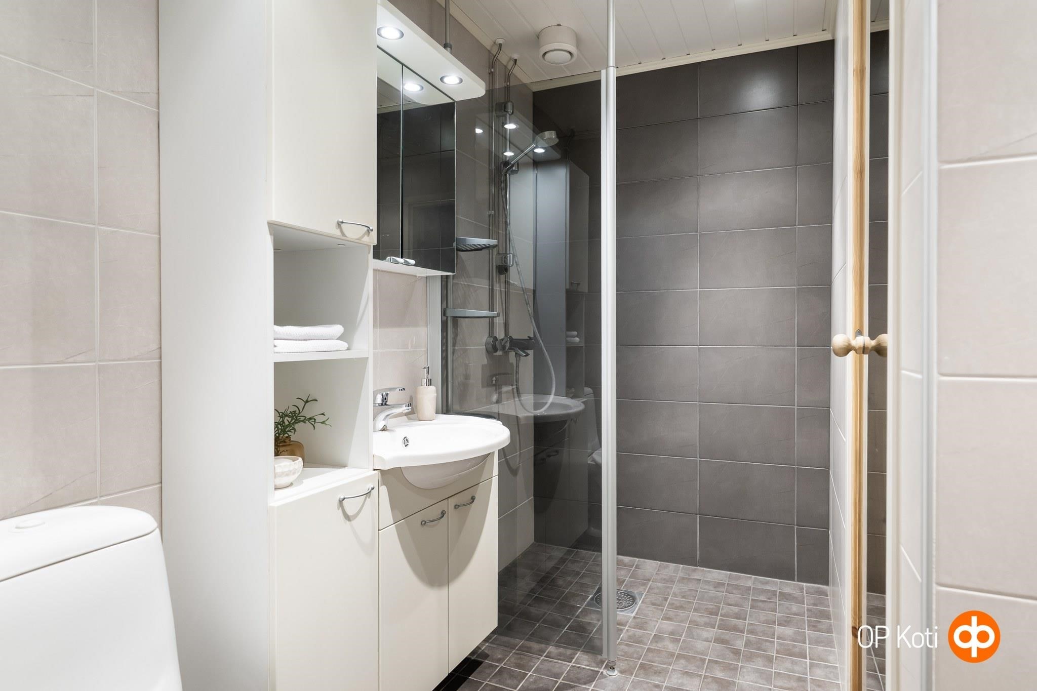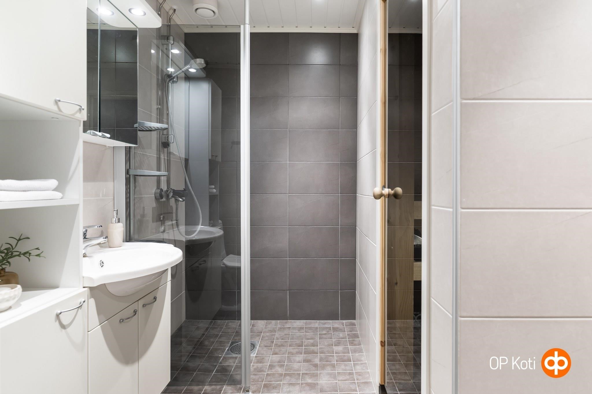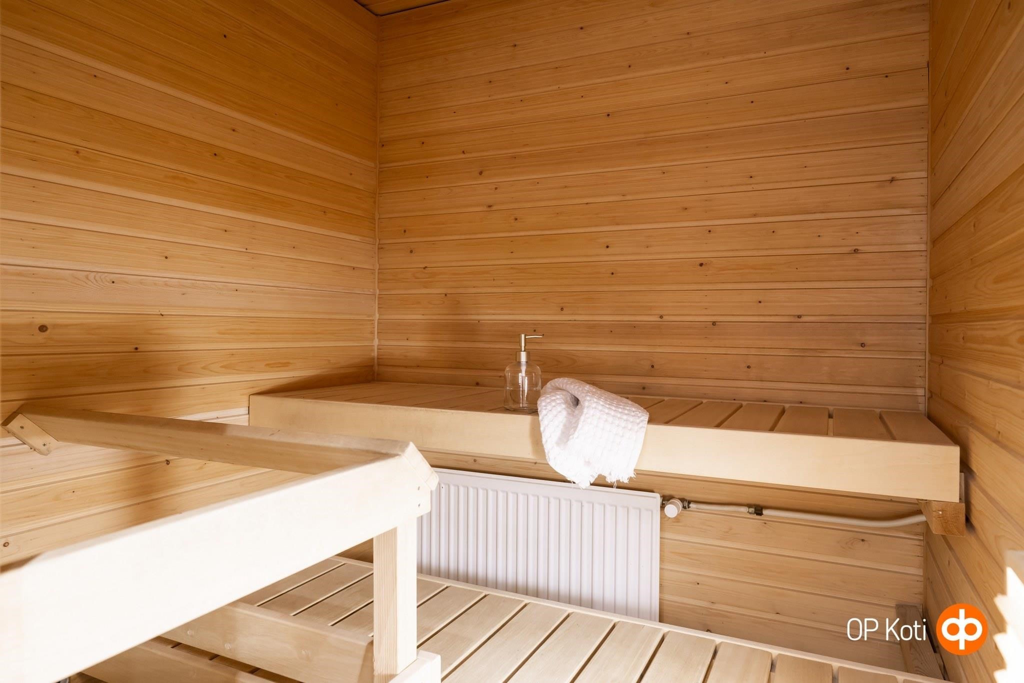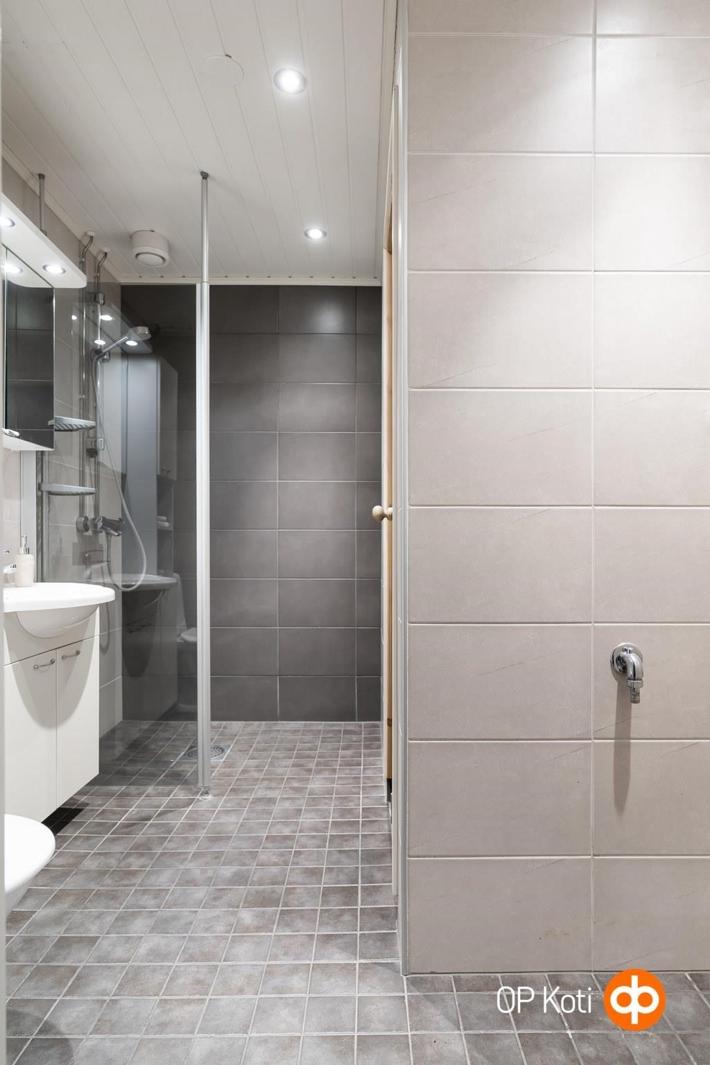 - Sauna, sähkökiuas, kylpyhuone, suihku, suihkuseinä, peilikaappi, allaskaappi, pesukoneliitäntä, kiinteät valaisimet.