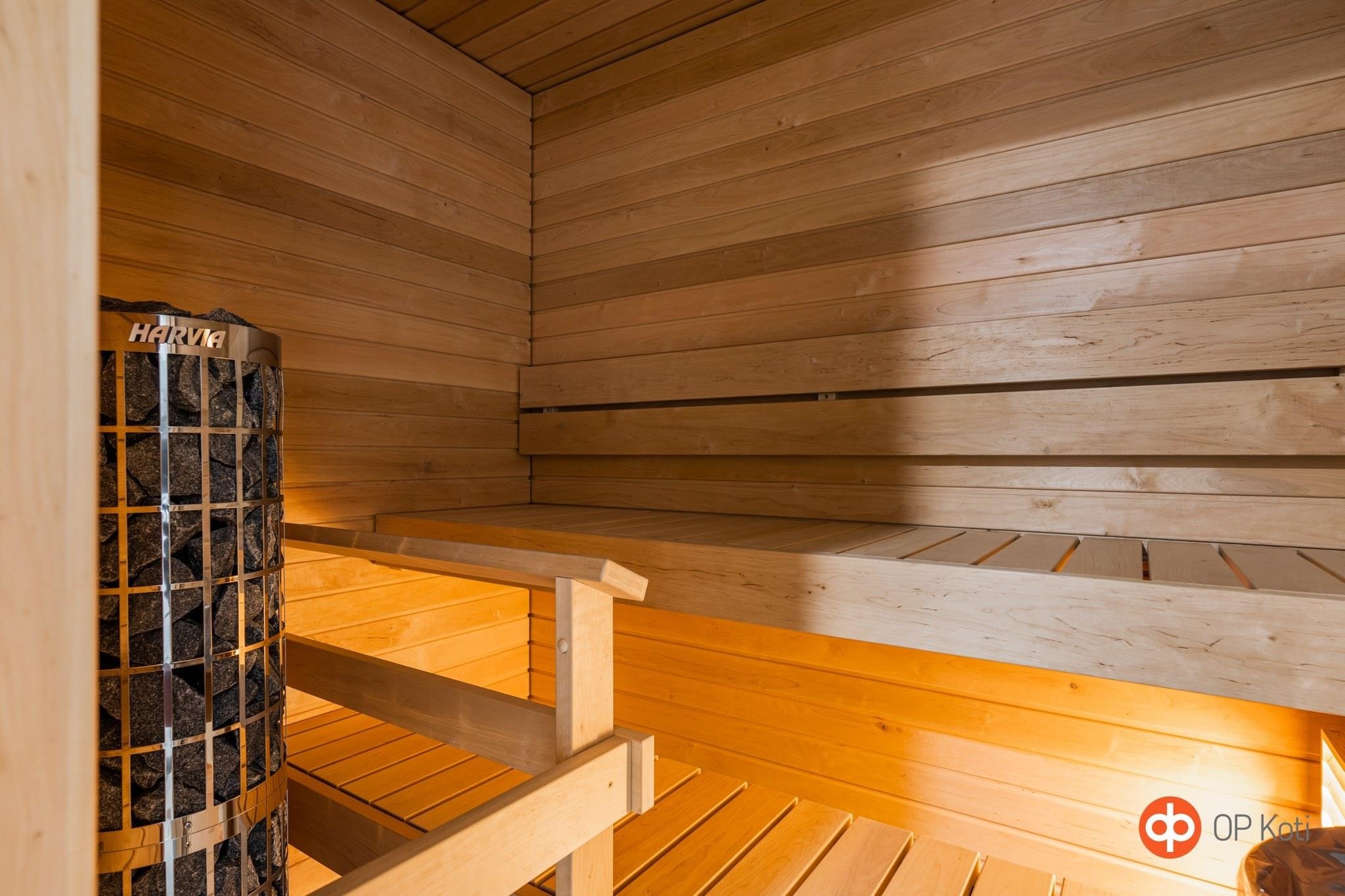 - Sauna, sähkökiuas, erillinen wc, suihku, peilikaappi, allaskaappi, pesukoneliitäntä, lattialämmitys.
