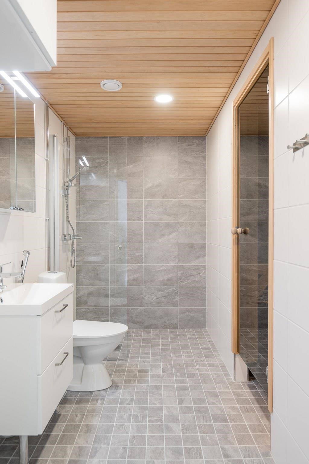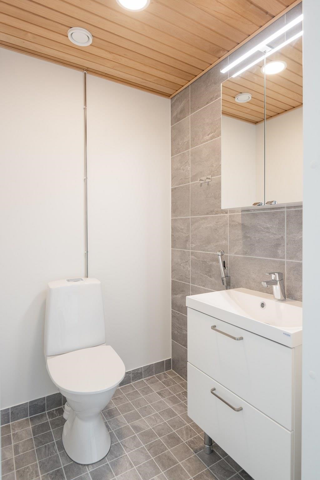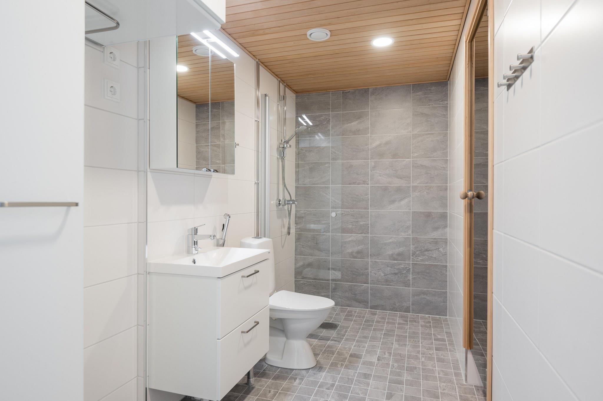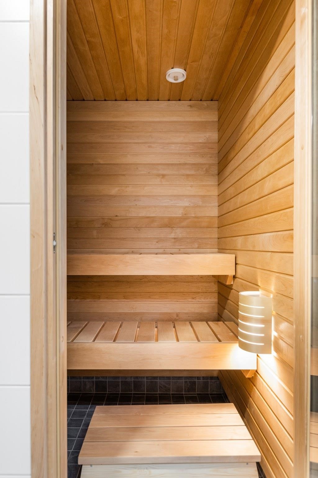 - Sauna, sähkökiuas, peilikaappi, allaskaappi, pesukoneliitäntä, lattialämmitys.