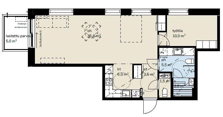 - Rakennuksessa on koneellinen, huoneistokohtainen lämmön talteenotolla varustettu tulo- ja poistoilmanvaihto.