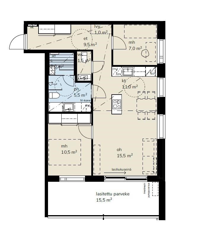 - Rakennuksessa on koneellinen, huoneistokohtainen lämmön talteenotolla varustettu tulo- ja poistoilmanvaihto.