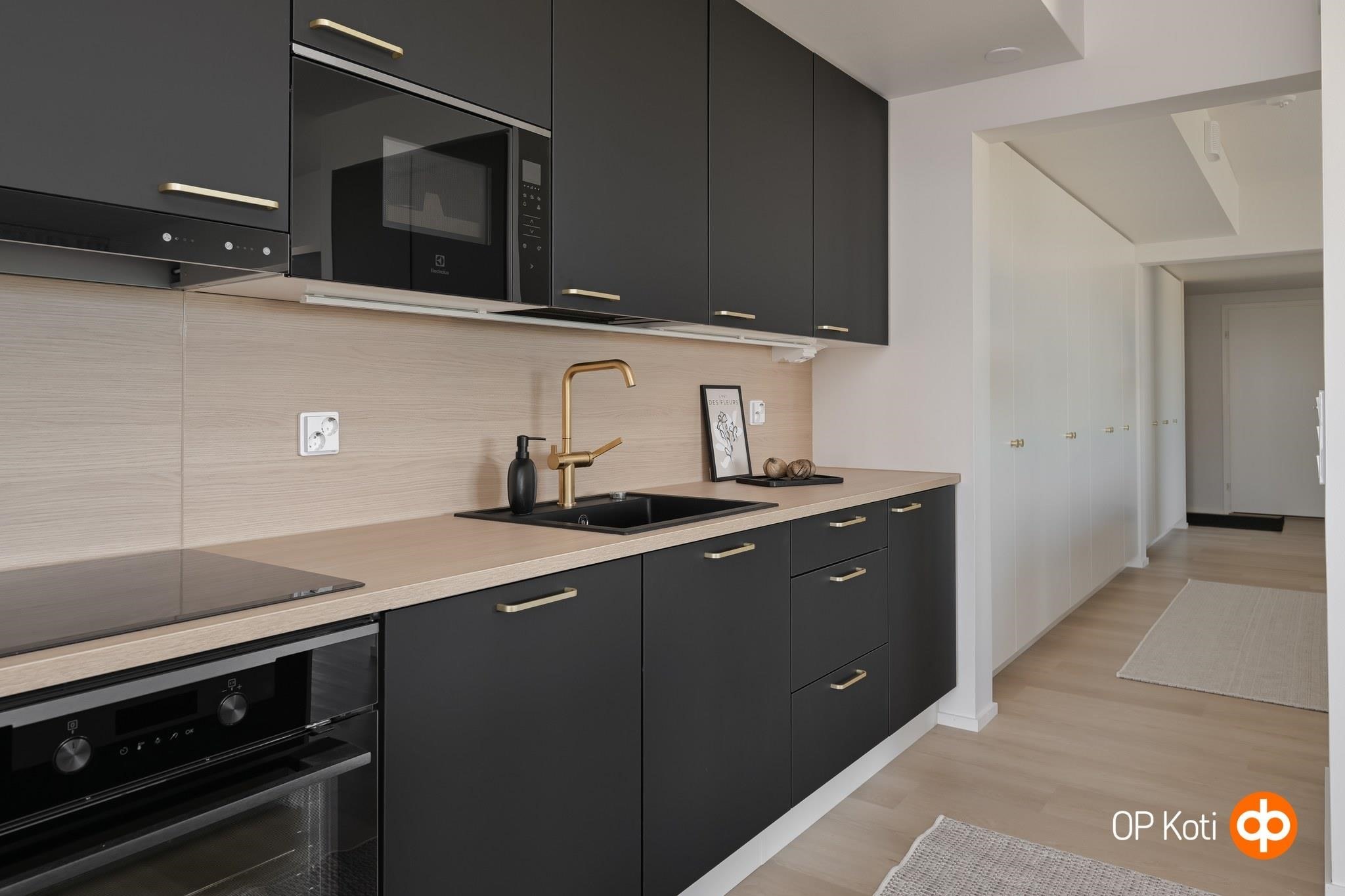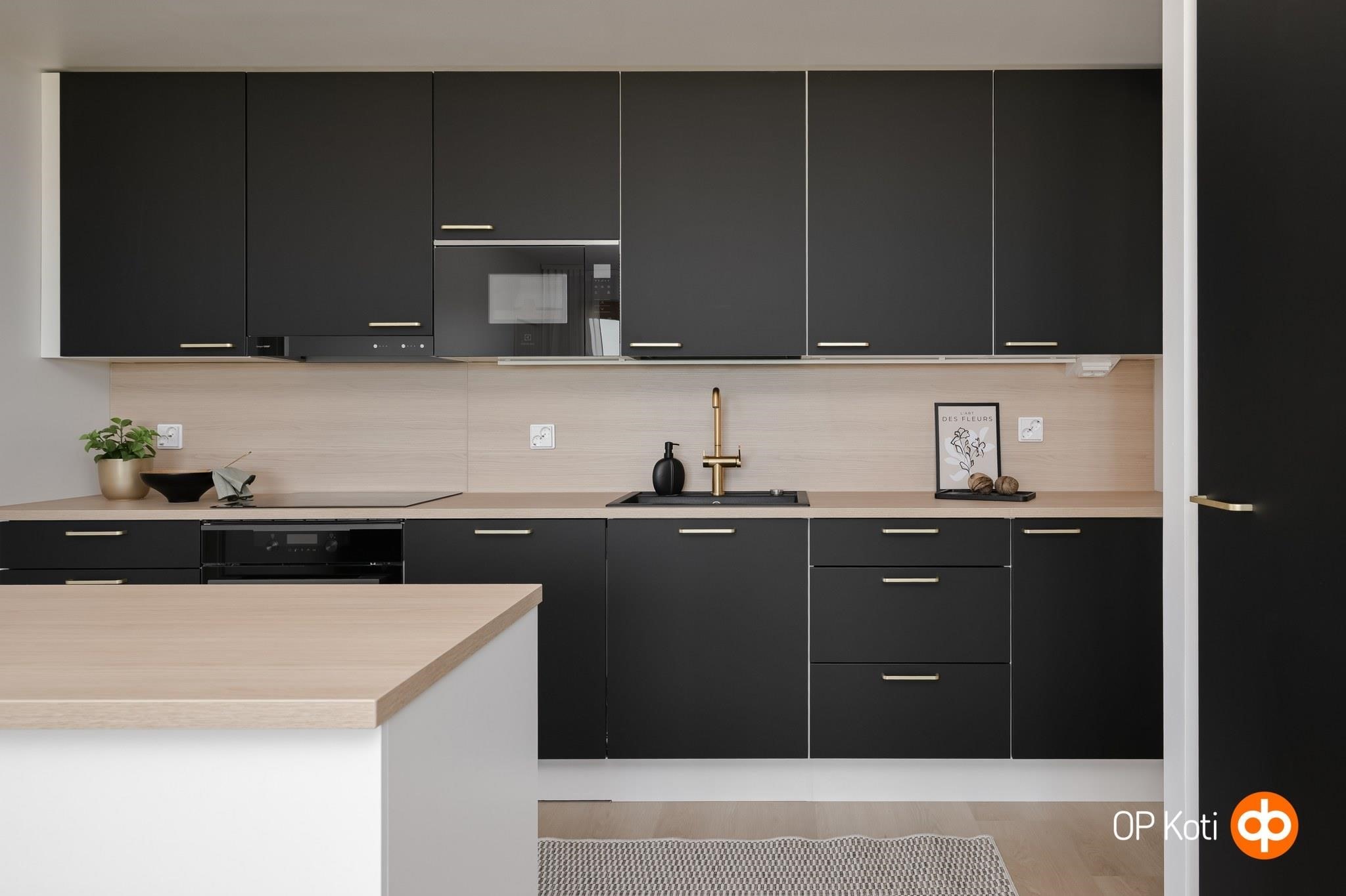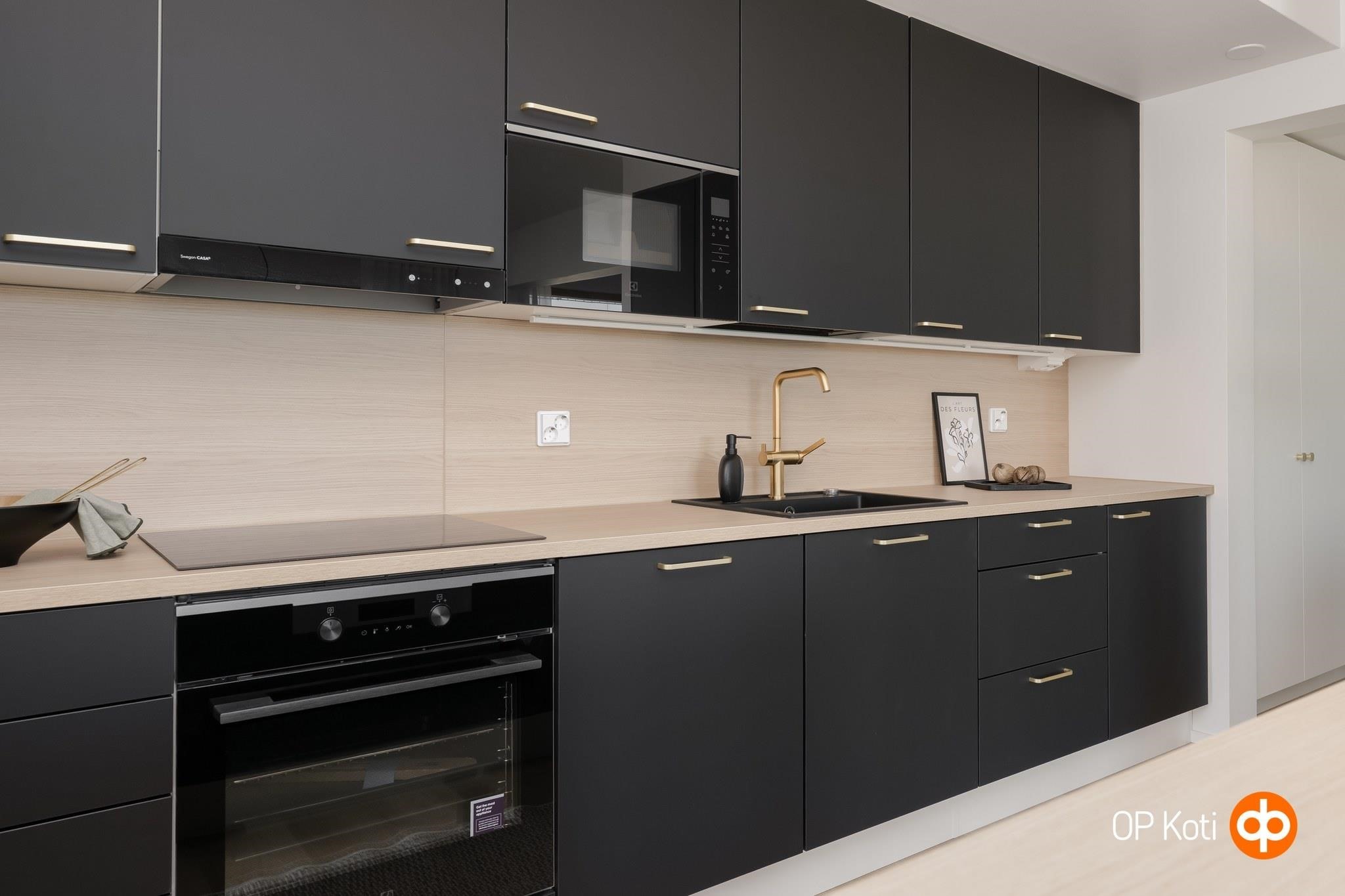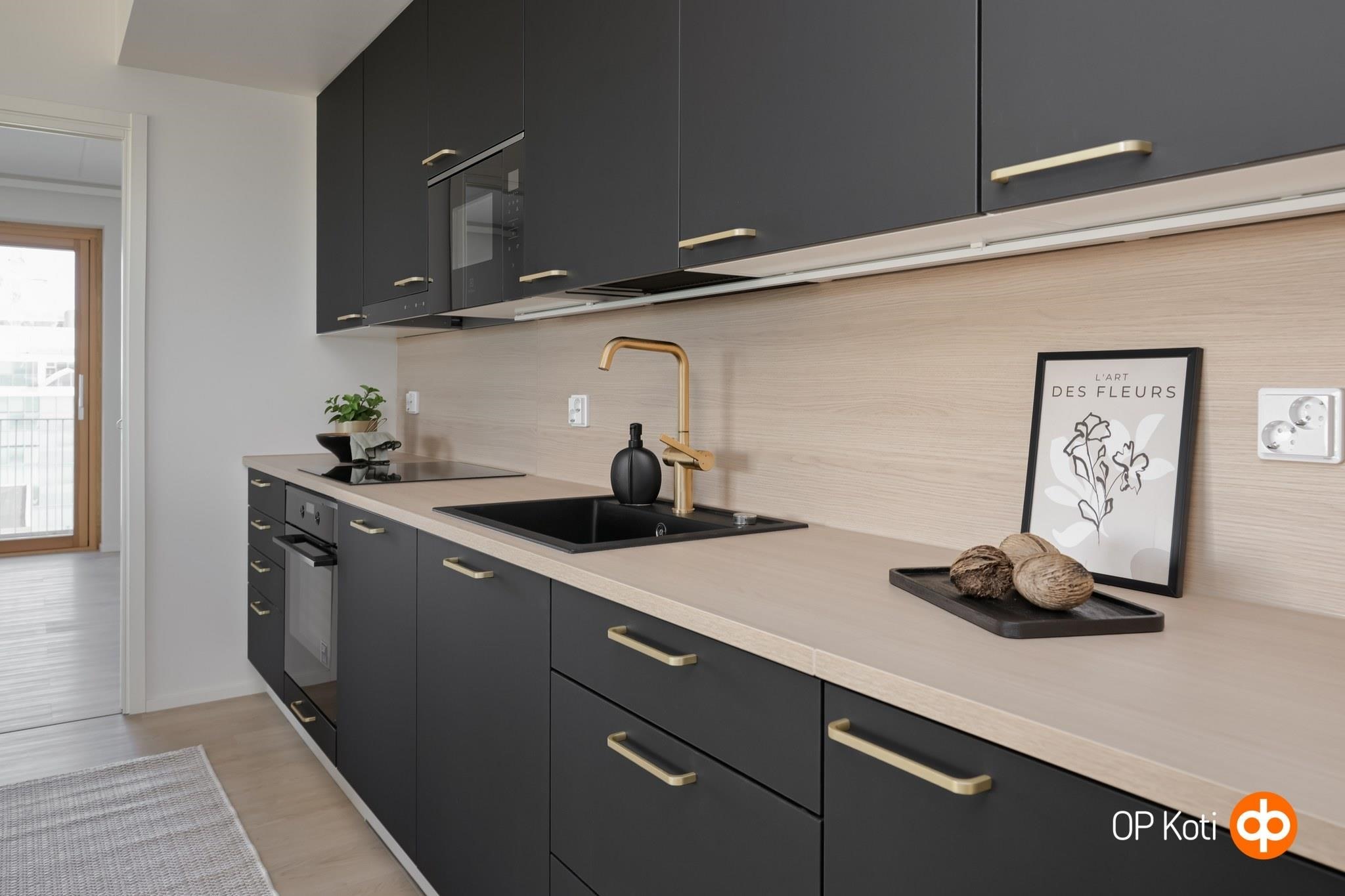 - Jääkaappipakastin, erillisuuni, liesitaso, astianpesukone. Välitilassa laminaattipintainen levy ja LED-nauhavalaisin.