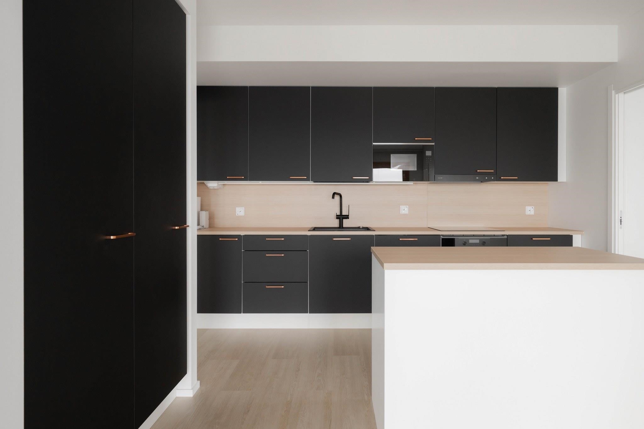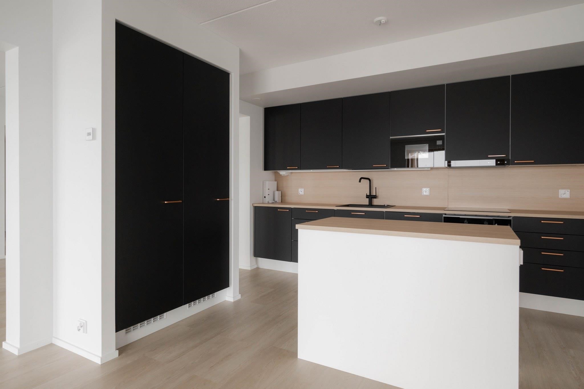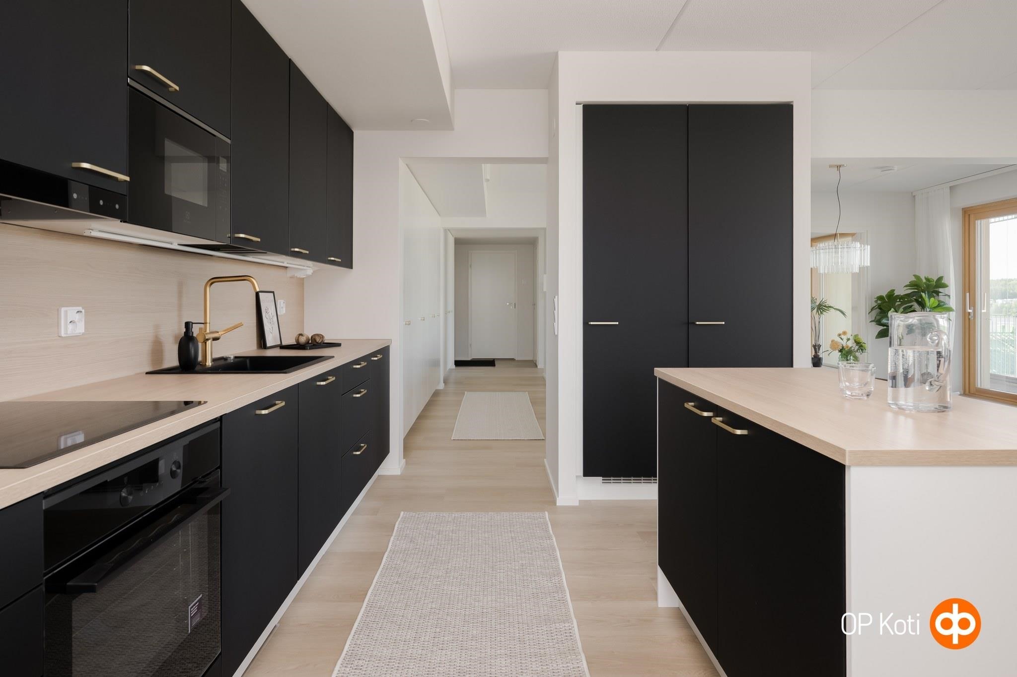 - Jääkaappipakastin, erillisuuni, liesitaso, astianpesukone. Välitilassa laminaattipintainen levy ja LED-nauhavalaisin.